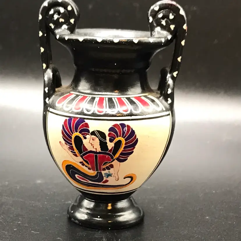 Hand Painted Greek Vase Ceramic Art Pottery Made in Greece. The bottom of the vase has these words…. HAND MADE PAINTED IN GREECE. I cannot read the signature, I am thinking this is the artist’s name.