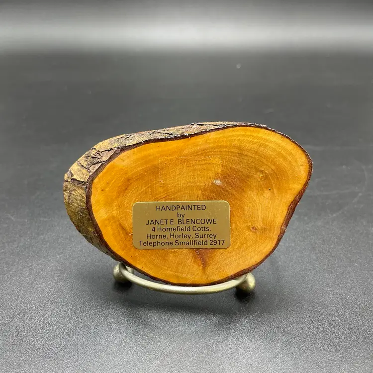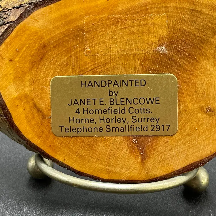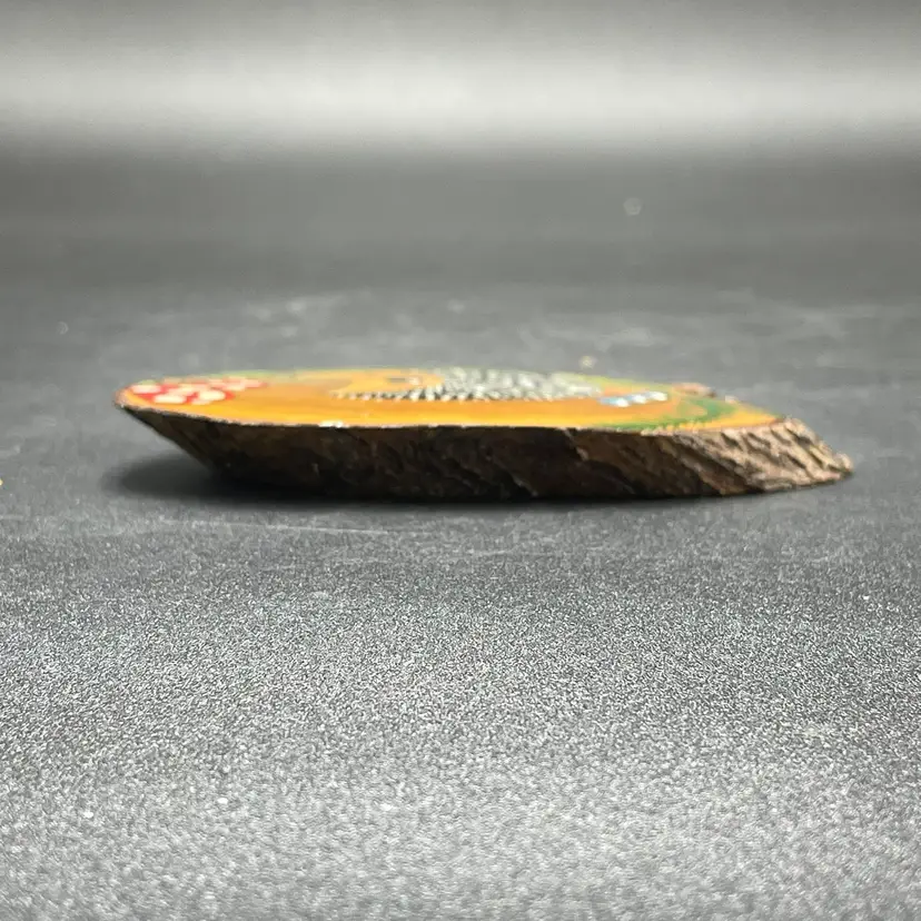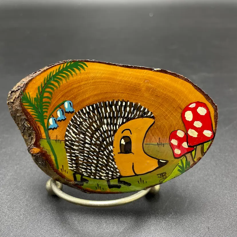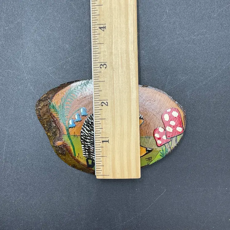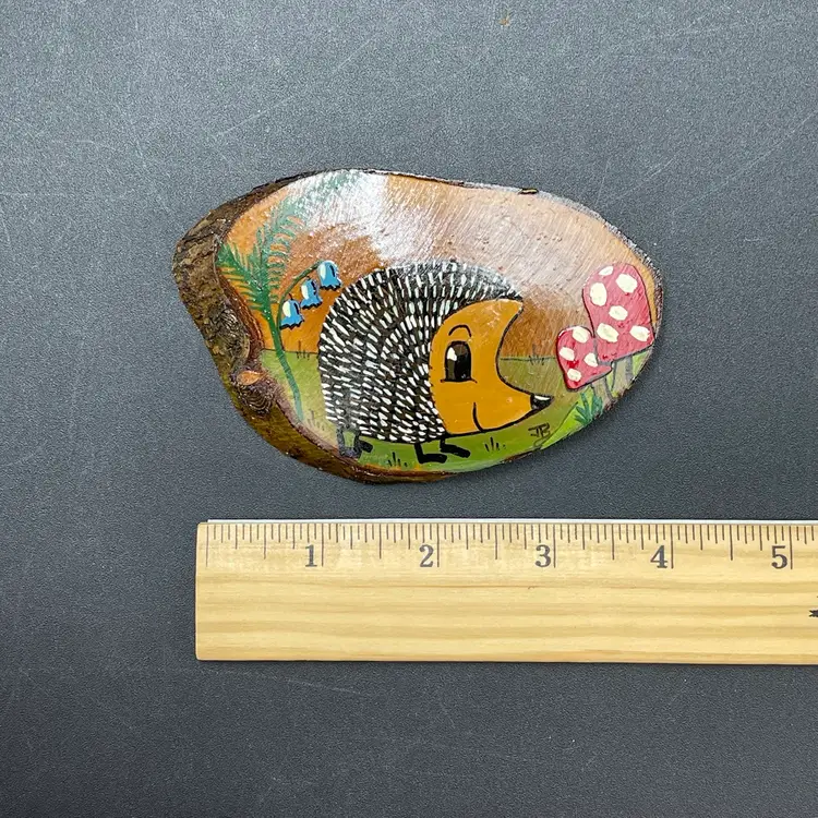 This is a hand painted on wood hedgehog and mushrooms folk art piece. Signed JB. Measures approximately 4" long x 2.5" wide. No major flaws. Stand not included.