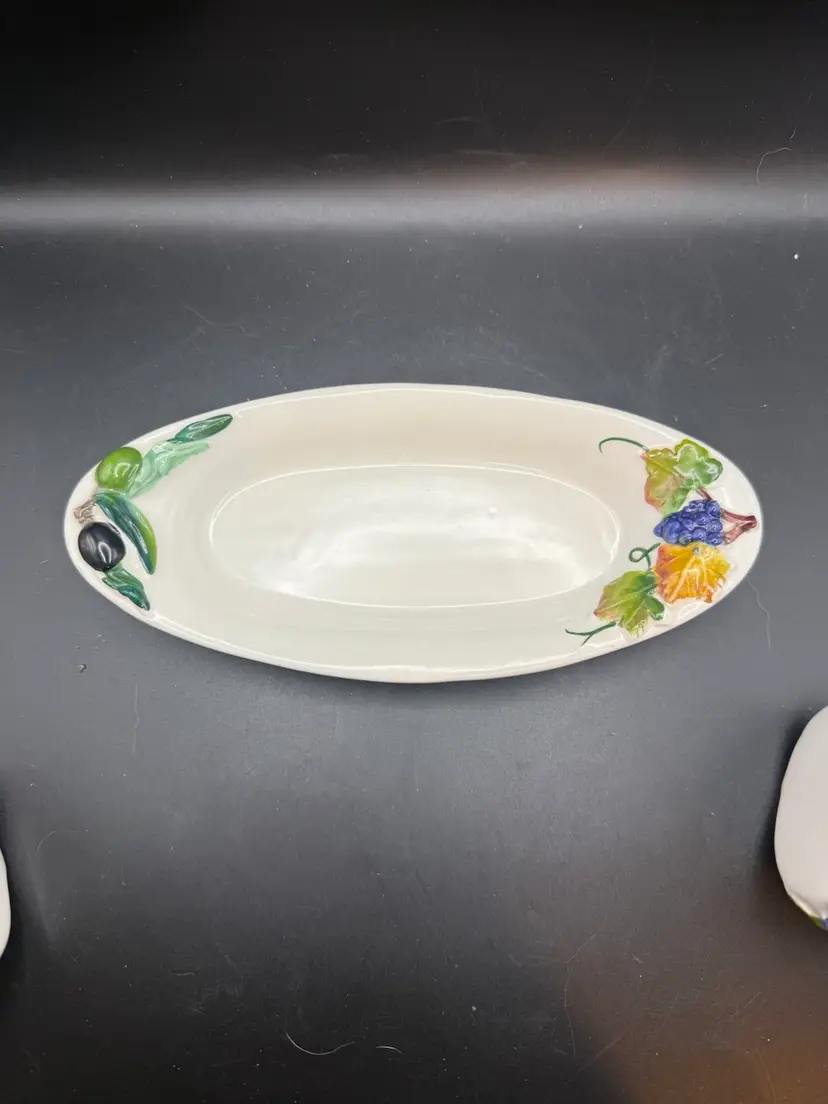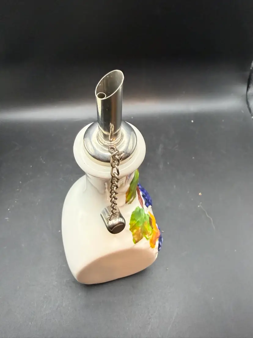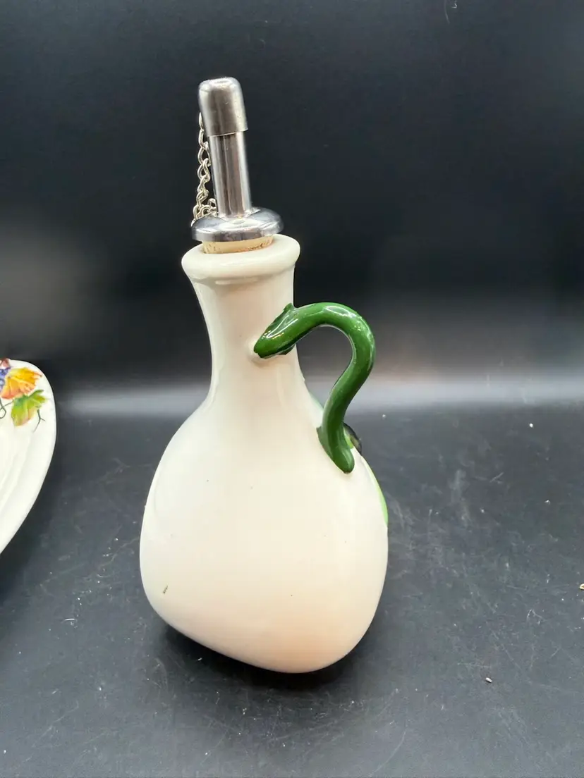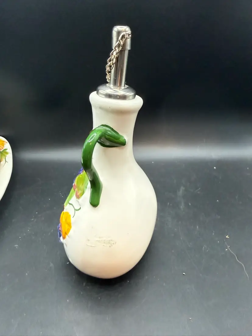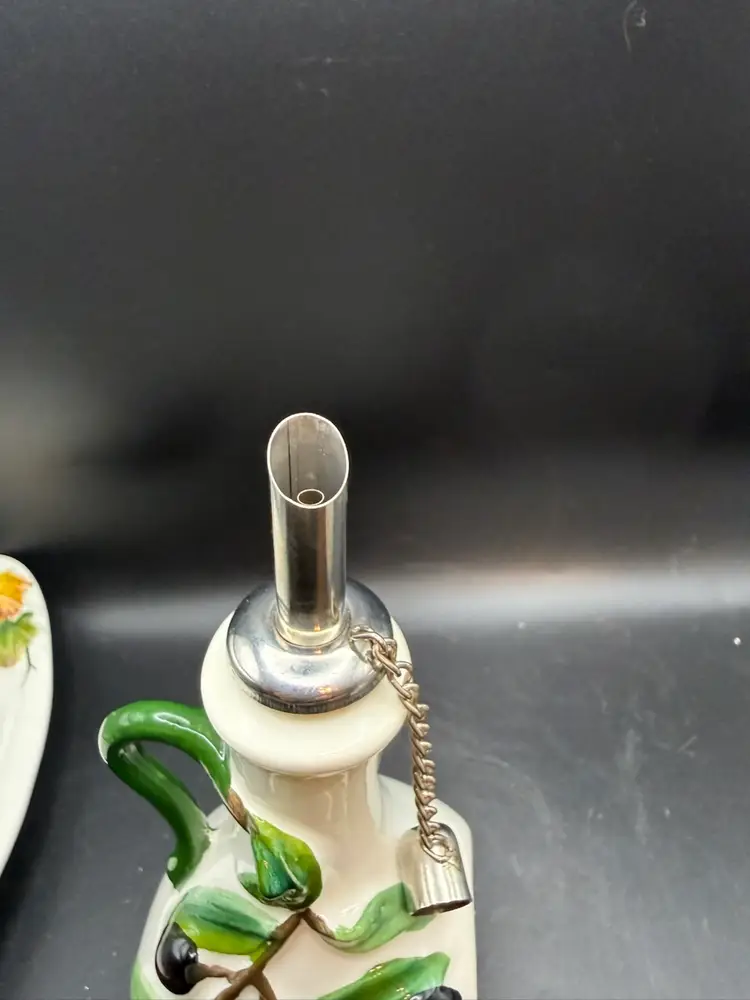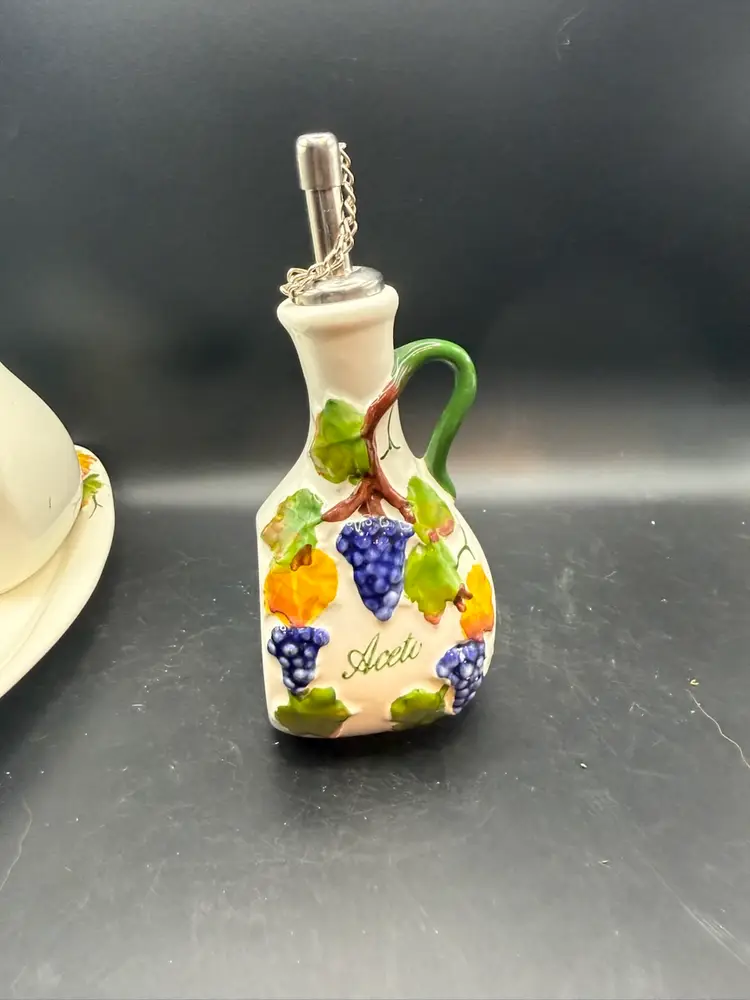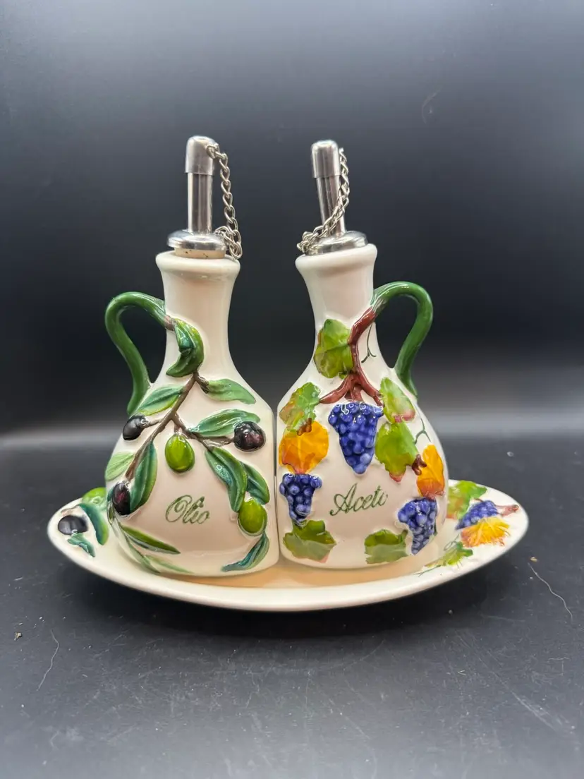 The two bottles serve as dispensers for oil and vinegar. The Italian words "Olio" (oil) and "Aceti" (vinegar) are painted on the front of the respective cruets. The set features a hand-painted design with branches of green olives on the "Olio" bottle and bunches of grapes on the "Aceti" bottle. This specific set includes two cruets with stainless steel spouts and a matching serving tray. Items like this are handmade and hand-painted in Italy, often featuring a glossy finish and a vibrant, Tuscan-inspired aesthetic.