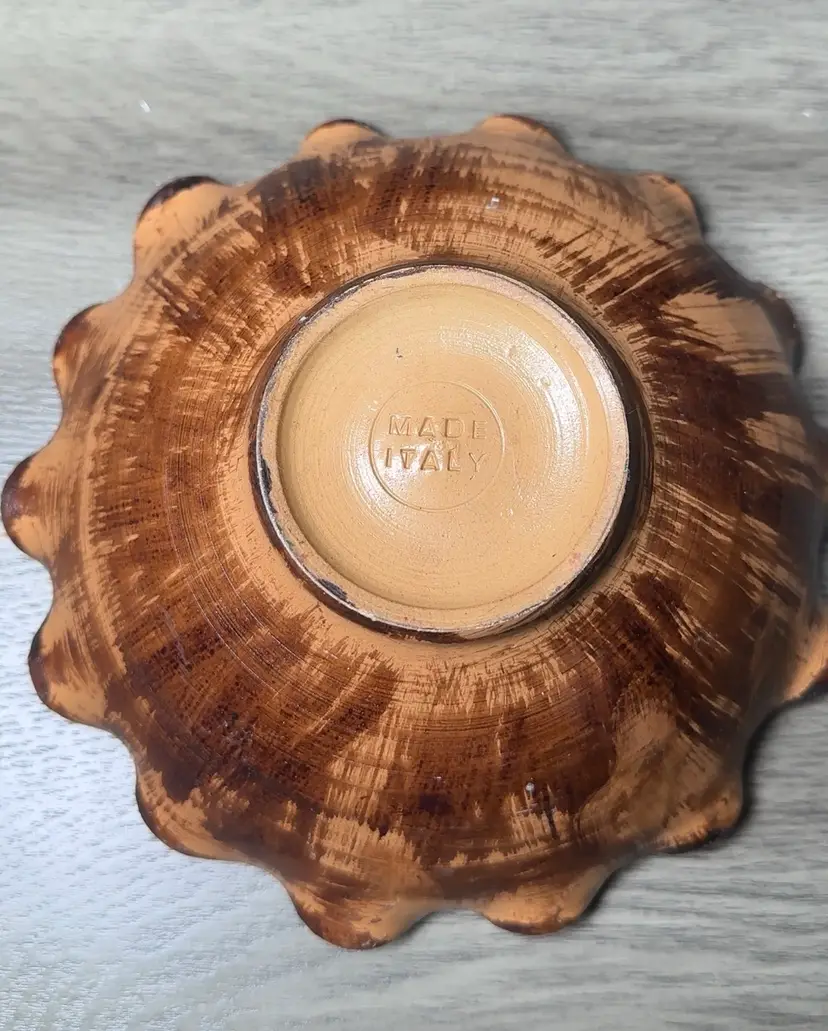 This hand-painted Italian wooden bowl features a glazed finish and a scalloped rim, adorned with a beautiful flower in the center. The round bowl is perfect for all occasions and adds a touch of elegance to any table setting. 6.5” x 3”.