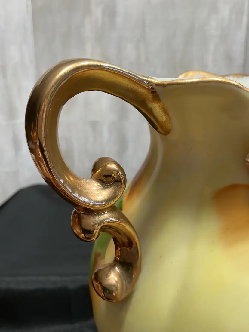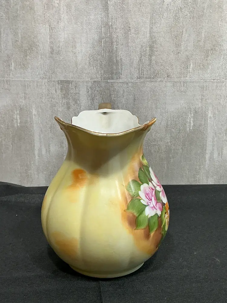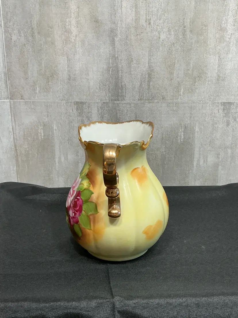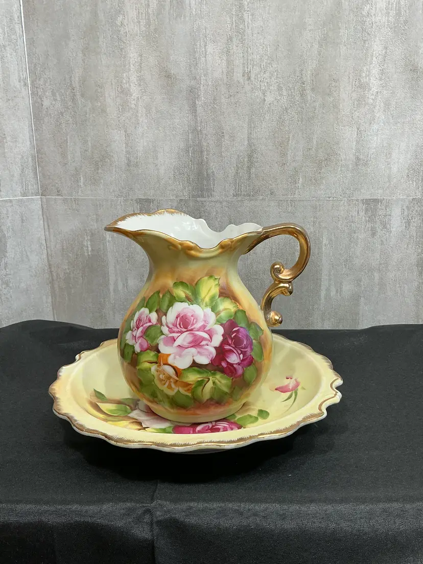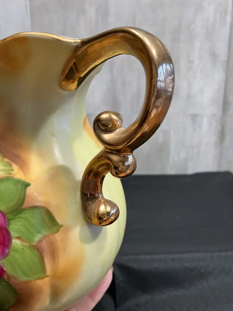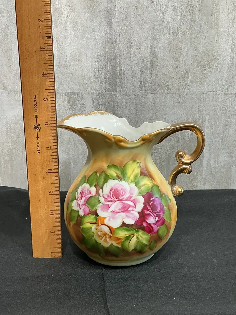 Mid-century porcelain, pitcher and matching hand-painted underplate , painted soft pink cabbage roses and green foliage on a creamy ivory background . Finished with scalloped edges, elegant scroll handle, and all in gold trim. Marked Japan on both pieces.