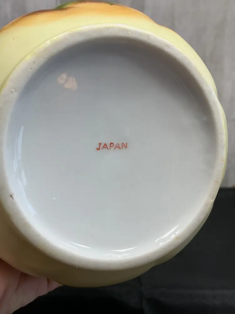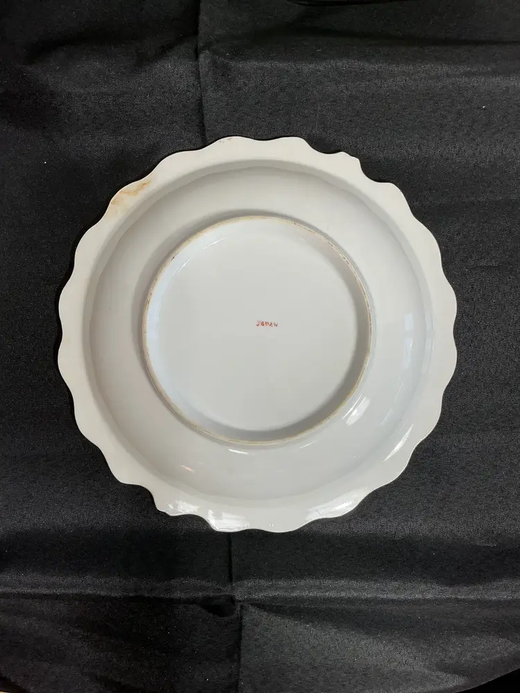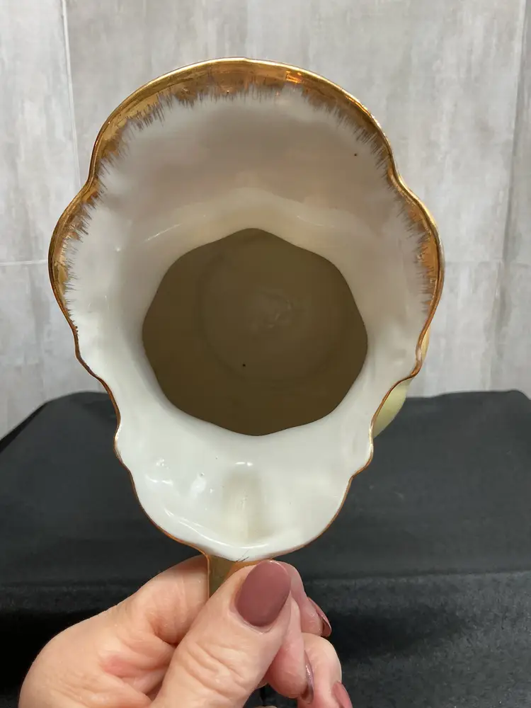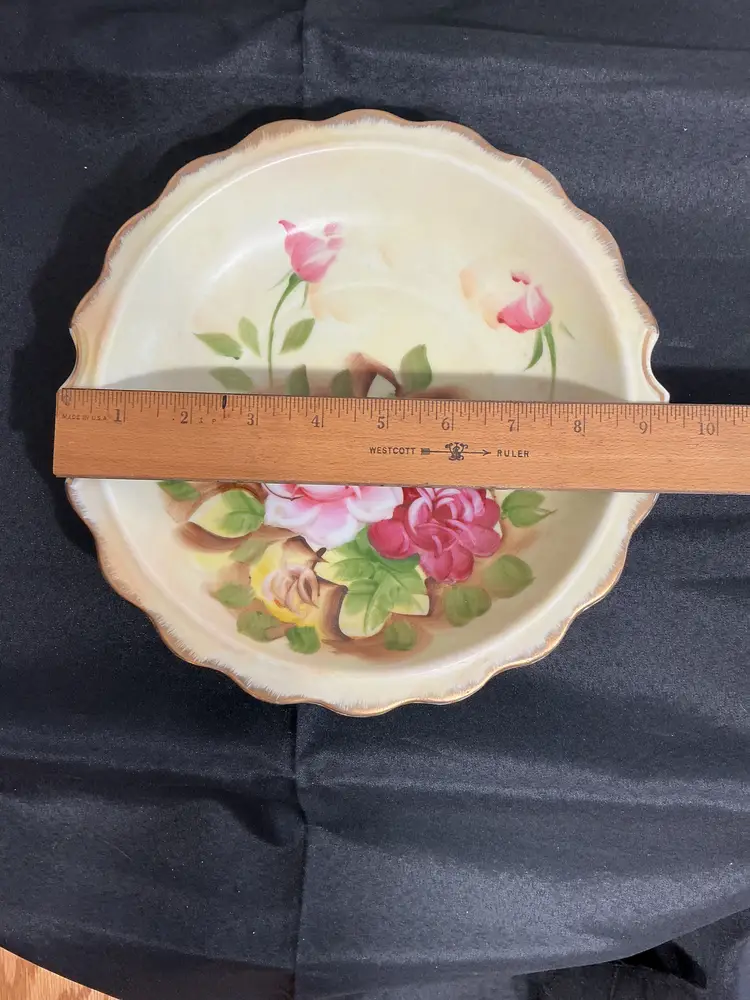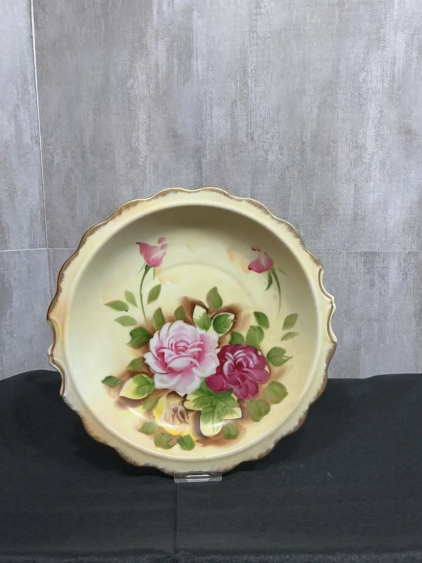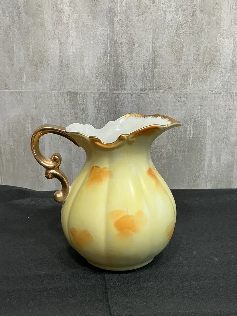 Mid-century porcelain, pitcher and matching hand-painted underplate , painted soft pink cabbage roses and green foliage on a creamy ivory background . Finished with scalloped edges, elegant scroll handle, and all in gold trim. Marked Japan on both pieces.
