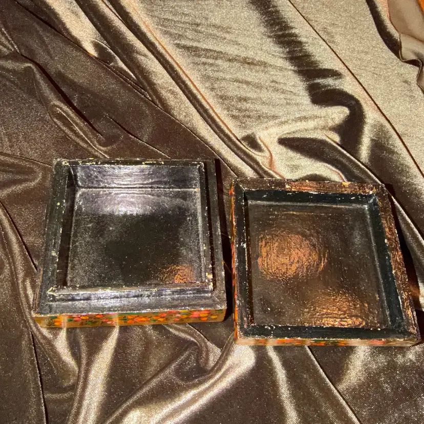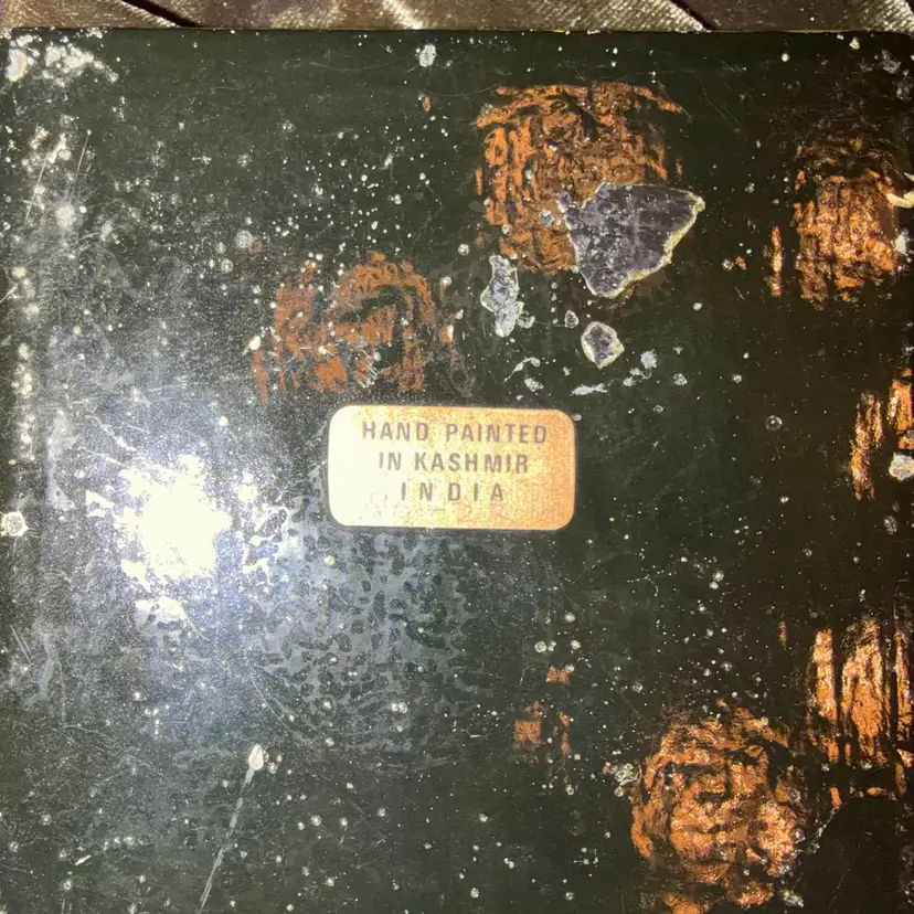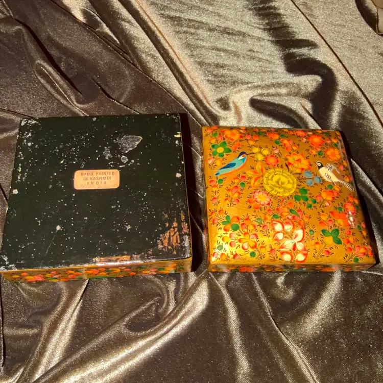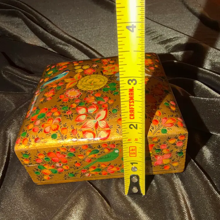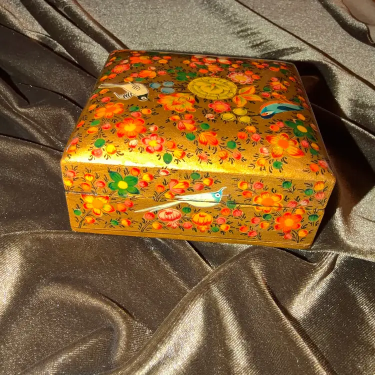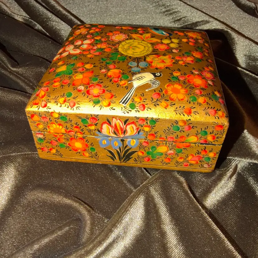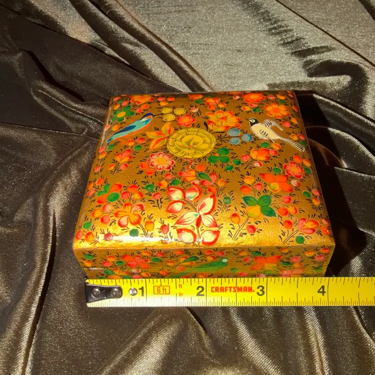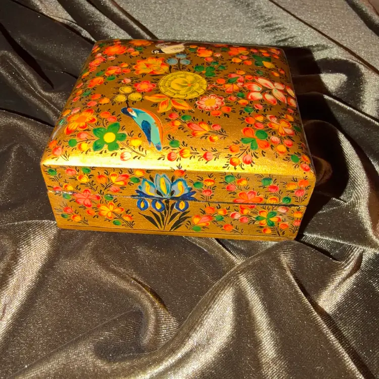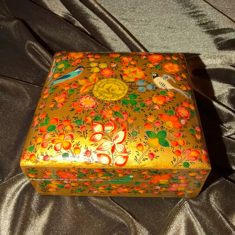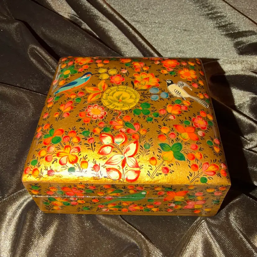 A vibrantly hand-painted papier-mâché box from Kashmir, India, featuring intricate floral patterns and birds on a yellow-orange background, with a black interior.