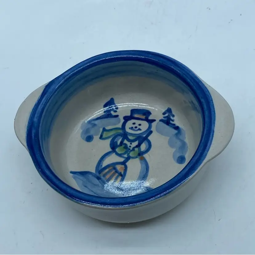 This particular piece, with its snowman decoration, likely falls into the category of seasonal or decorative ware produced by the studio. Such items were popular for their unique artistic appeal and were often made in limited quantities, contributing to their collectible status. The hand-painted nature of each piece ensures that no two are exactly alike, adding to their individual charm and value.