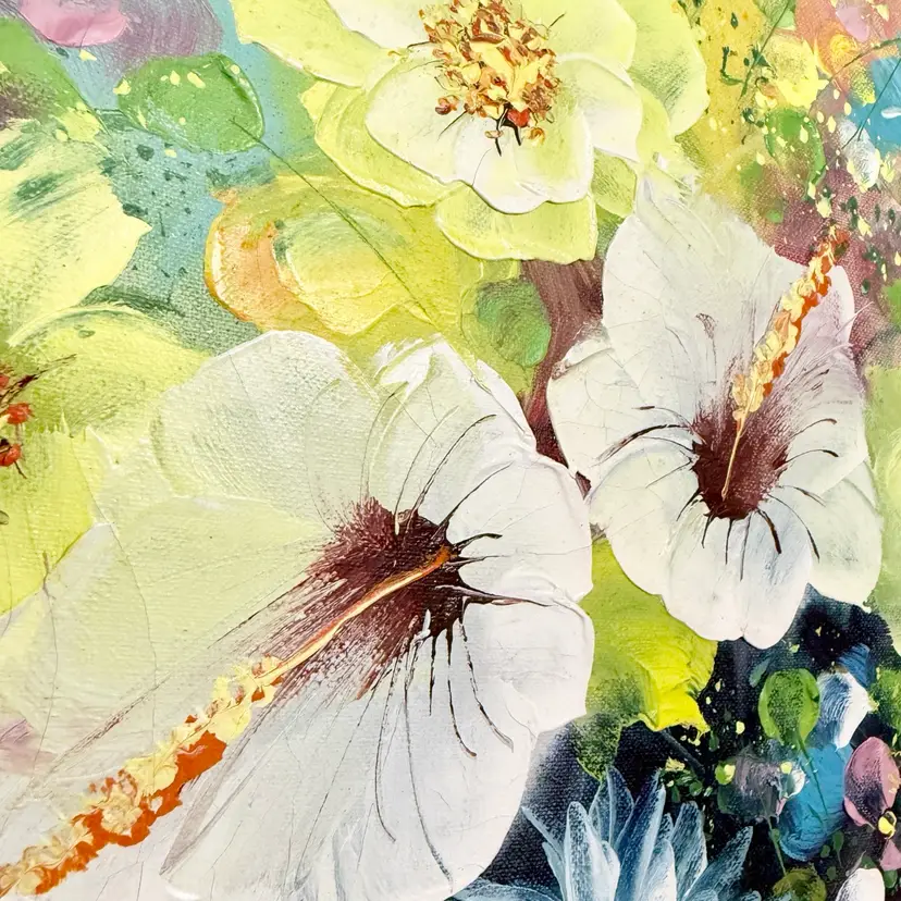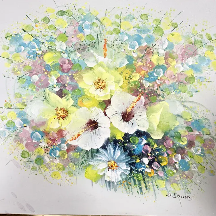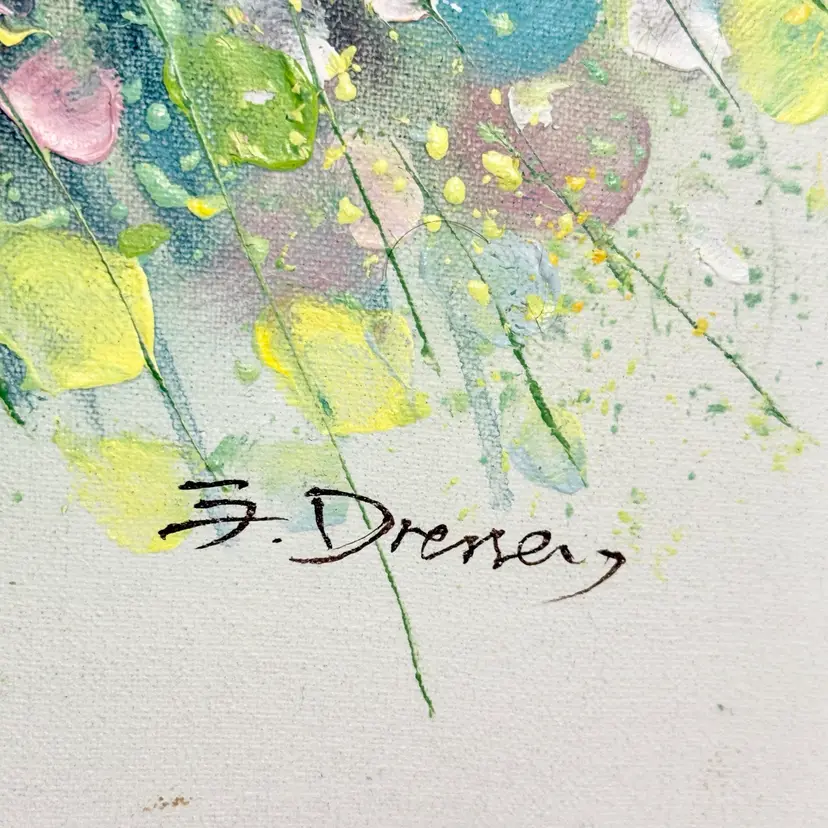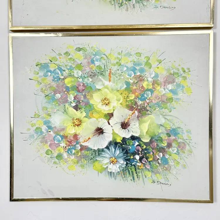 Artist signed G. Dressery. Most likely painted in the early 80s. Metallic gold tone frame has minor surface scratches, no holes or rips or smells.