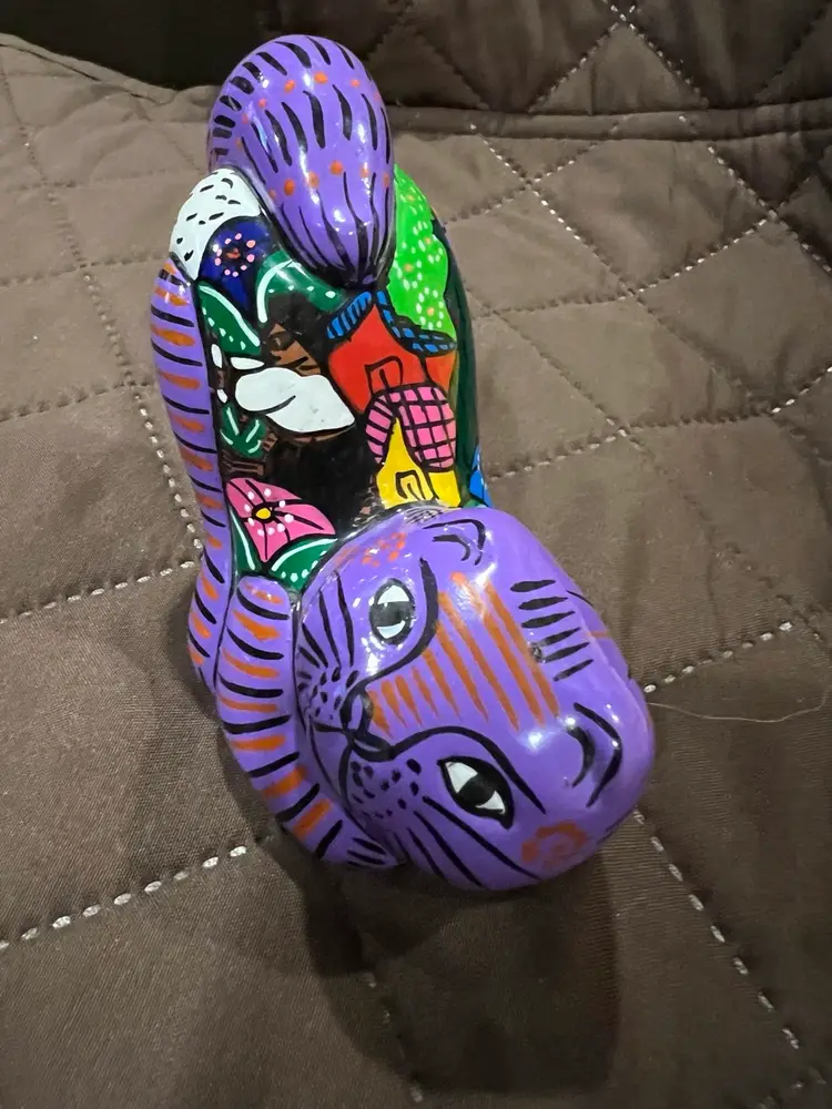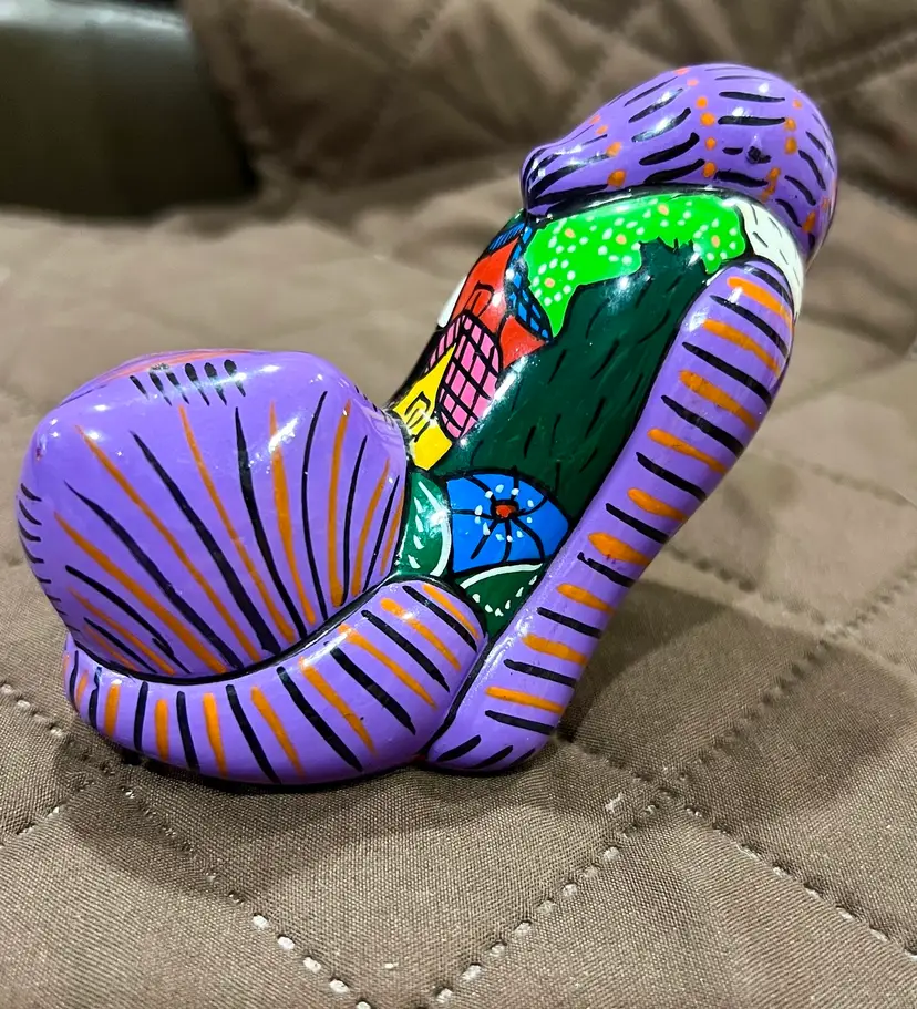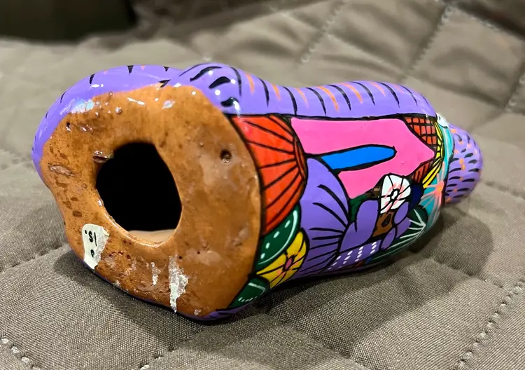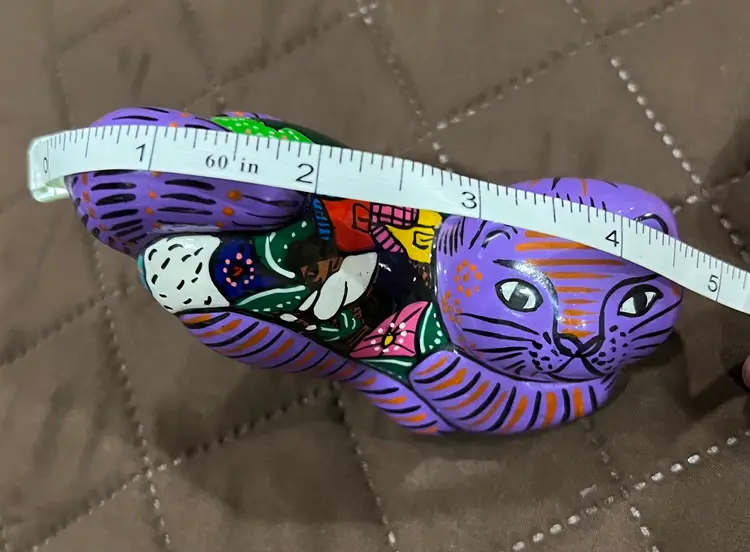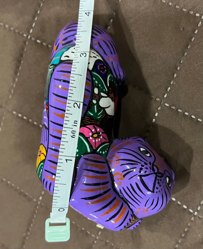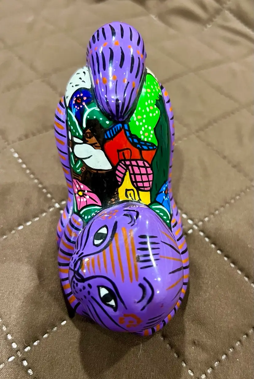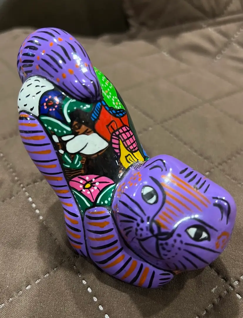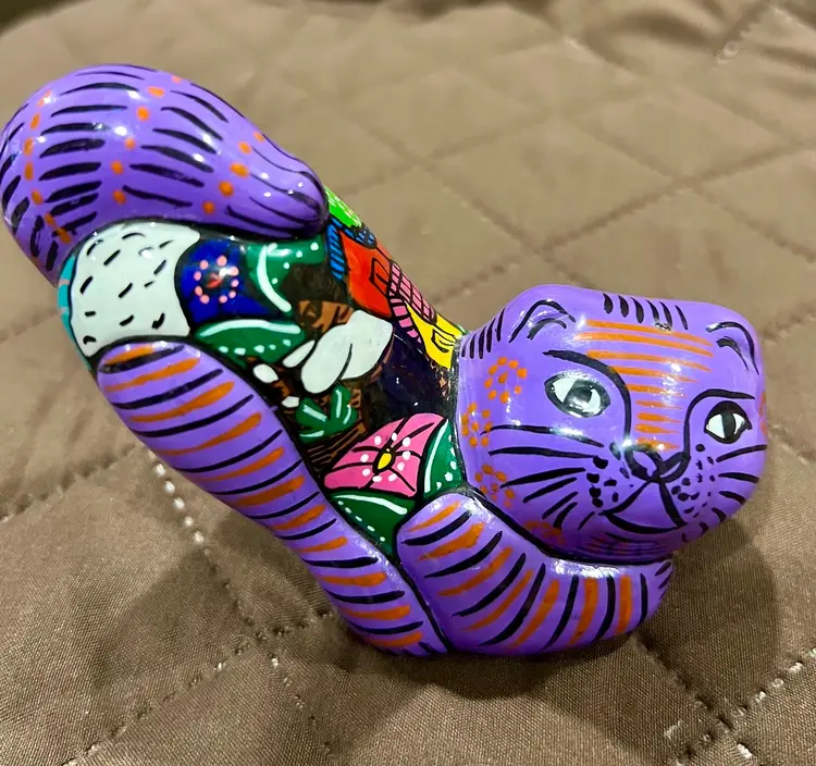 This beautiful Mexican cat figurine is truly a work of art. Handmade from red clay, it features intricate hand-painted details of a bird and flowers in vibrant colors. The provenance of this piece is unfortunately unknown, but it is a wonderful representation of traditional Mexican folk art.