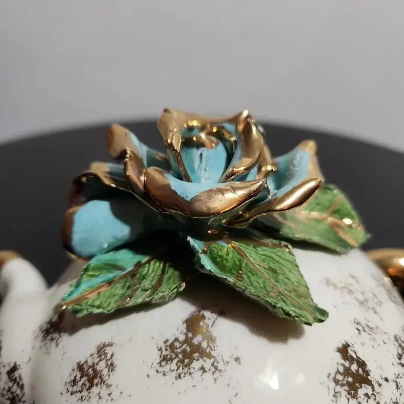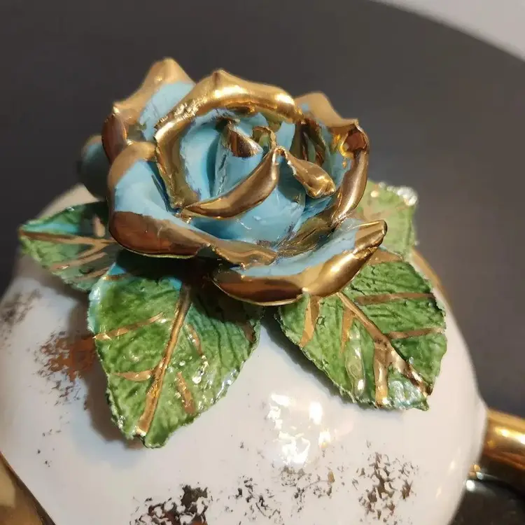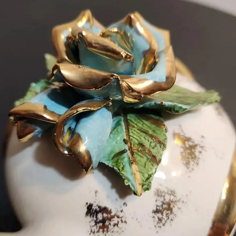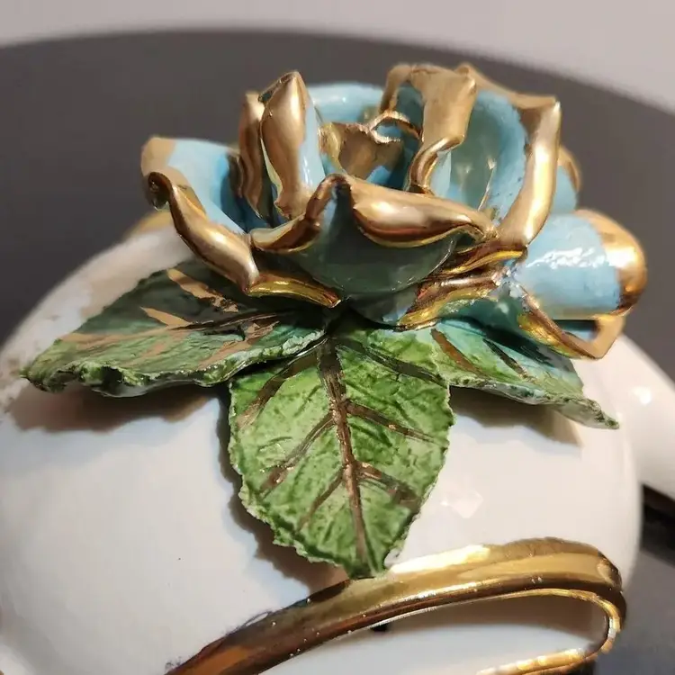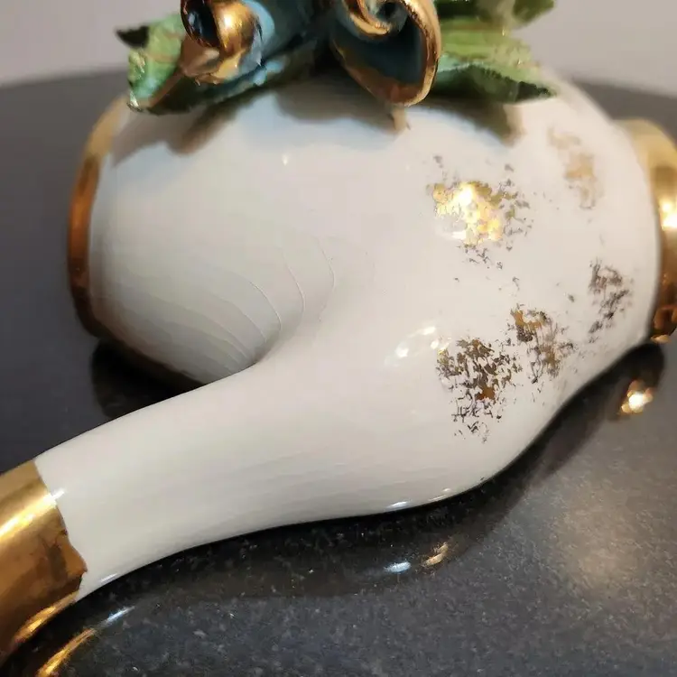 There are no cracks or chips. There is crazing throughout and wearing away of the paint due to age. All of the petals of the flower and leaves are in nice shape.
