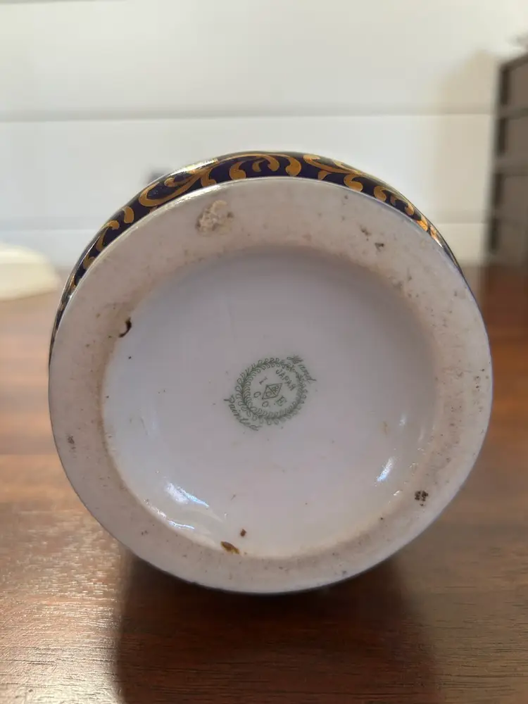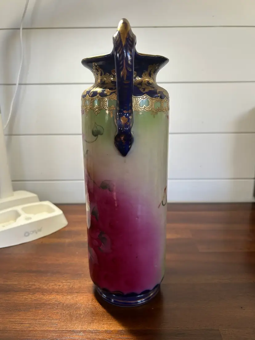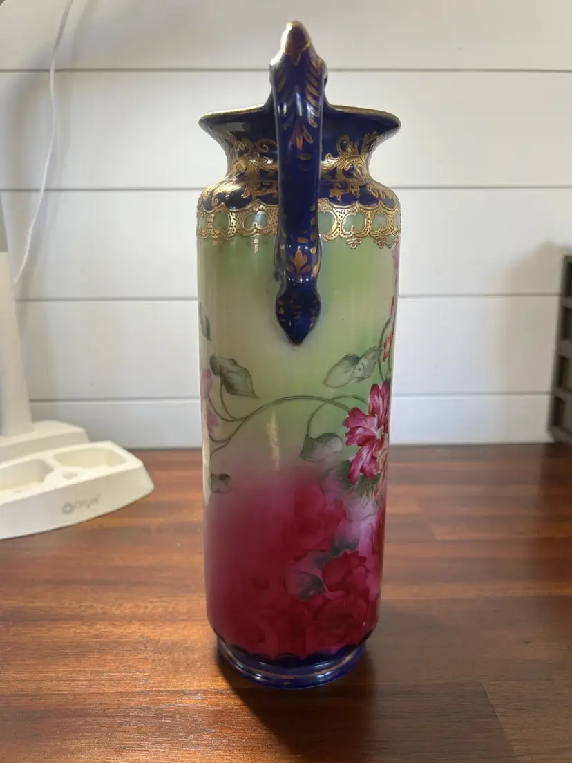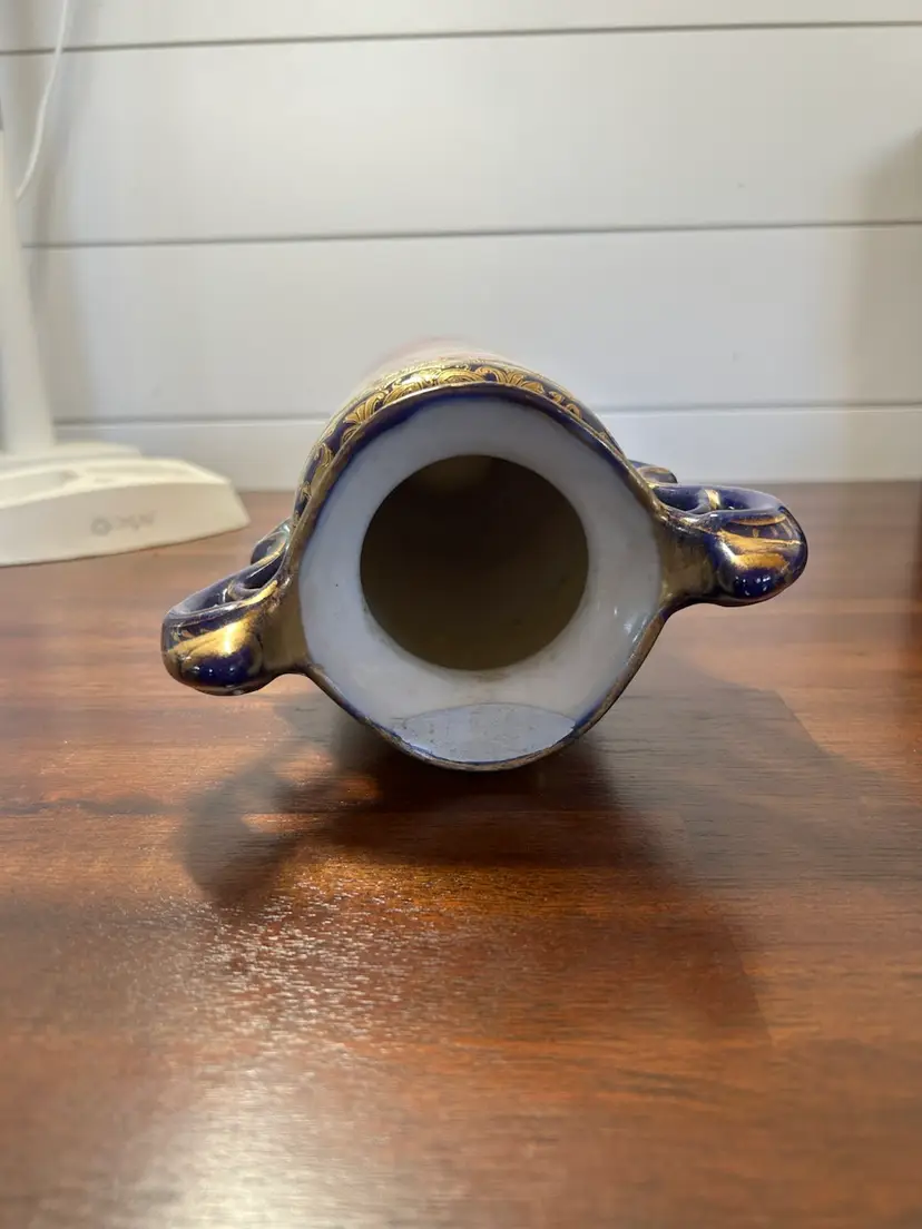 This is a hand-painted Nippon vase with cobalt blue and gold gilt decoration. It was exported from Japan between 1891 and 1921. It stands 12 inches tall and 5.5 inches across the top. There are no chips or crack.