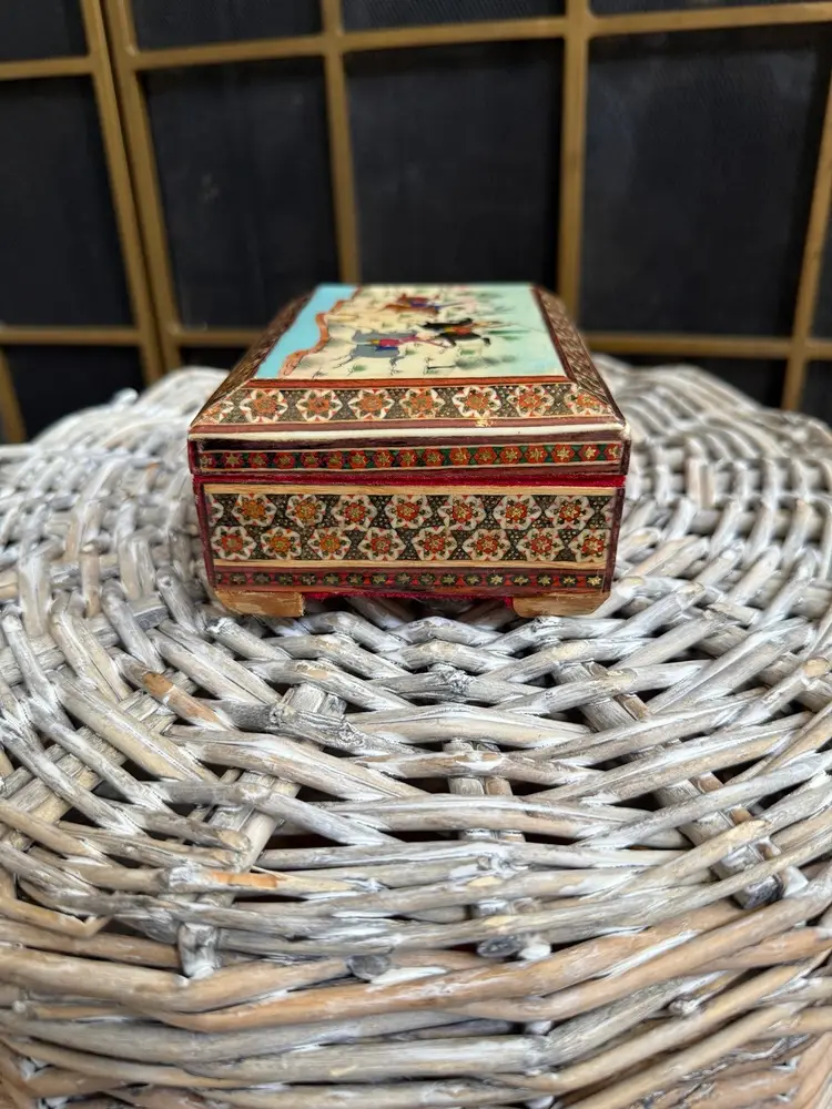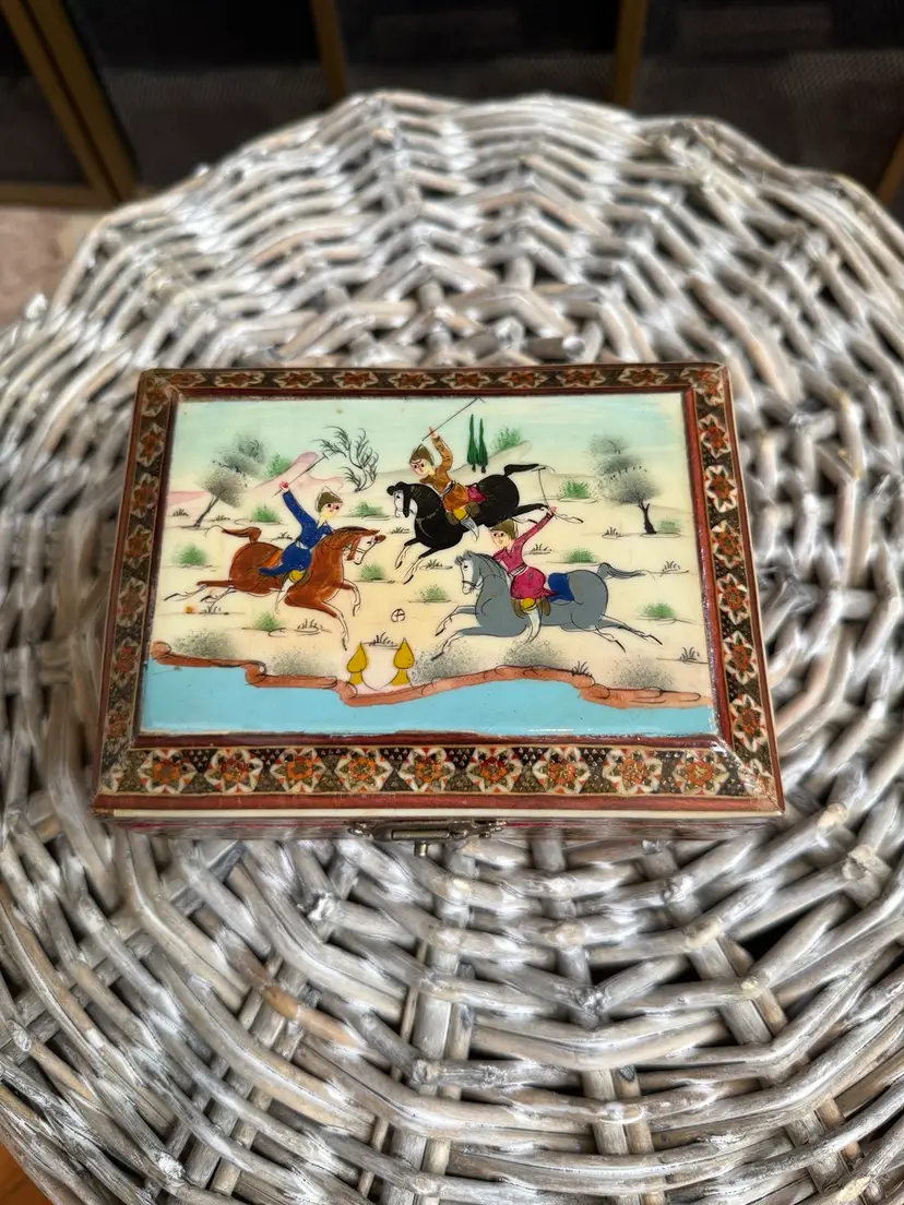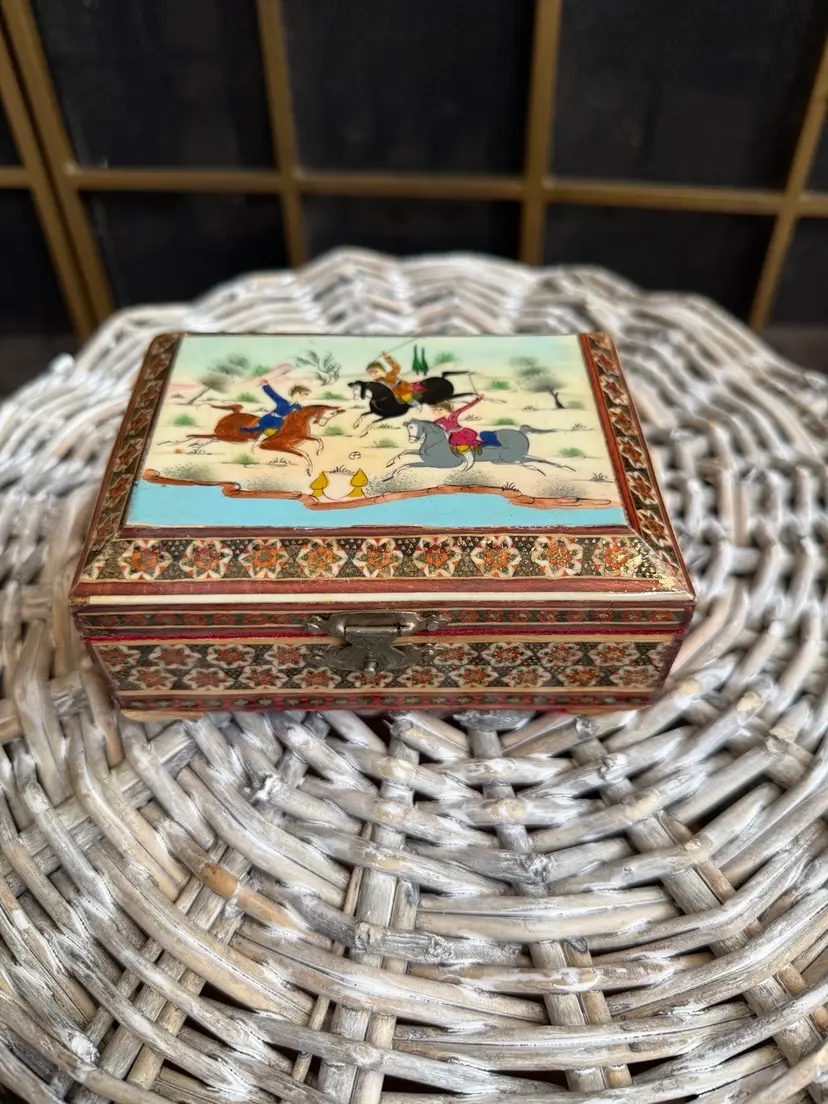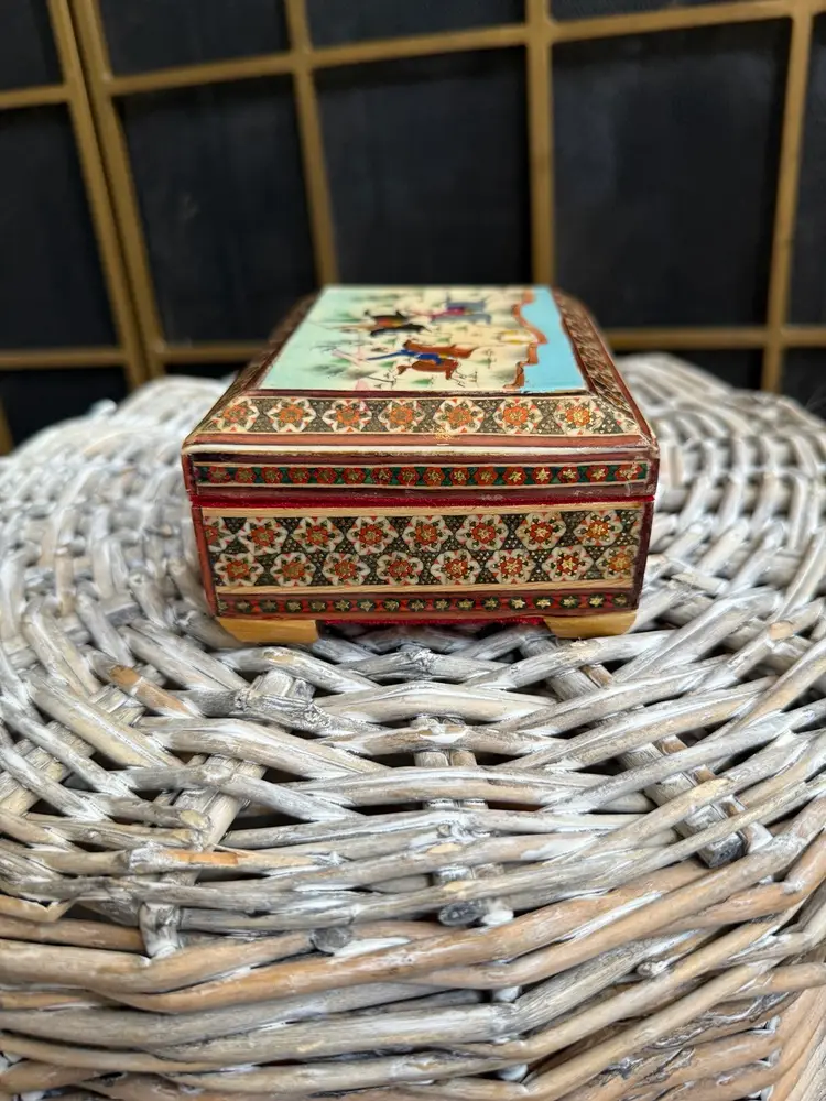 Add a touch of artistry to your décor with this beautiful hand-painted trinket box. The lid features a detailed Persian miniature scene of horseback riders surrounded by an intricate border design. The interior is lined with deep red velvet, perfect for holding rings, small keepsakes, or other treasures. This style of box is traditionally crafted in Iran (Persia) and sometimes Kashmir, known for its miniature paintings and Khatam marquetry borders. Each piece is unique and painted by hand, making it a collectible as well as a functional accent.