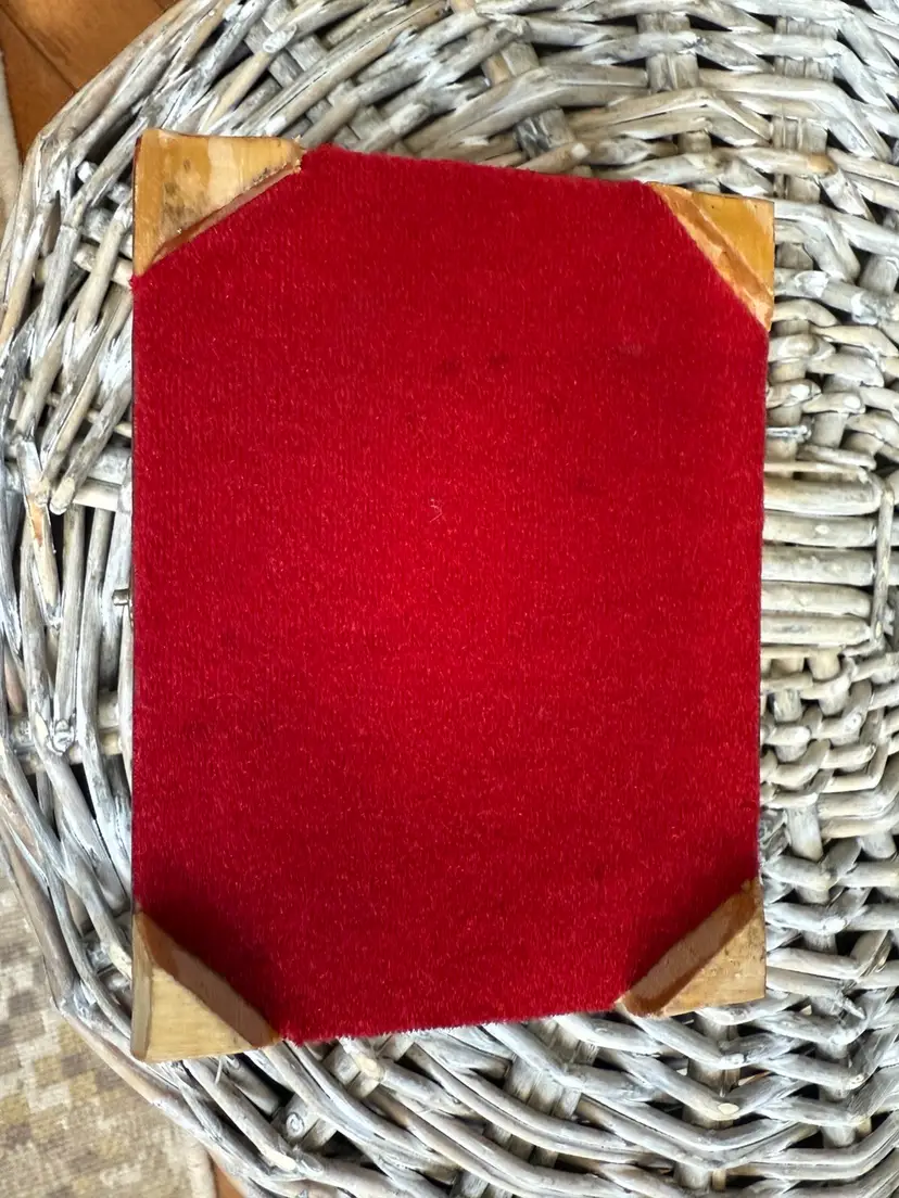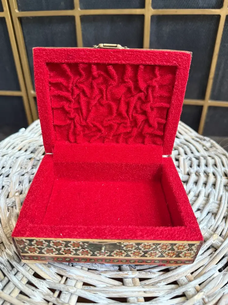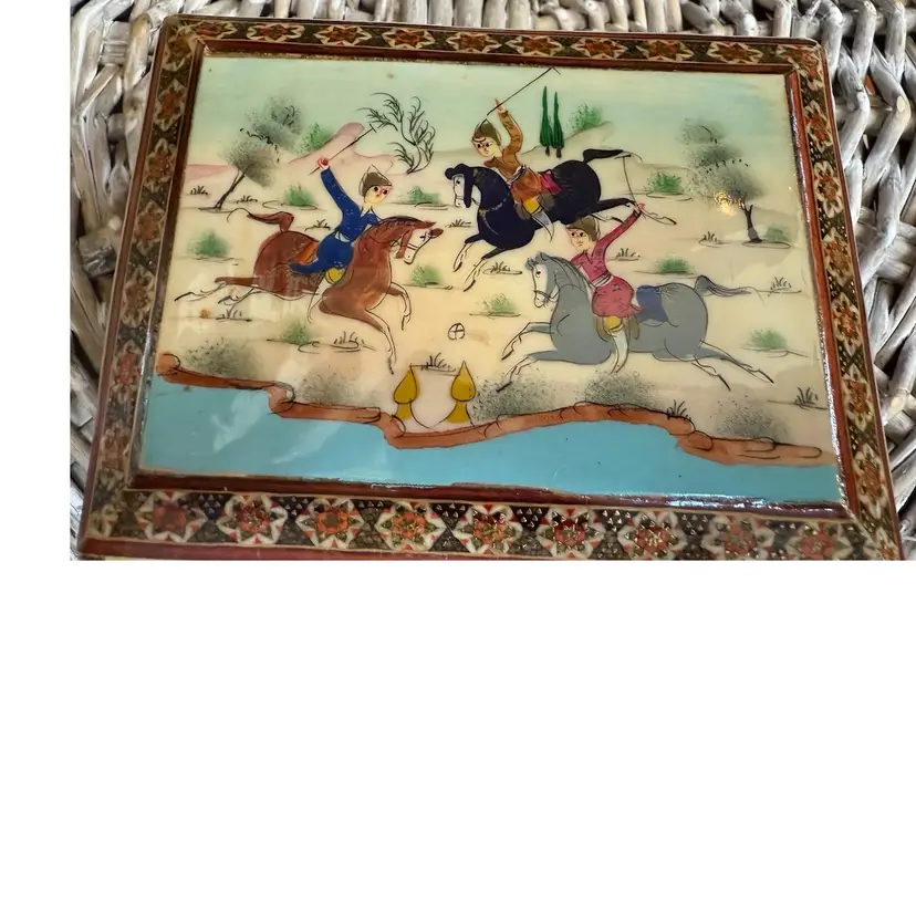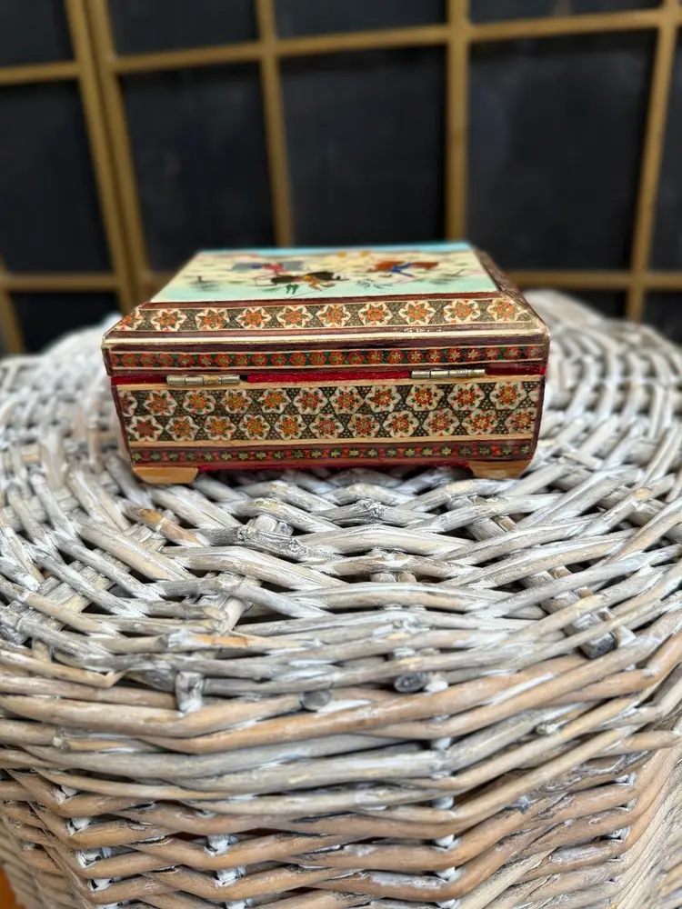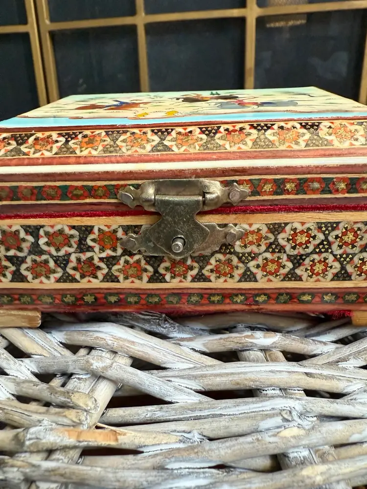 Add a touch of artistry to your décor with this beautiful hand-painted trinket box. The lid features a detailed Persian miniature scene of horseback riders surrounded by an intricate border design. The interior is lined with deep red velvet, perfect for holding rings, small keepsakes, or other treasures. This style of box is traditionally crafted in Iran (Persia) and sometimes Kashmir, known for its miniature paintings and Khatam marquetry borders. Each piece is unique and painted by hand, making it a collectible as well as a functional accent.