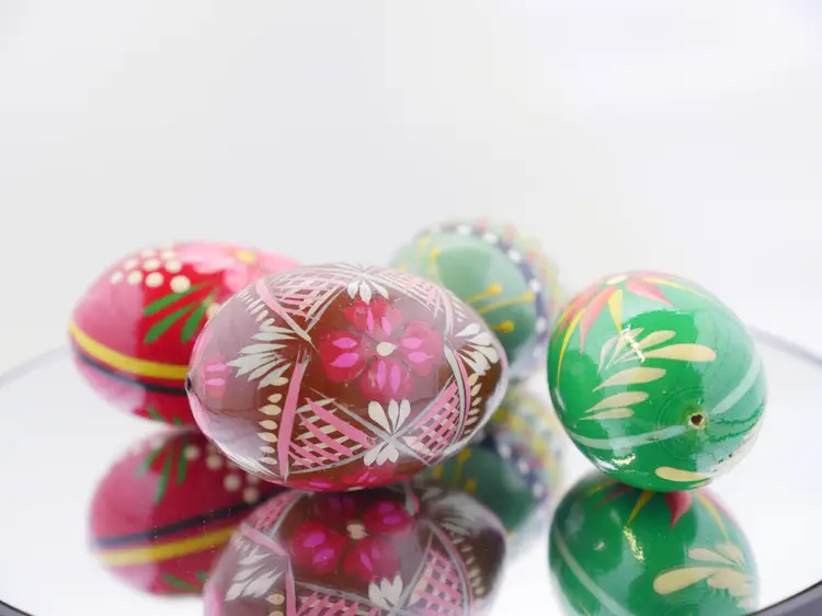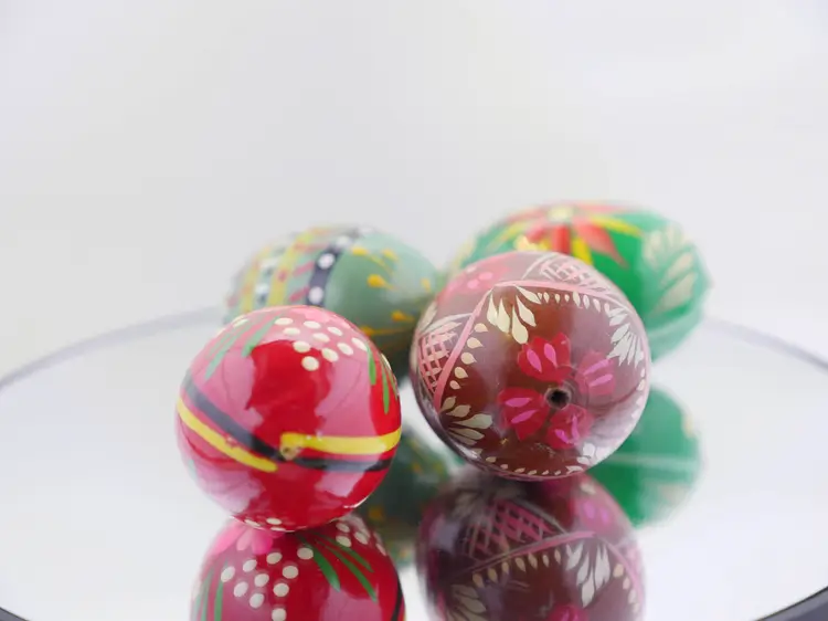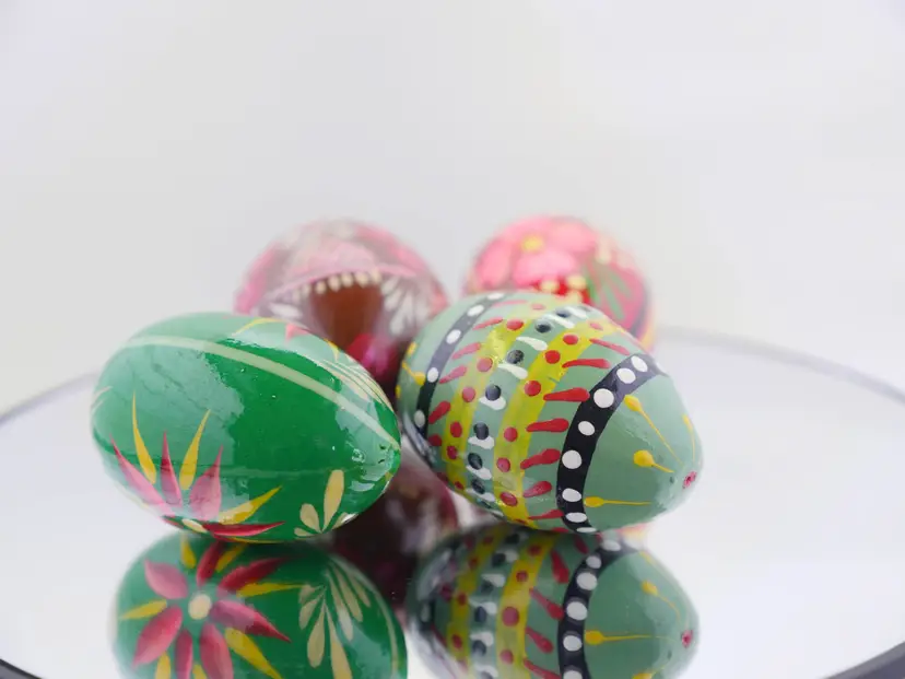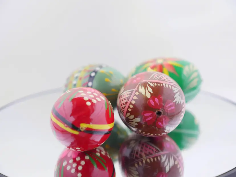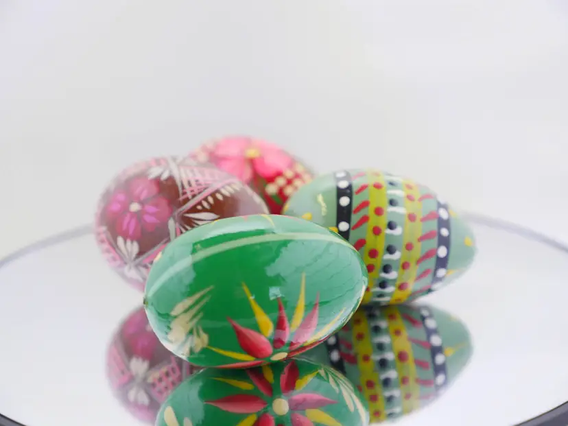 A set of 4 eggs crafted from wood intricately hand-painted with colorful, geometric, and floral patterns in the Polish pisanski style. While traditional pisanki are often real eggs, wooden versions like these were commonly produced for the tourist and export markets, allowing for more durable and intricate decoration. They are prized for their detailed hand craftsmanship and are a popular collectible for those who appreciate folk art.