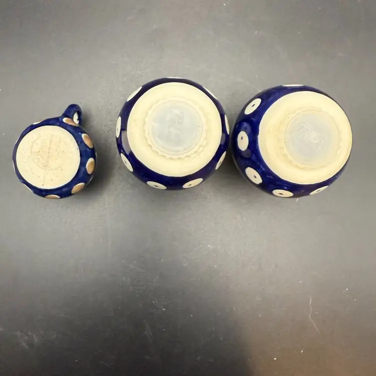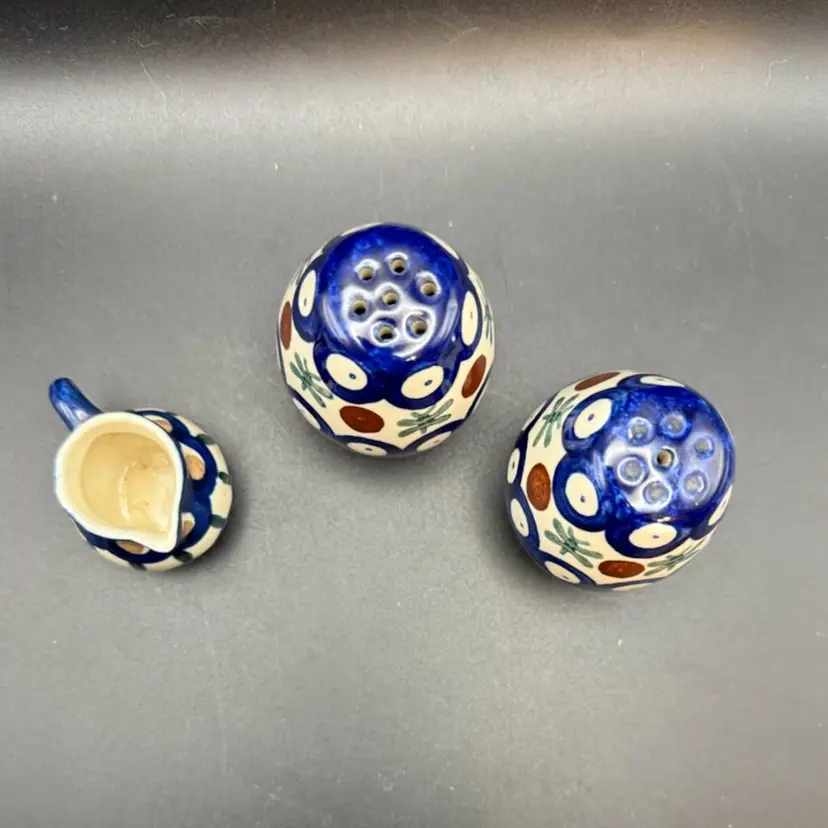 This set, featuring the classic peacock pattern, is characteristic of Bolesławiec craftsmanship. The egg shape of the shakers is a common form for salt and pepper sets, and the inclusion of a small pitcher suggests it might be part of a larger condiment set or a creamer for coffee or tea. These pieces are both functional and decorative, embodying the rich heritage of Polish folk art.