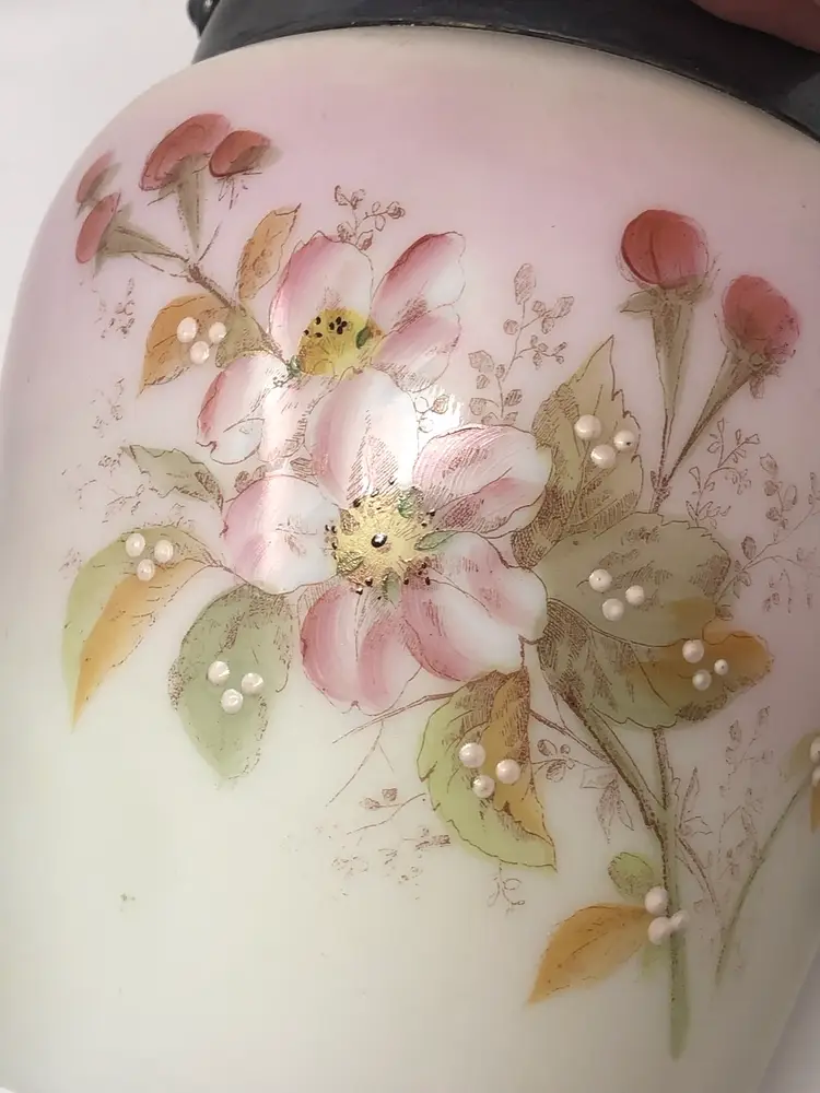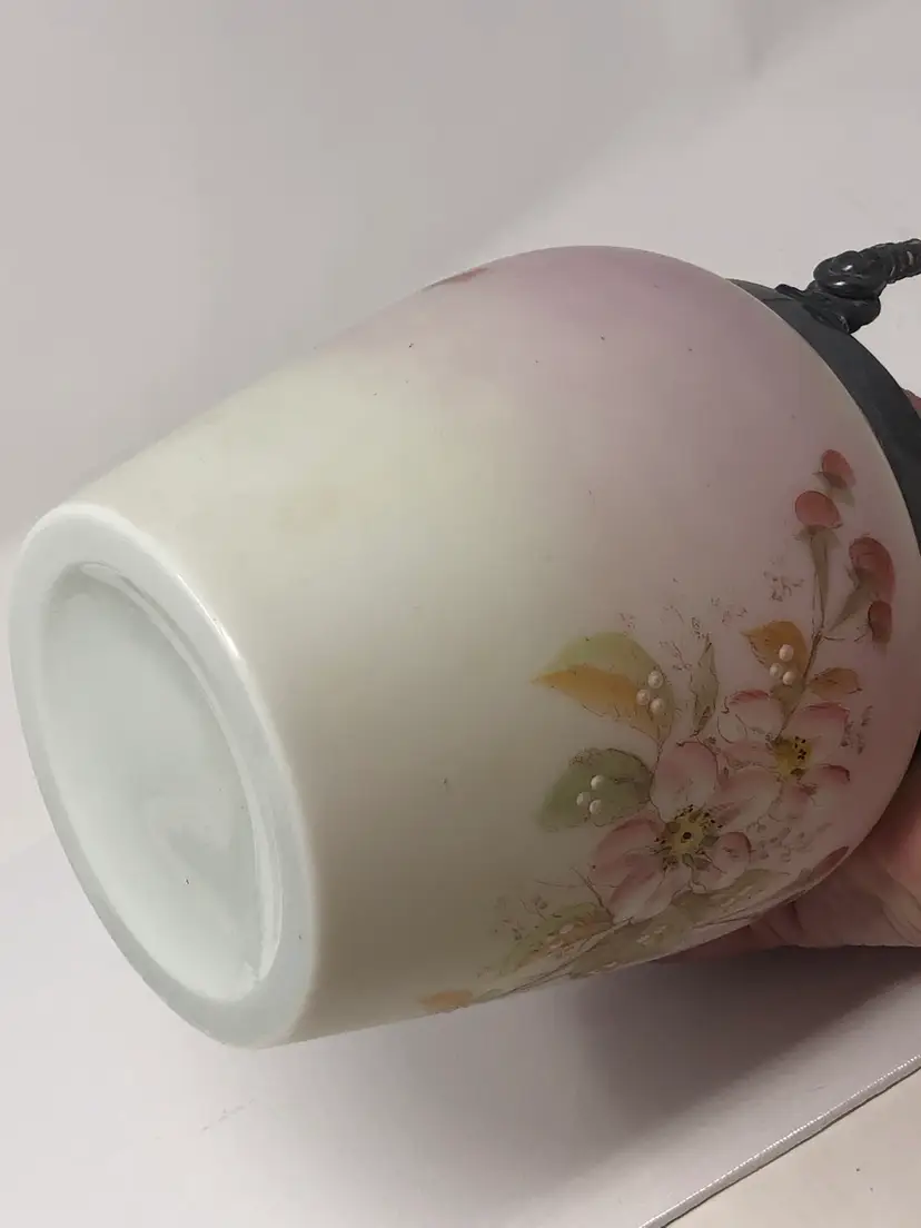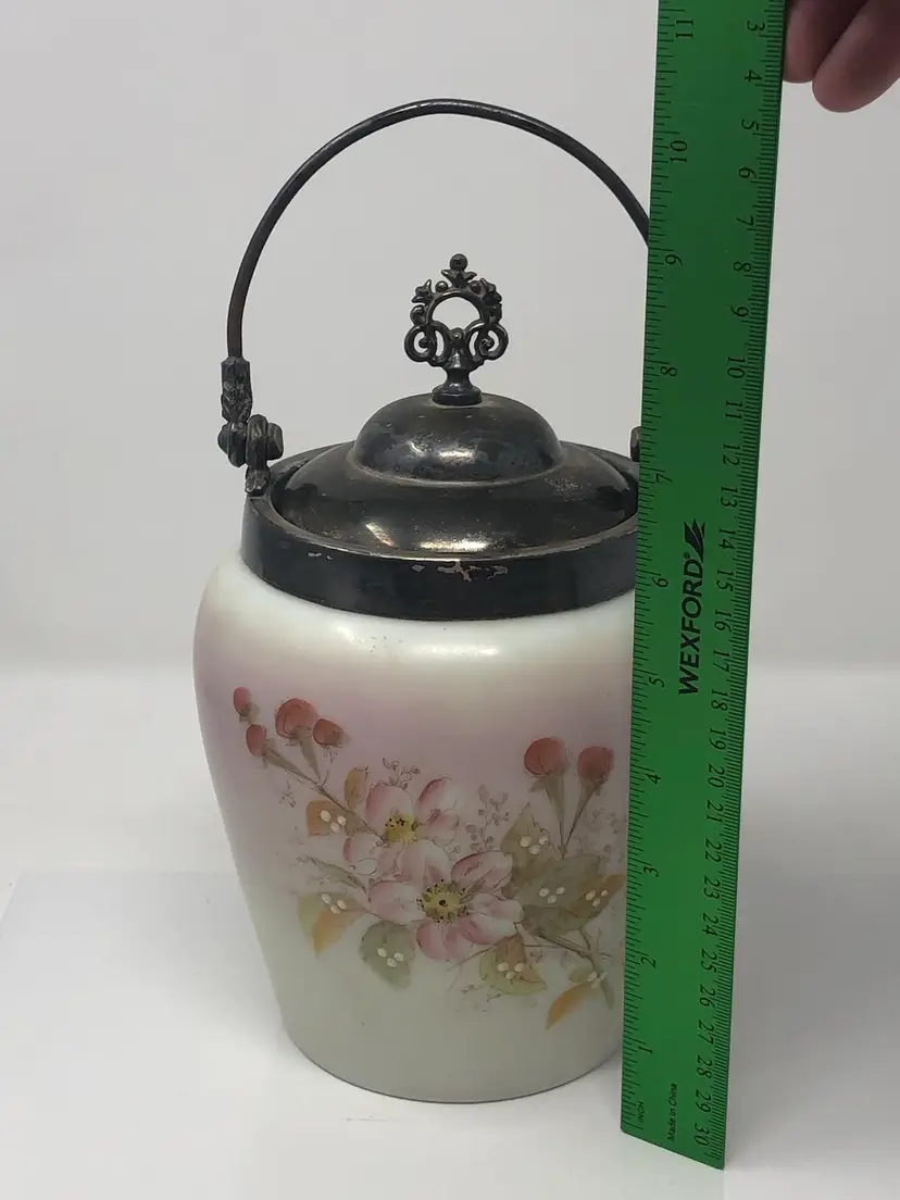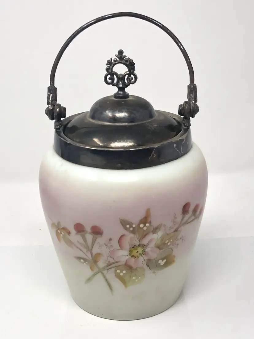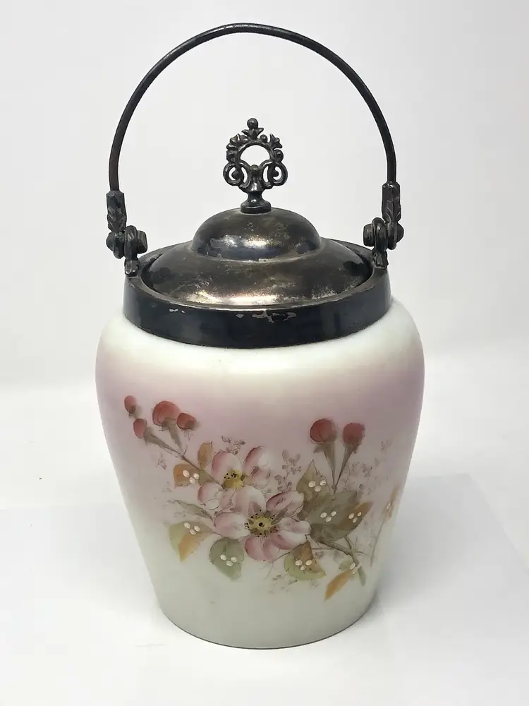 6 1/2" porcelain jar with hand painted cherry blossoms. 9" to the top of the finial on the lid, 10 1/2" to the top of the handle. No markings, no chips or cracks