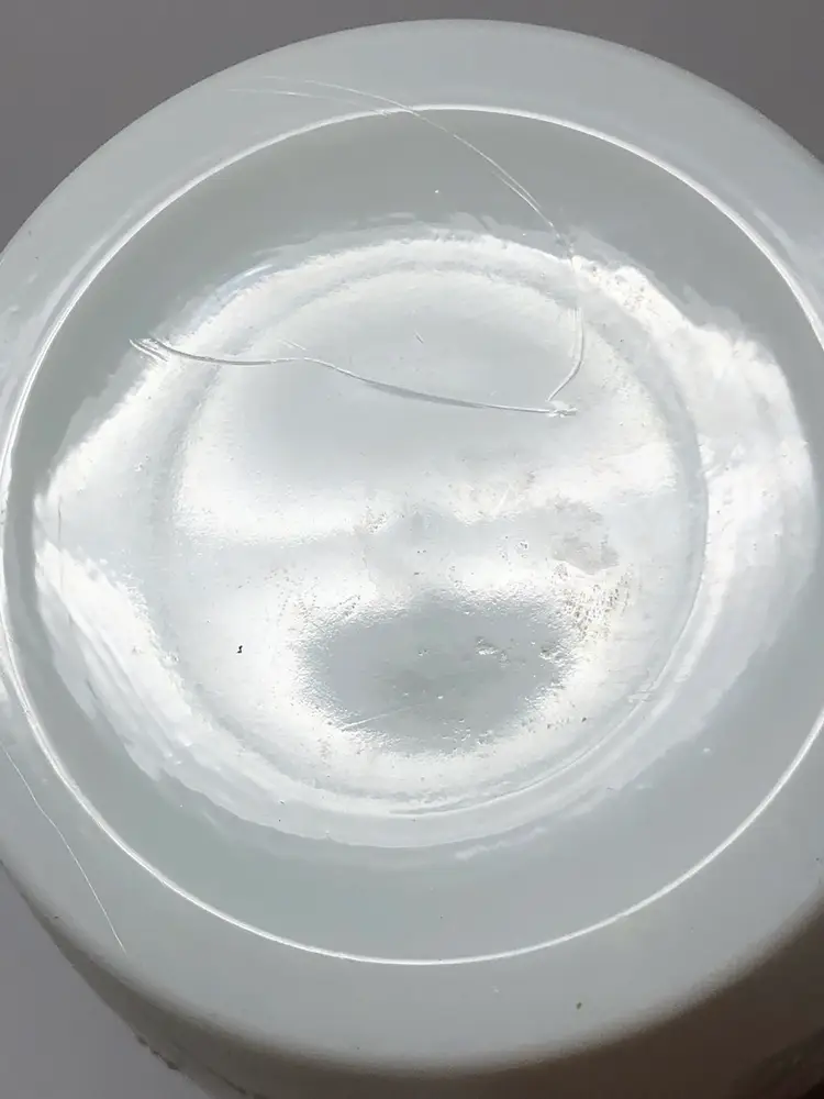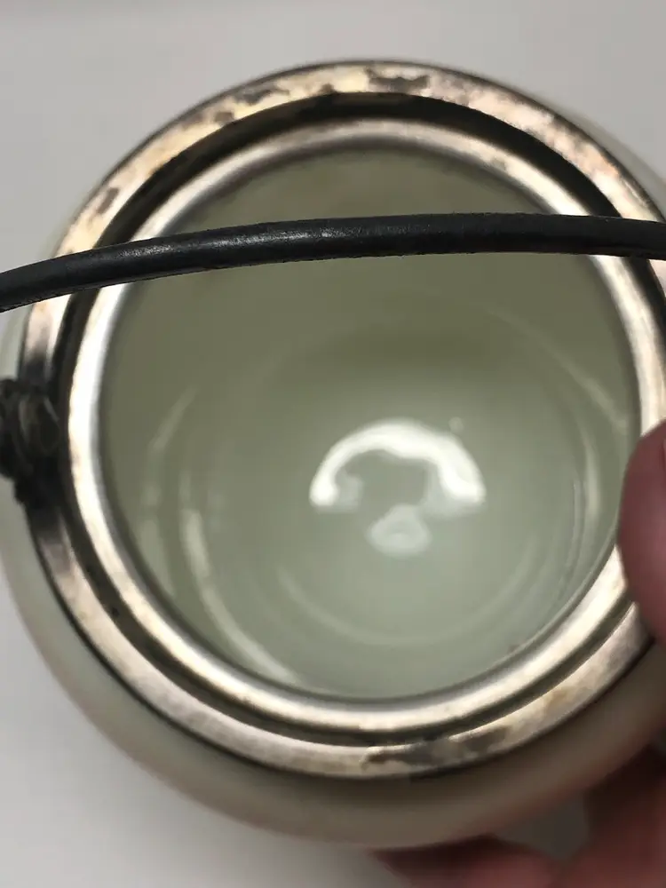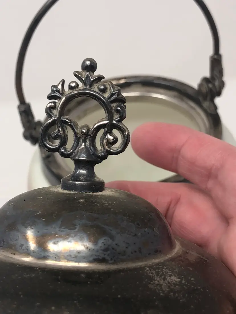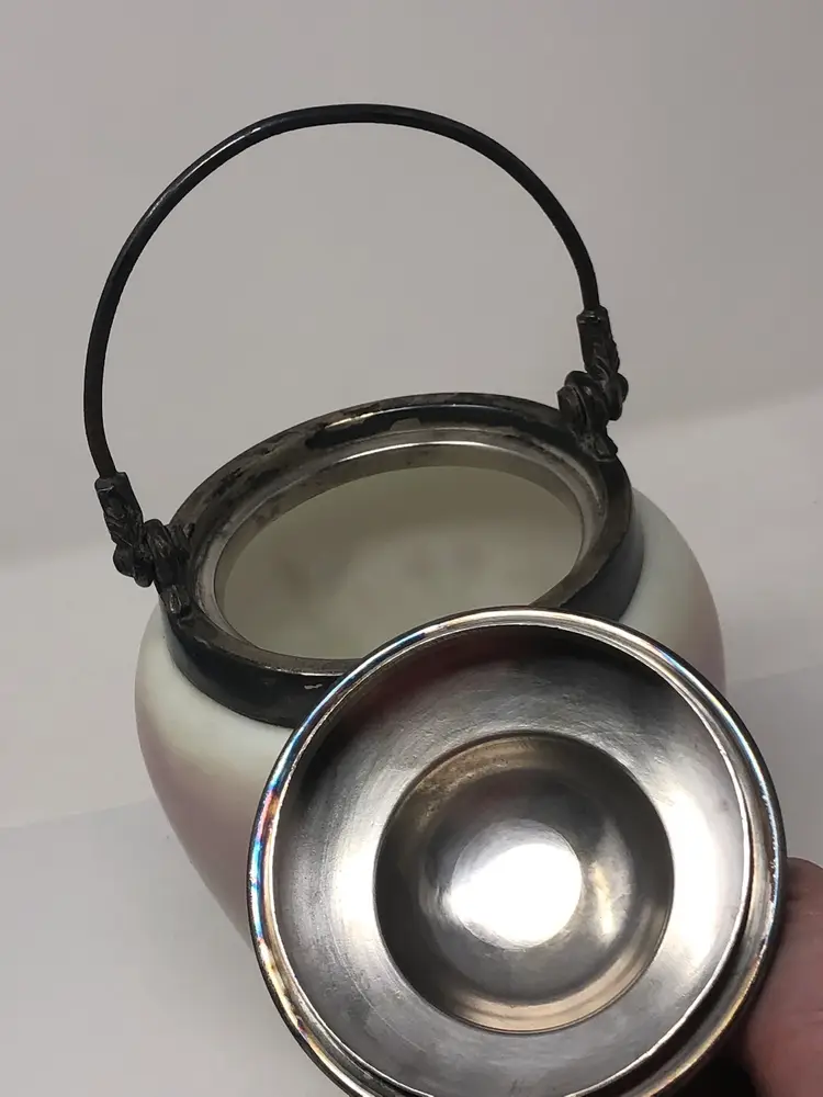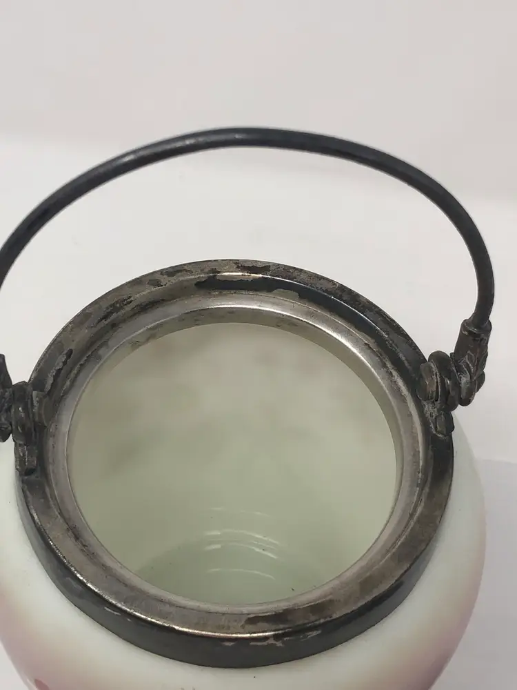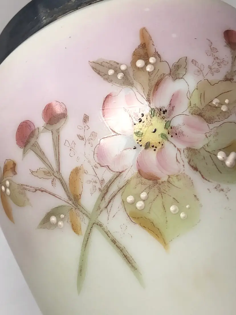 6 1/2" porcelain jar with hand painted cherry blossoms. 9" to the top of the finial on the lid, 10 1/2" to the top of the handle. No markings, no chips or cracks