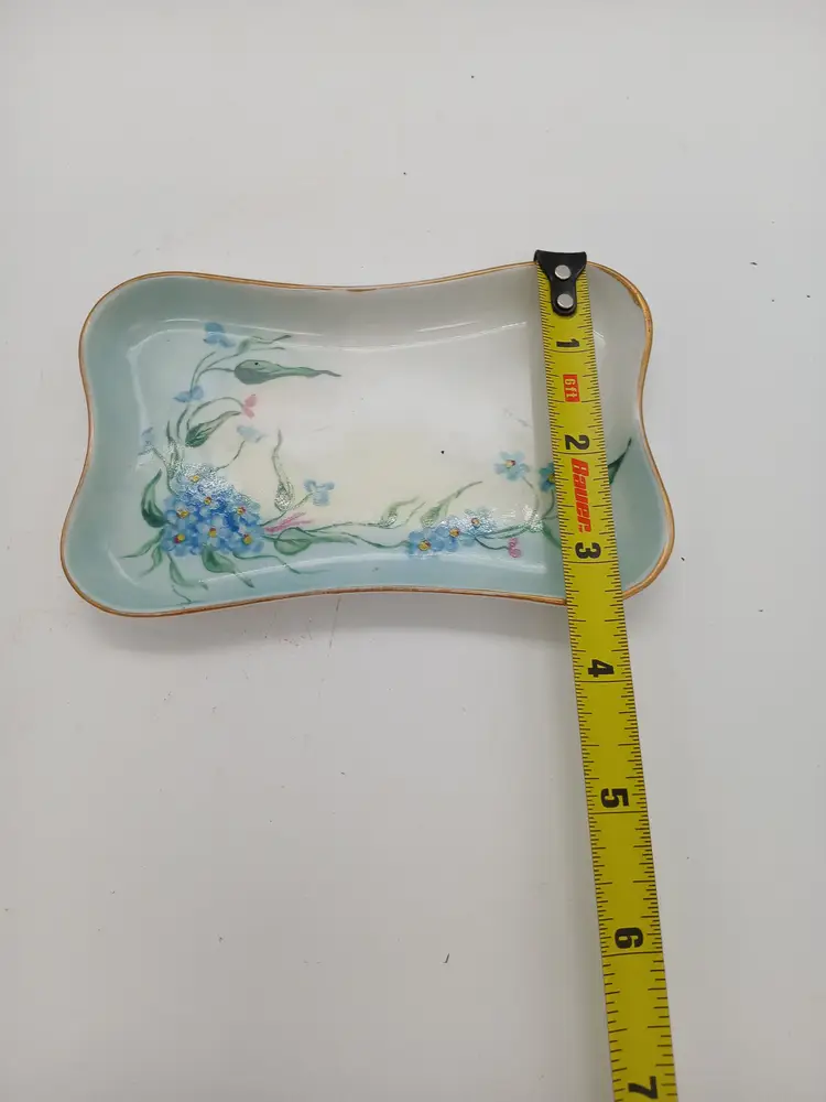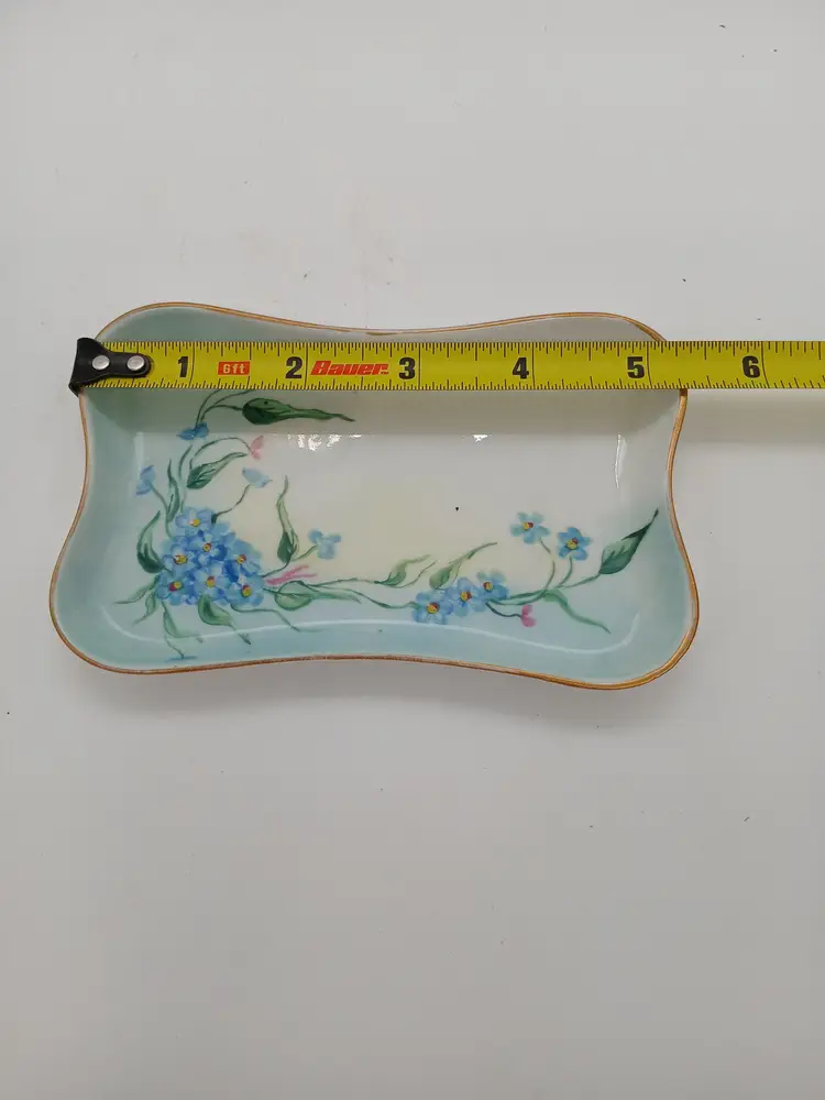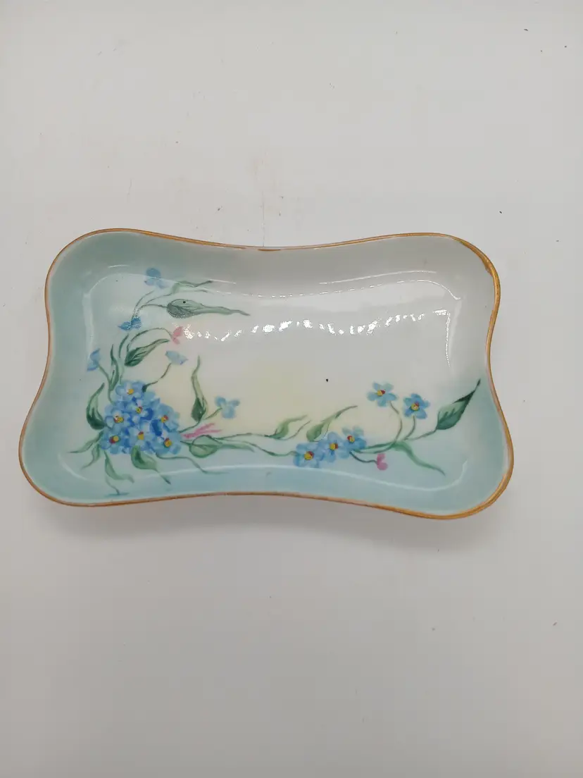 Vintage dresser tray Antique pin tray 1910 porcelain tray Forget me not flowers Hand painted vanity dish Edwardian porcelain Gold trim trinket dish Signed painted china