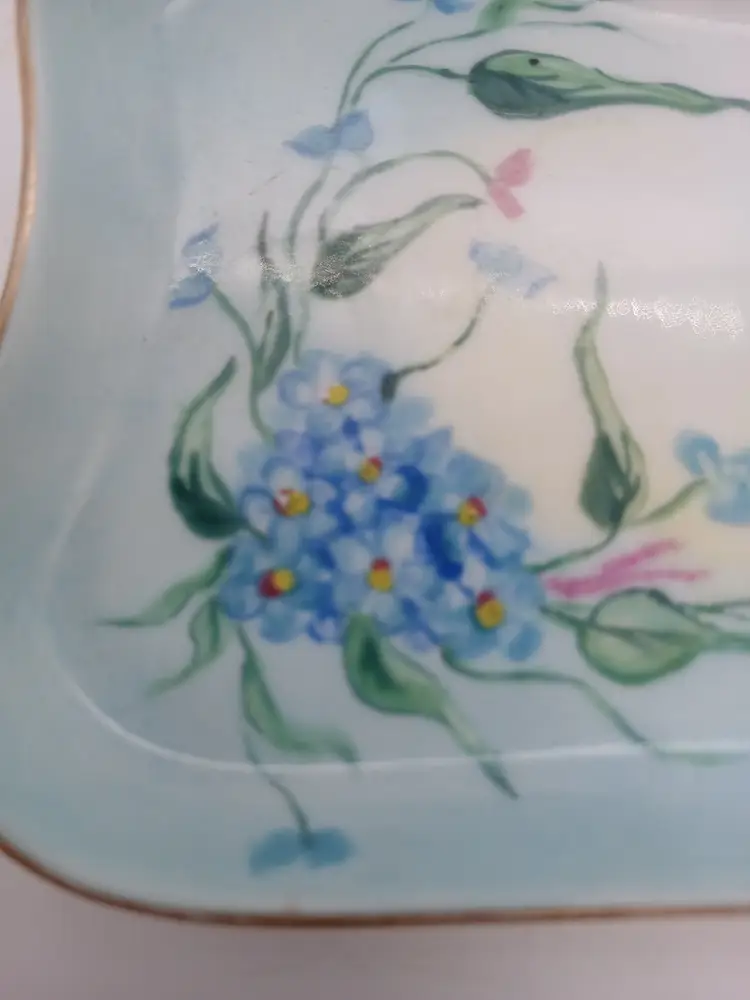 Beautiful antique hand-painted porcelain dresser / pin tray featuring clusters of blue forget-me-not flowers with green leaves and soft pastel shading. Finished with gold trim along the edges.