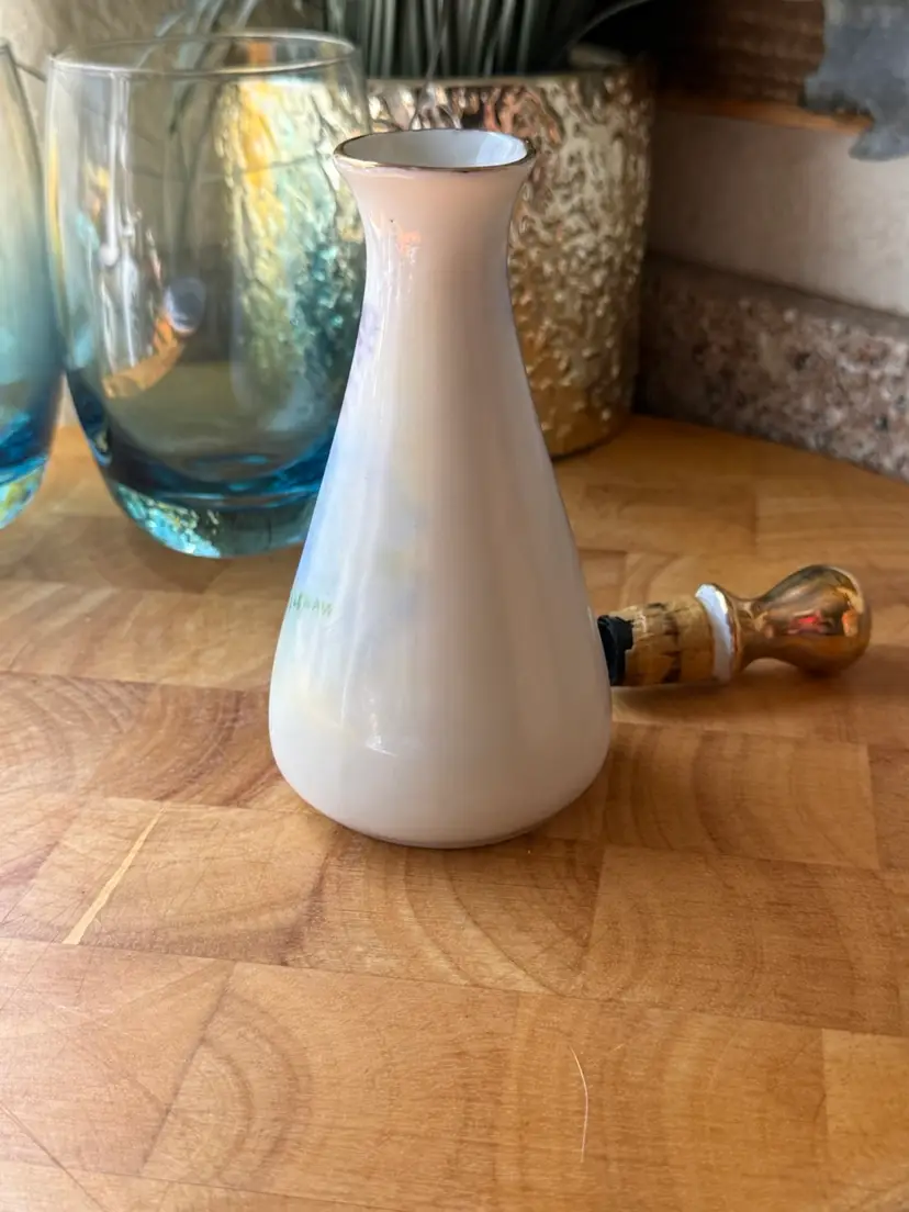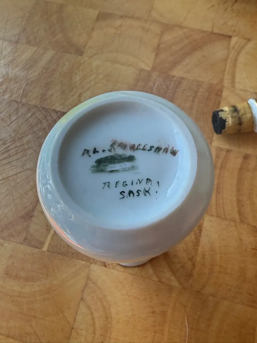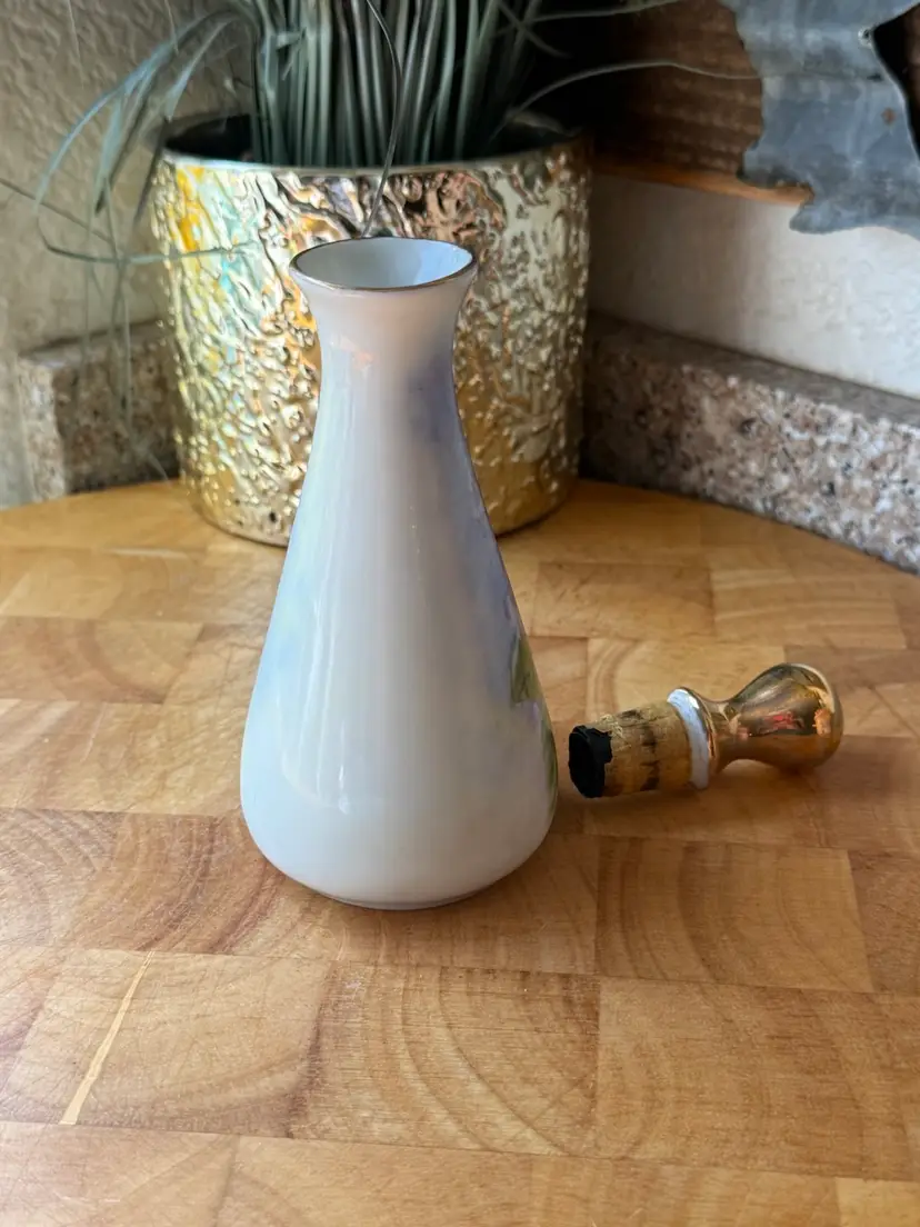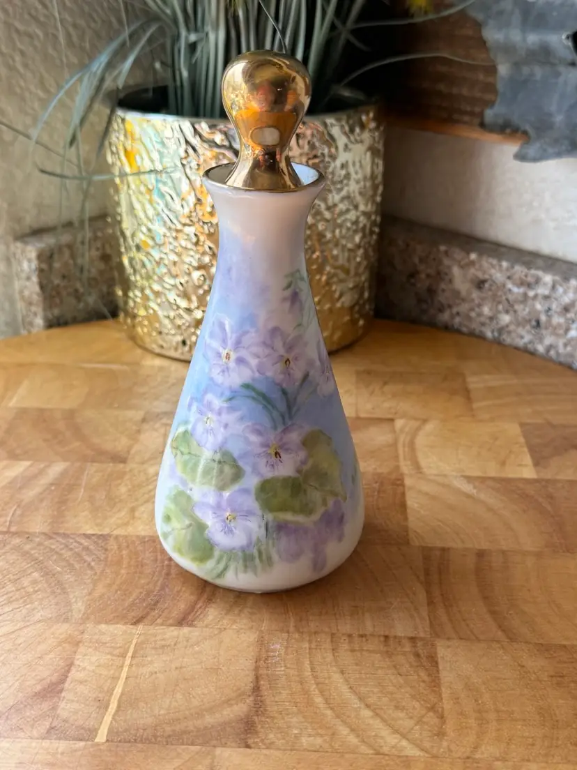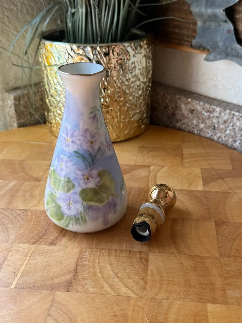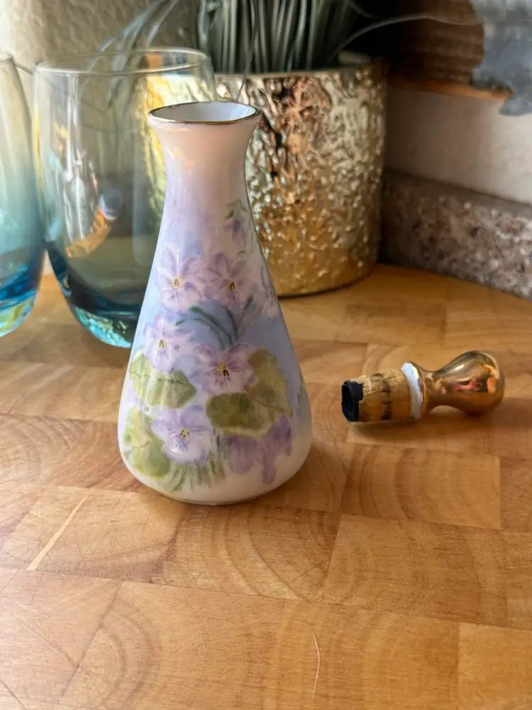 📝 Listing Description Vintage hand-painted porcelain perfume bottle featuring delicate violet florals and a soft pastel background, finished with a gold-tone stopper. • Marked on base: Regina, Saskatchewan (Canada) • Likely hand-decorated studio piece, circa 1970s–1980s • Material: Porcelain with cork and metal stopper • Approx size: 5”
