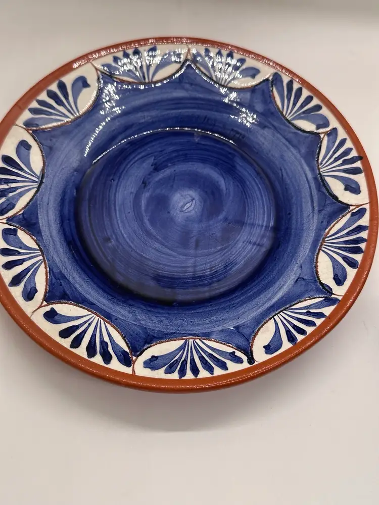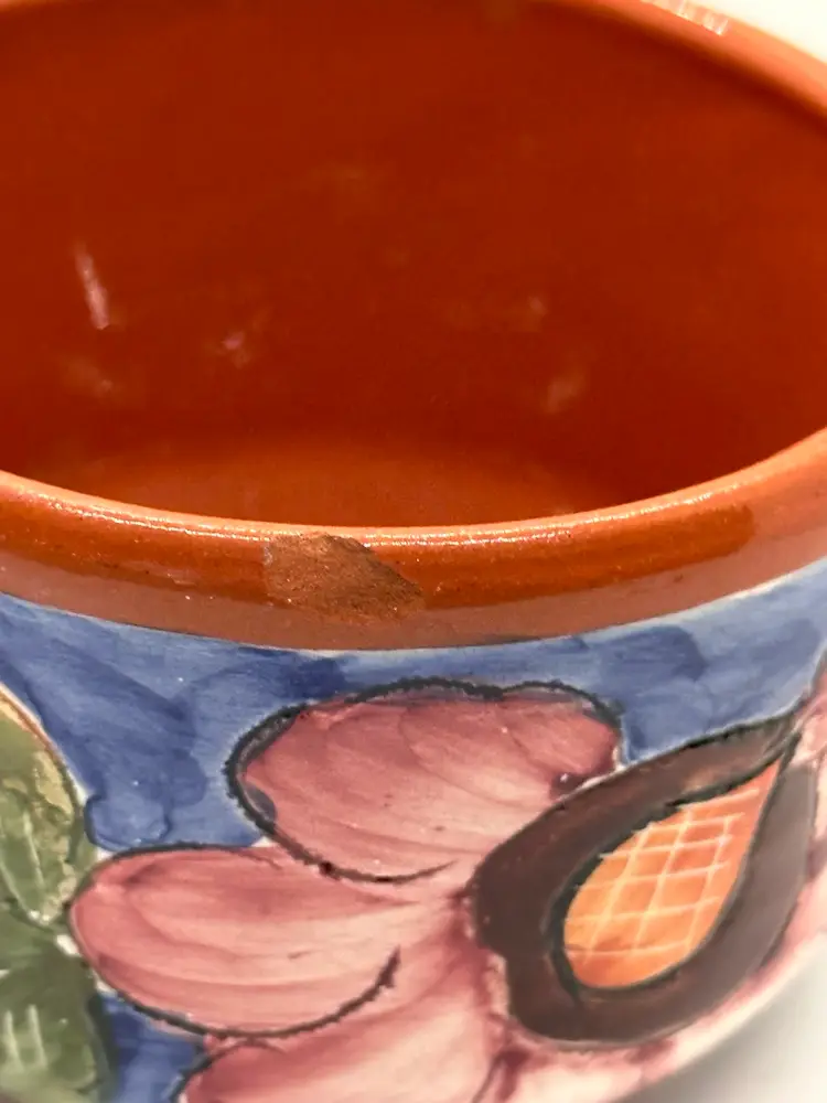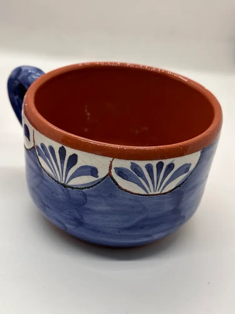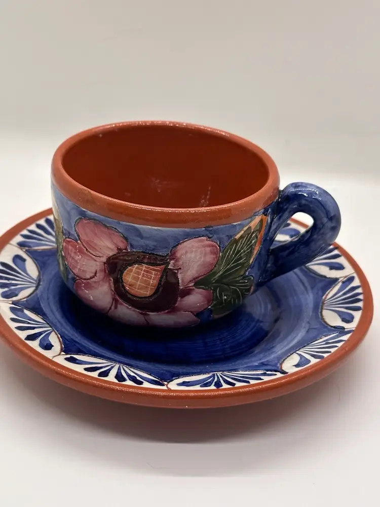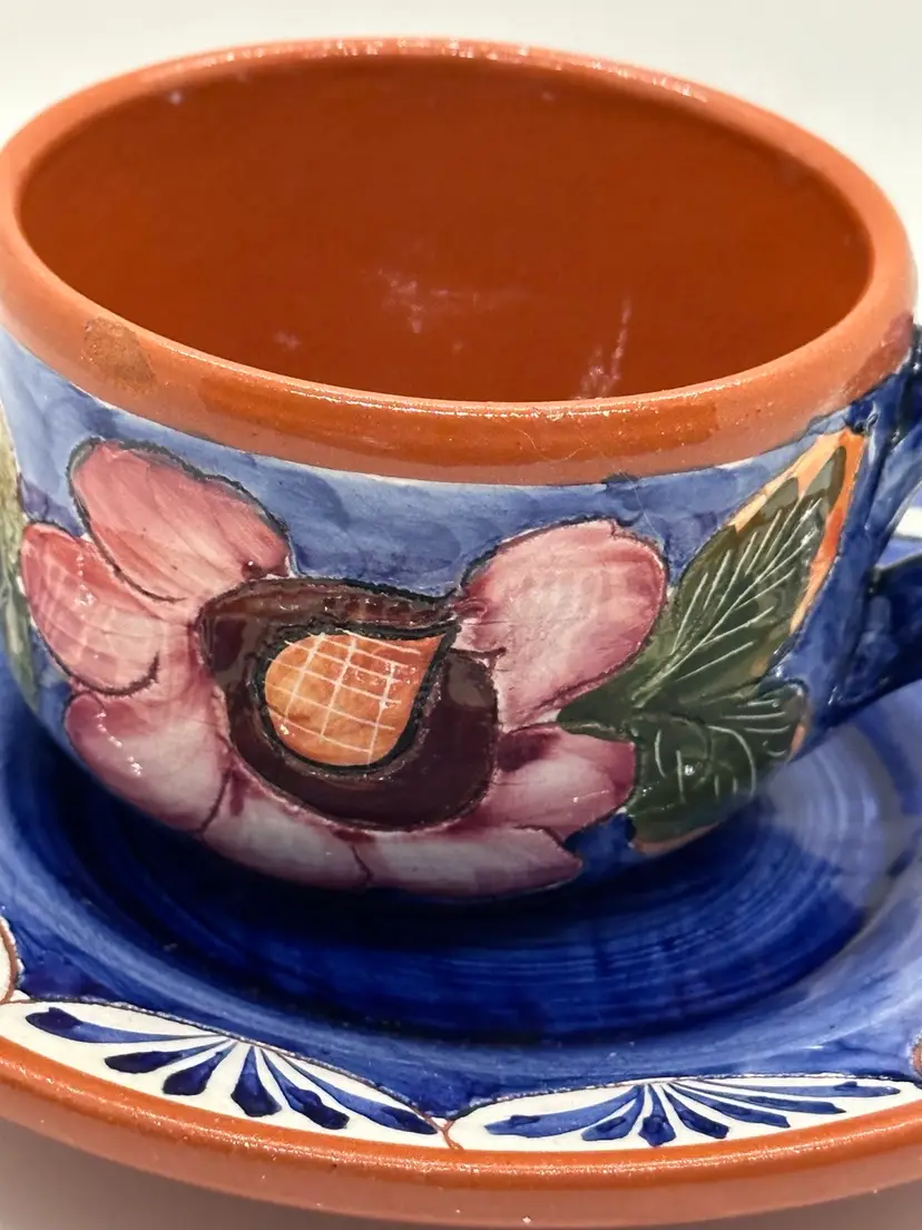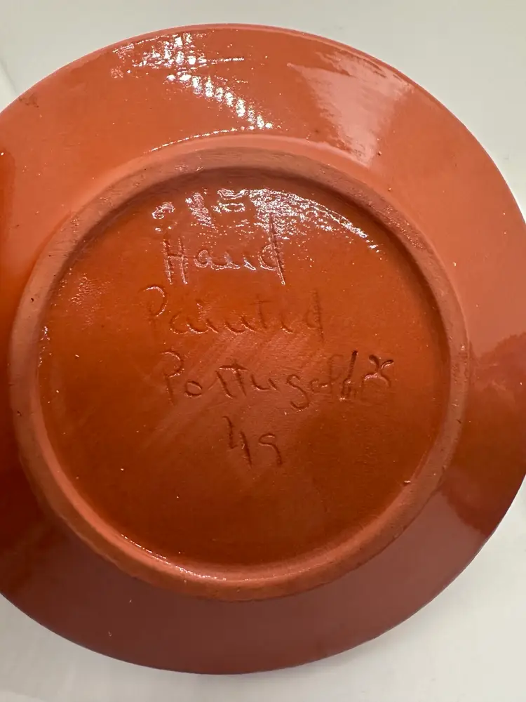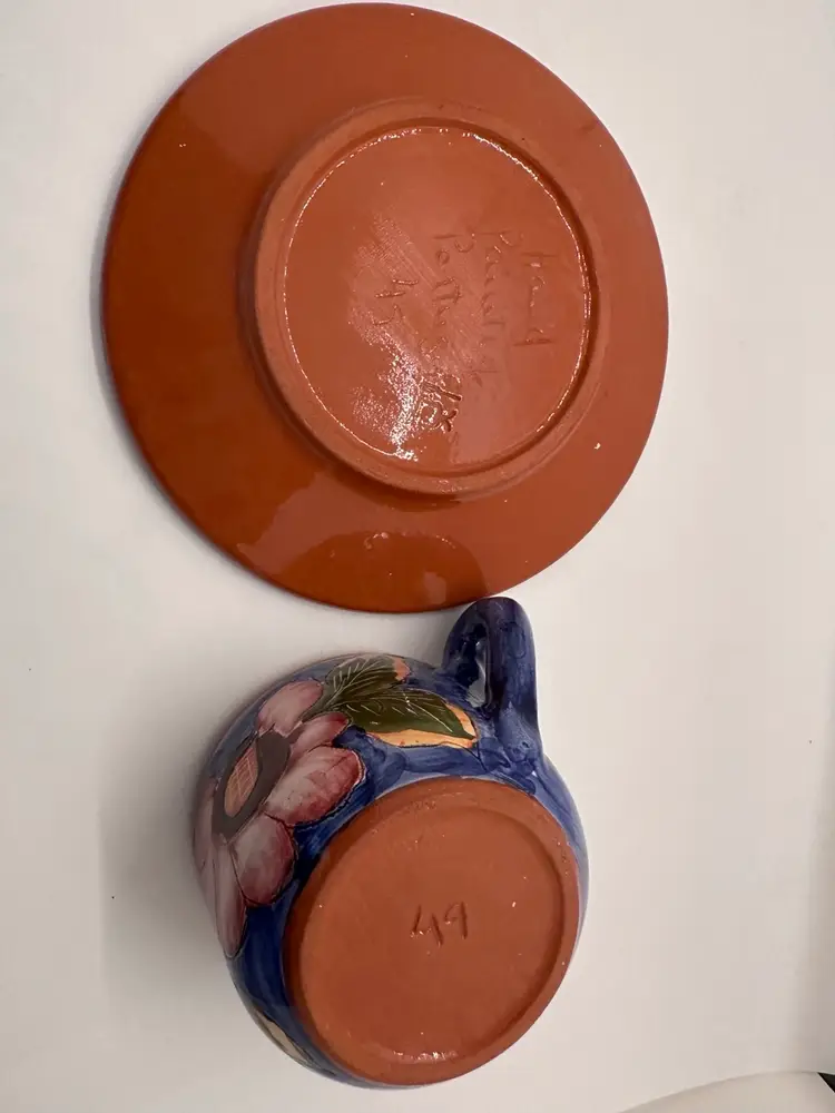 This cup and saucer set is beautifully done. Hand painted pottery with a floral design. Signed on bottom”hand painted pottery 49.” and then there is a symbol impressed in it also. However, there is a small chip on the rim of the cup as shown in pictures.