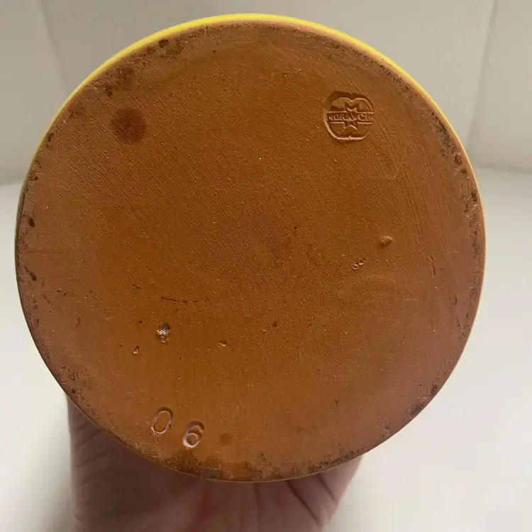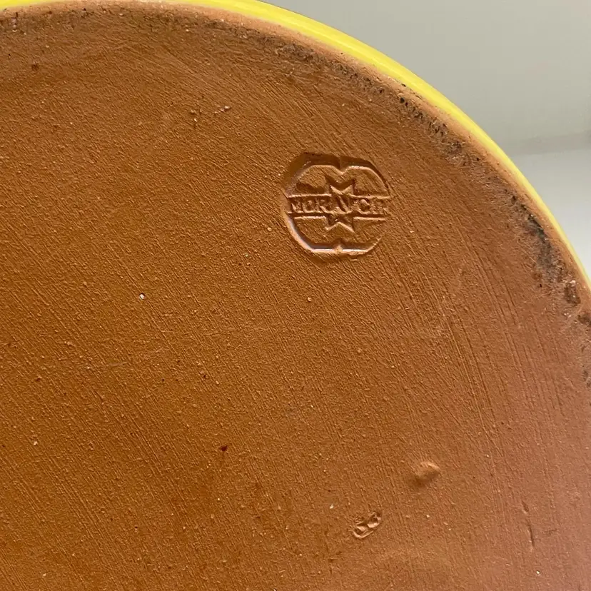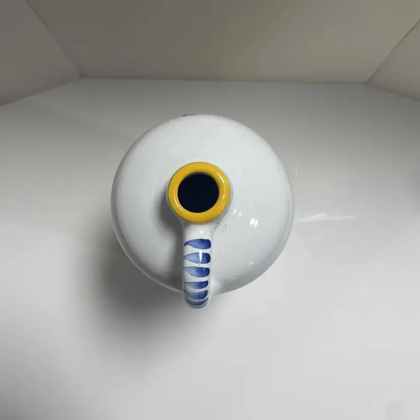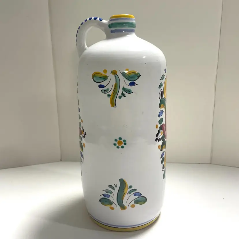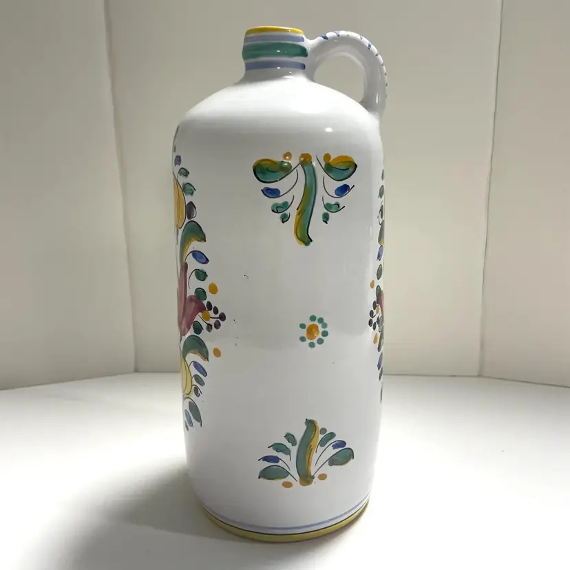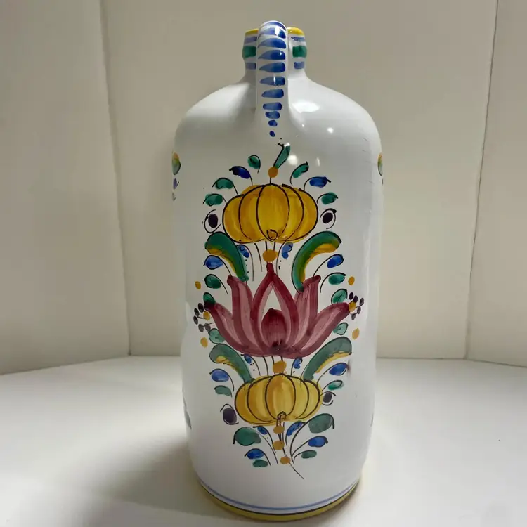 Beautiful hand painted pottery jug with colorful floral pattern. In great used condition; no chips or cracks. Bottom of jug is marked Moravich. This would look beautiful with a few floral or greenery sprigs!