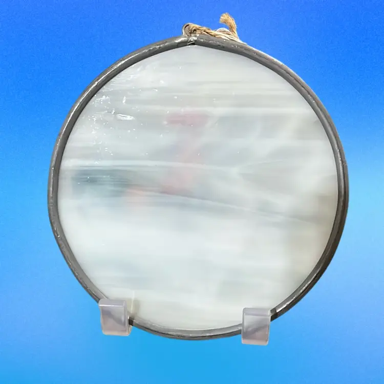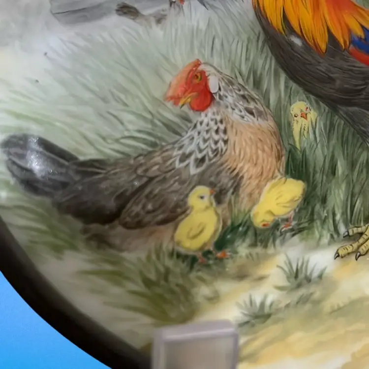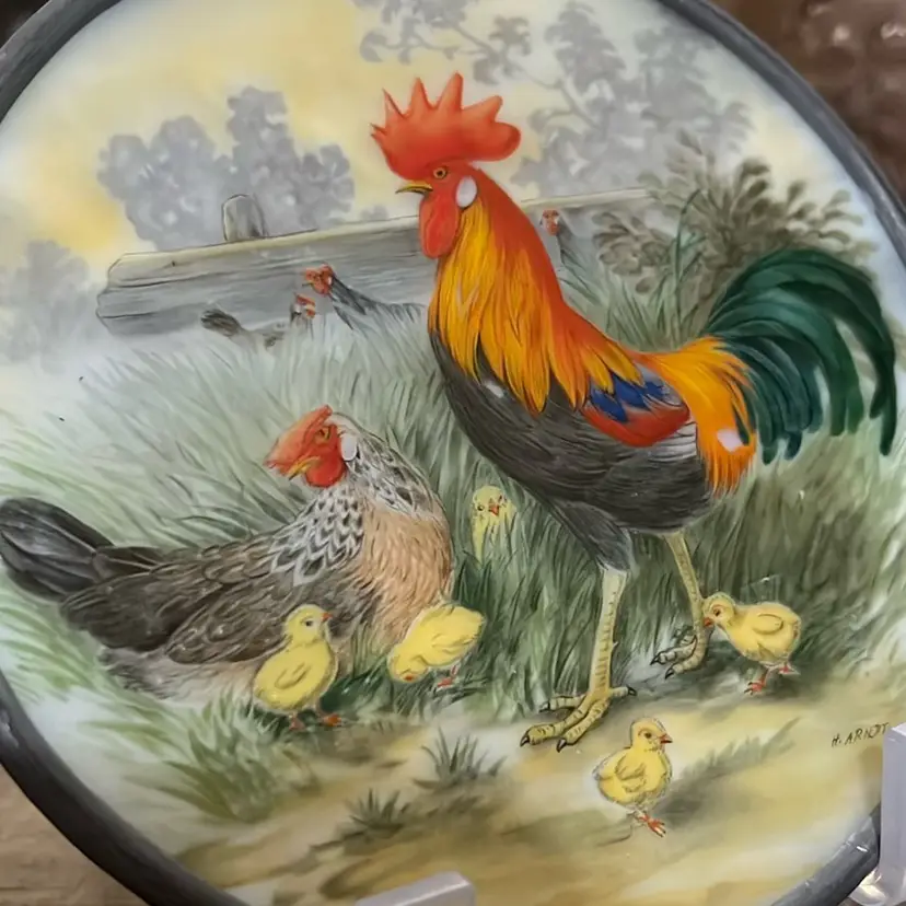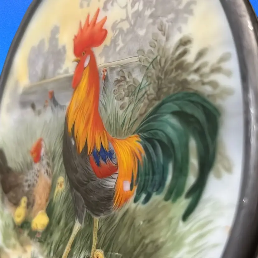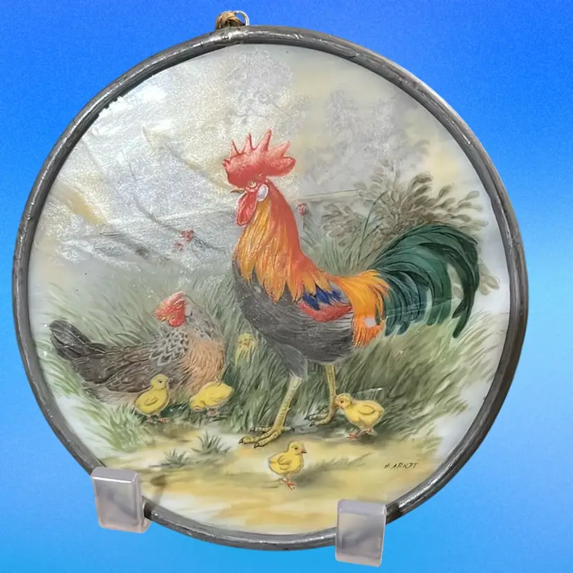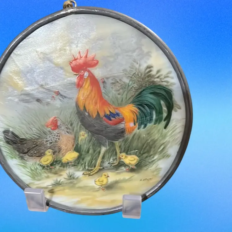 Hand painted Rooster And Family Picture On Slag Glass, Suncatcher, 4” Across, Beautiful Detail;signed
