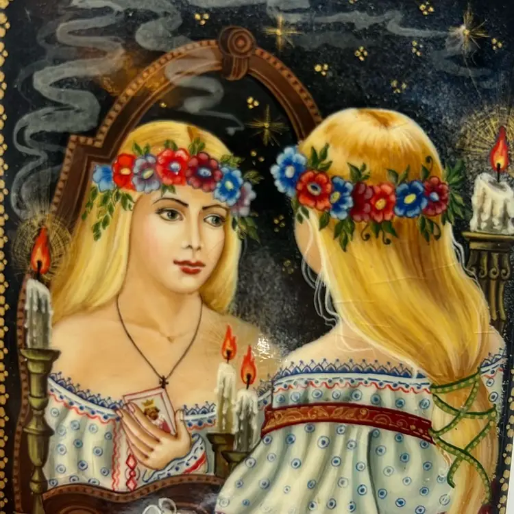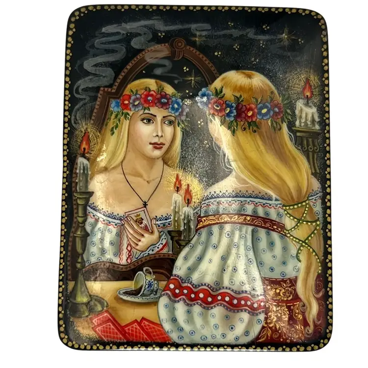 Absolutely stunning colors and painting of a lovely young woman with flowers looking in the mirror. It’s just beautiful. Signed on back.
