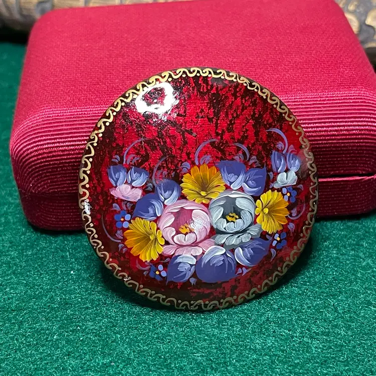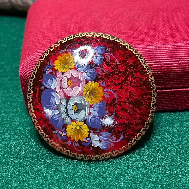 This beautiful round brooch is hand painted with lovely pink, blue and yellow flowers with a deep mottled red background and gold toned border. This is approximately 1-7/8 inches across.