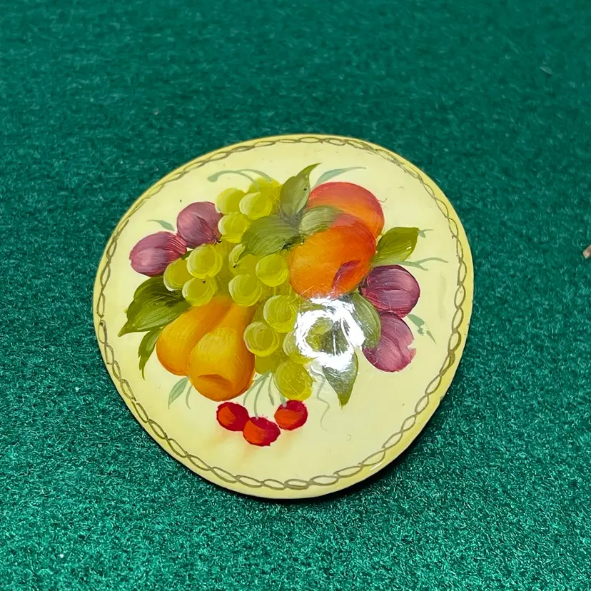 This lovely brooch is in great condition, still on its original card which is also in good condition. It is made of a lacquered wood and is about 1-7/8 inches across.
