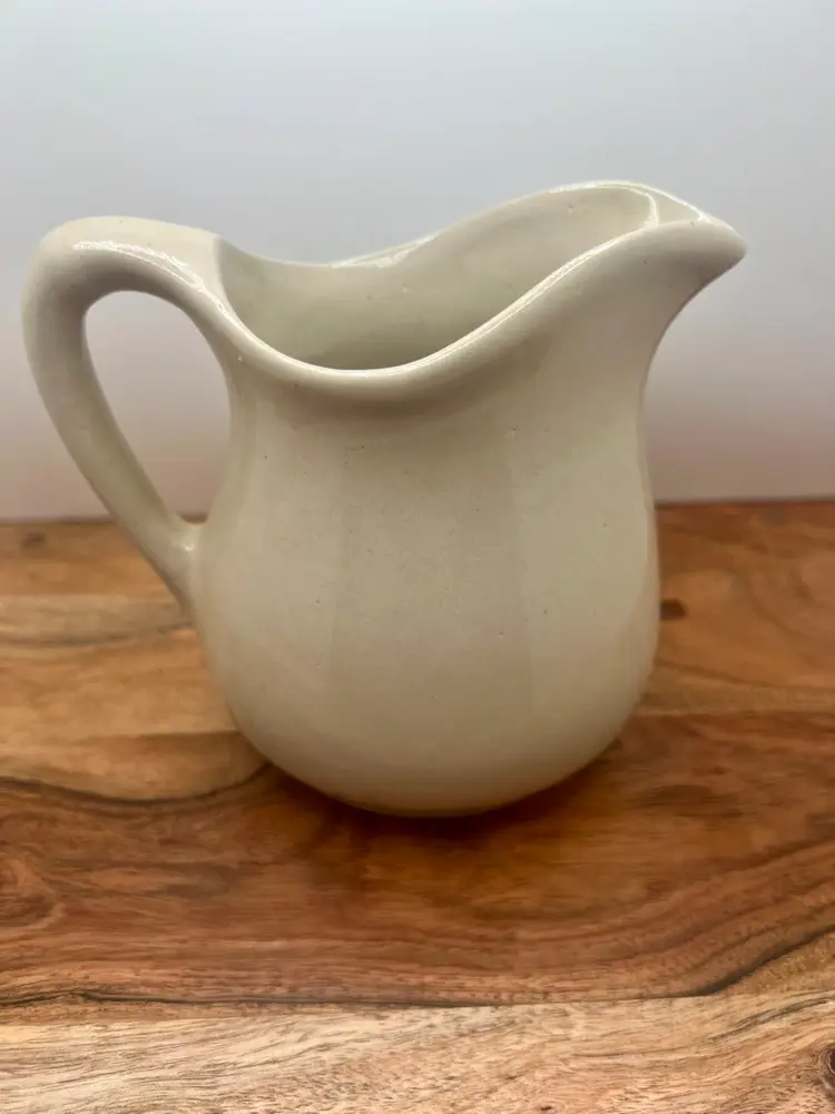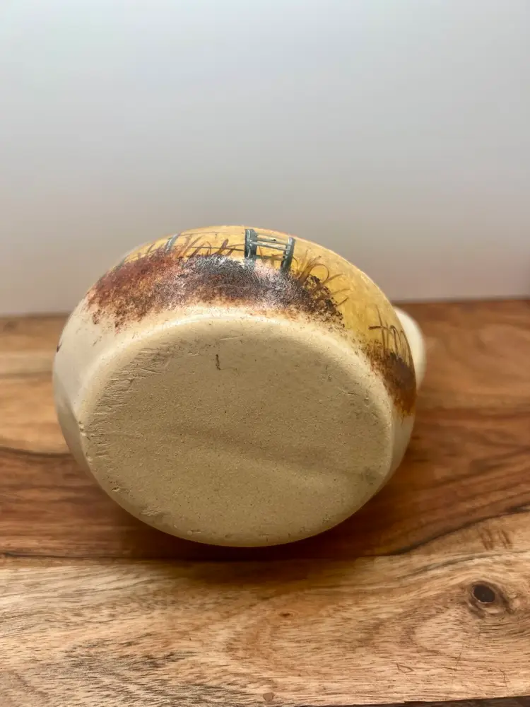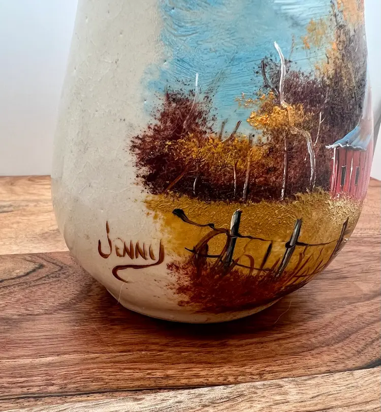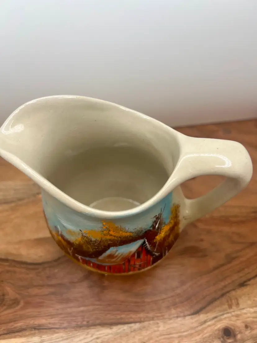 Beautiful hand painted fall barn scene on small pitcher, creamer. Artist signed. Excellent condition; no chips, cracks, or repairs.
