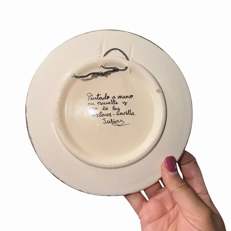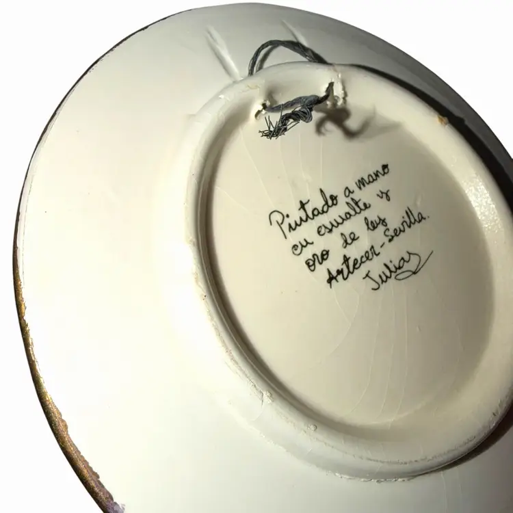 This indicates the piece was hand painted in enamel and gold in Seville, Spain and signed by the artist Julia.