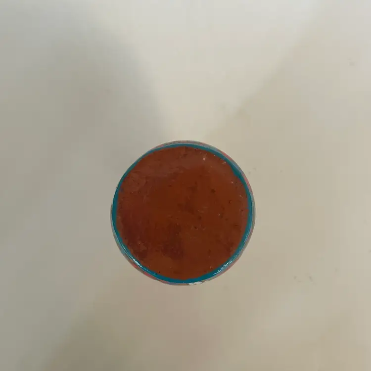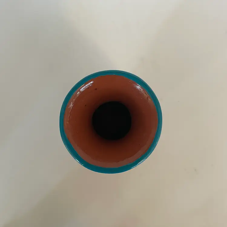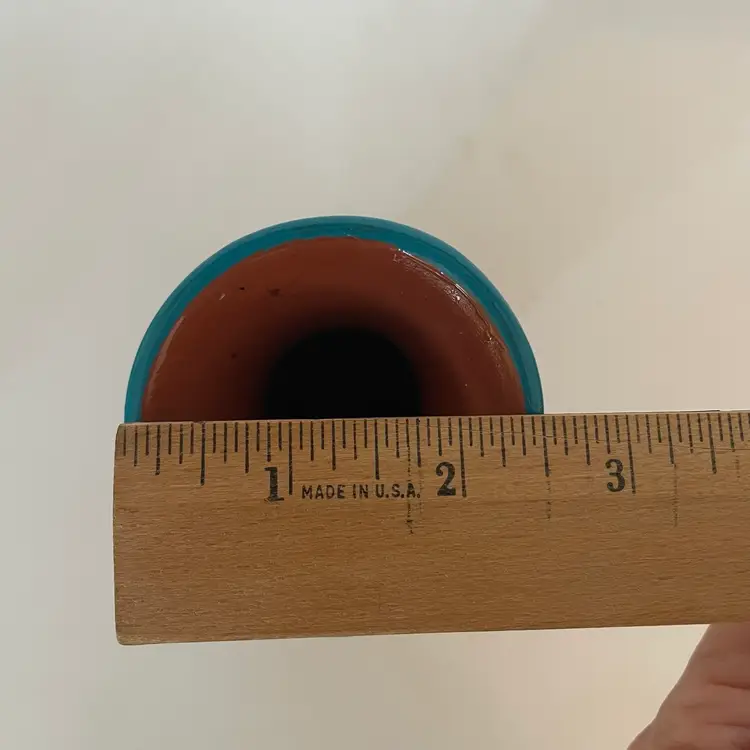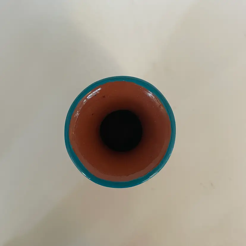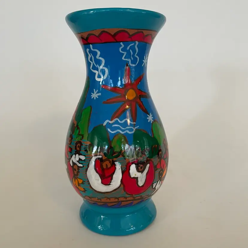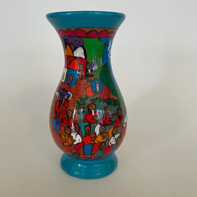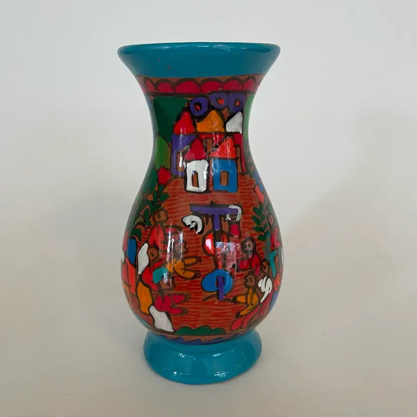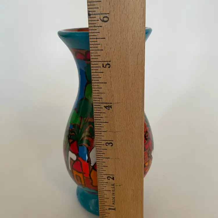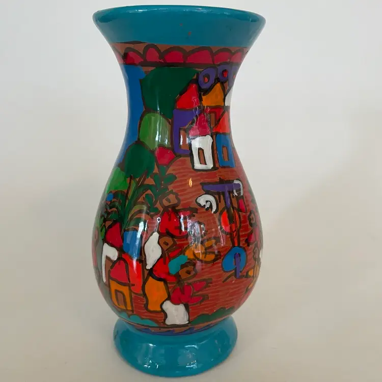 This very colorful terracotta vase is hand painted with a spanish village scene. It is 5.5” tall and the top is 2.5” diameter.