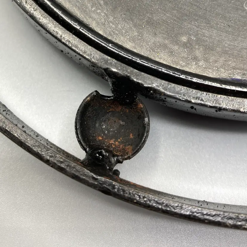 This wall hanging is in good condition. There is some wear to the metal and a manufacturing defect on a piece of the metal frame, clearly visible in the pictures. It measures approximately 8 1/2" tall x 7 3/4" across.