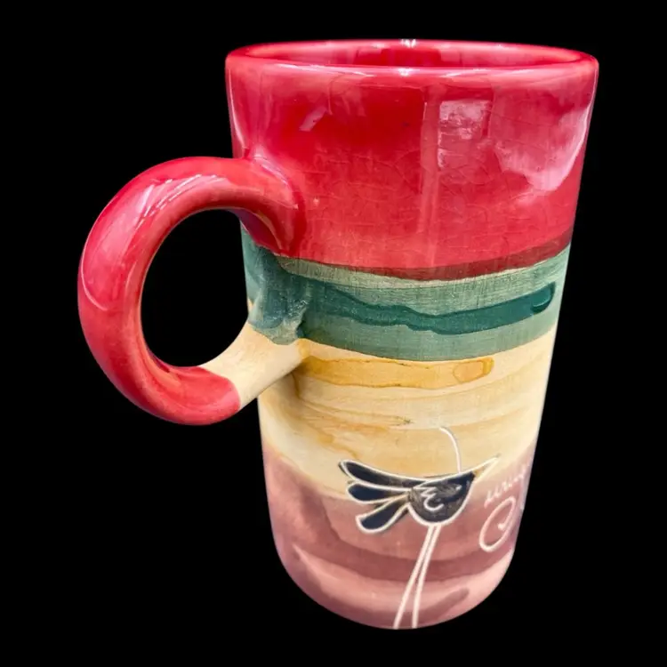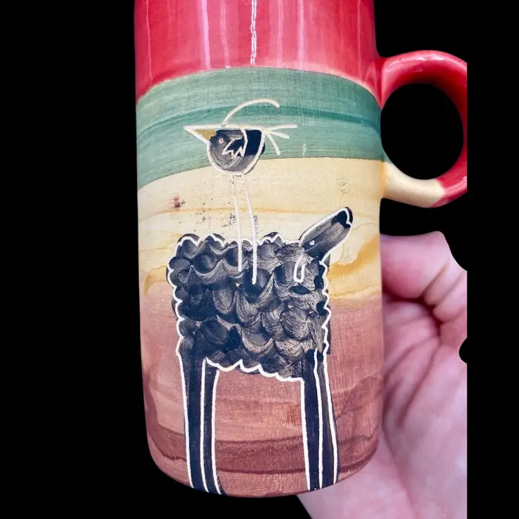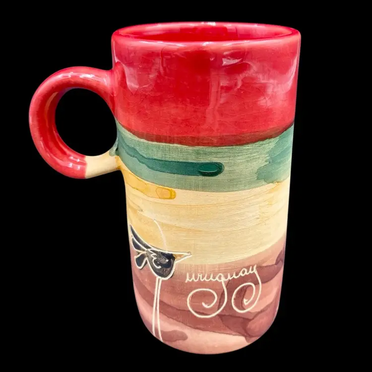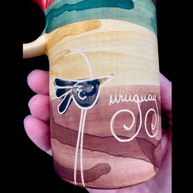 This hand-painted tall cup is a unique piece of art from Uruguay. It features an etched design of a bird standing on a sheep on one side; a solo standing bird on the opposite side; all painted with watercolor techniques. The cup is made of clay and stands at 4.5 inches tall with a width of 4 inches and an opening of 2 inches. In addition to the captivating design, this cup also has a painted handle for easy use. It is an original, handmade piece and perfect for those who appreciate the beauty of unique art. Enjoy your morning coffee or tea in this one-of-a-kind cup!