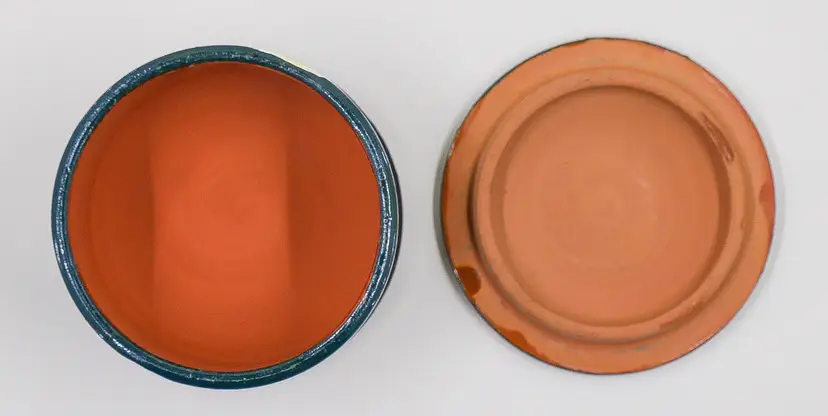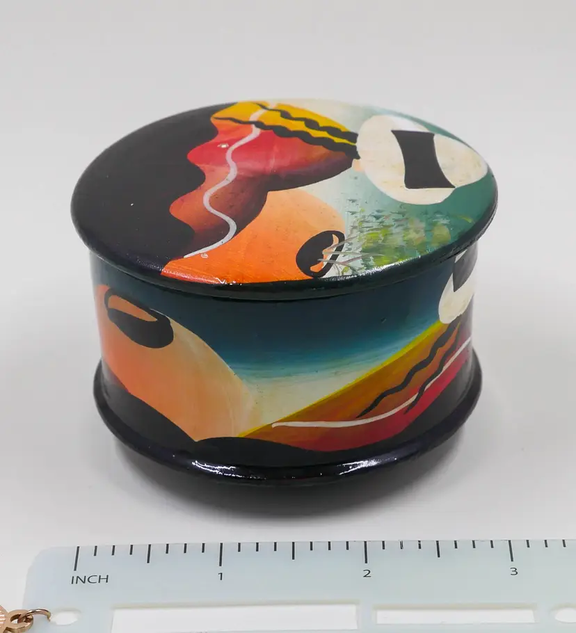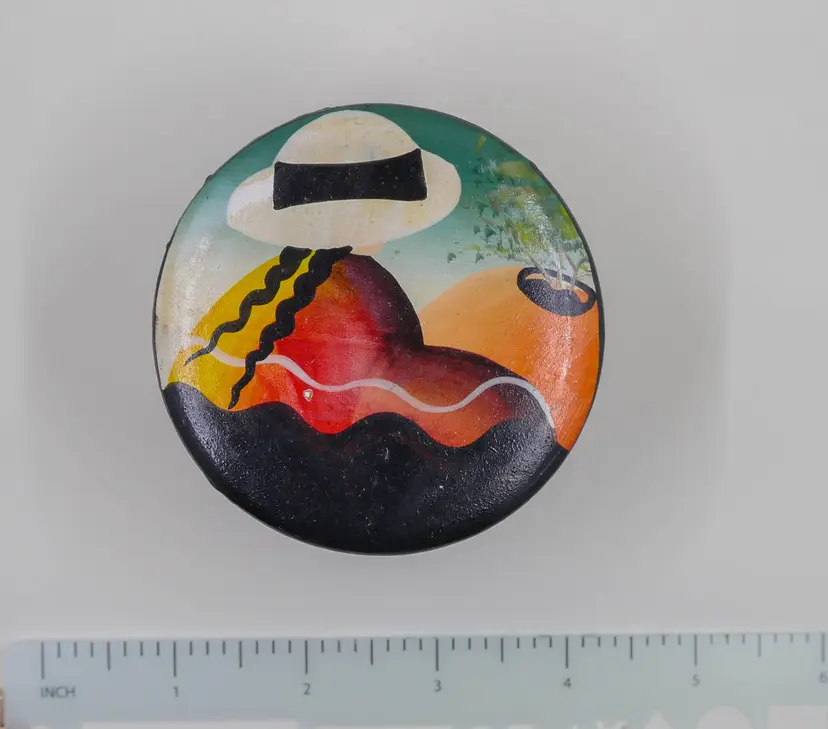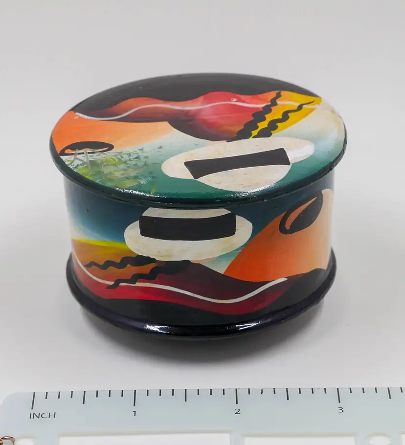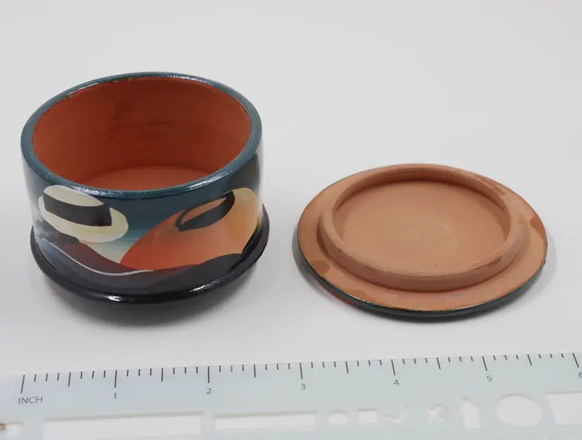 A round, red clay container with a matching lid hand-painted with a stylized landscape scene in abstract forms, featuring a figure wearing a large hat. This style is often associated with folk art or modern studio pottery from Latin America, particularly Mexico or regions with a strong tradition of terracotta craftsmanship. The inside of the container and the bottom of the lid are unglazed terracotta. There is no maker's mark or signature on the bottom. Approx. size: 3.25" wide x 2" tall.
