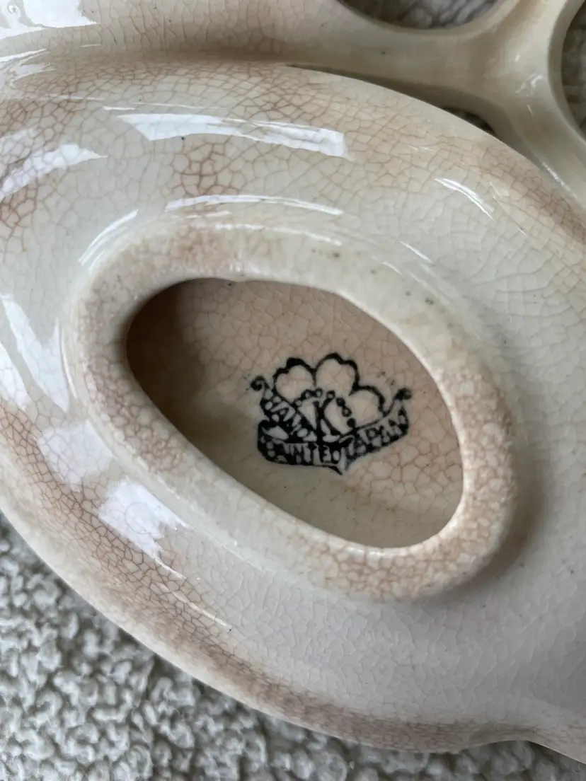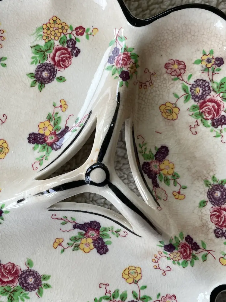 This vintage three section divided dish with flowers is a unique and charming piece made in Japan. The almost clover like shape and floral pattern add a touch of elegance to any table setting. Would be great as a trinket bowl for jewelry or candy.