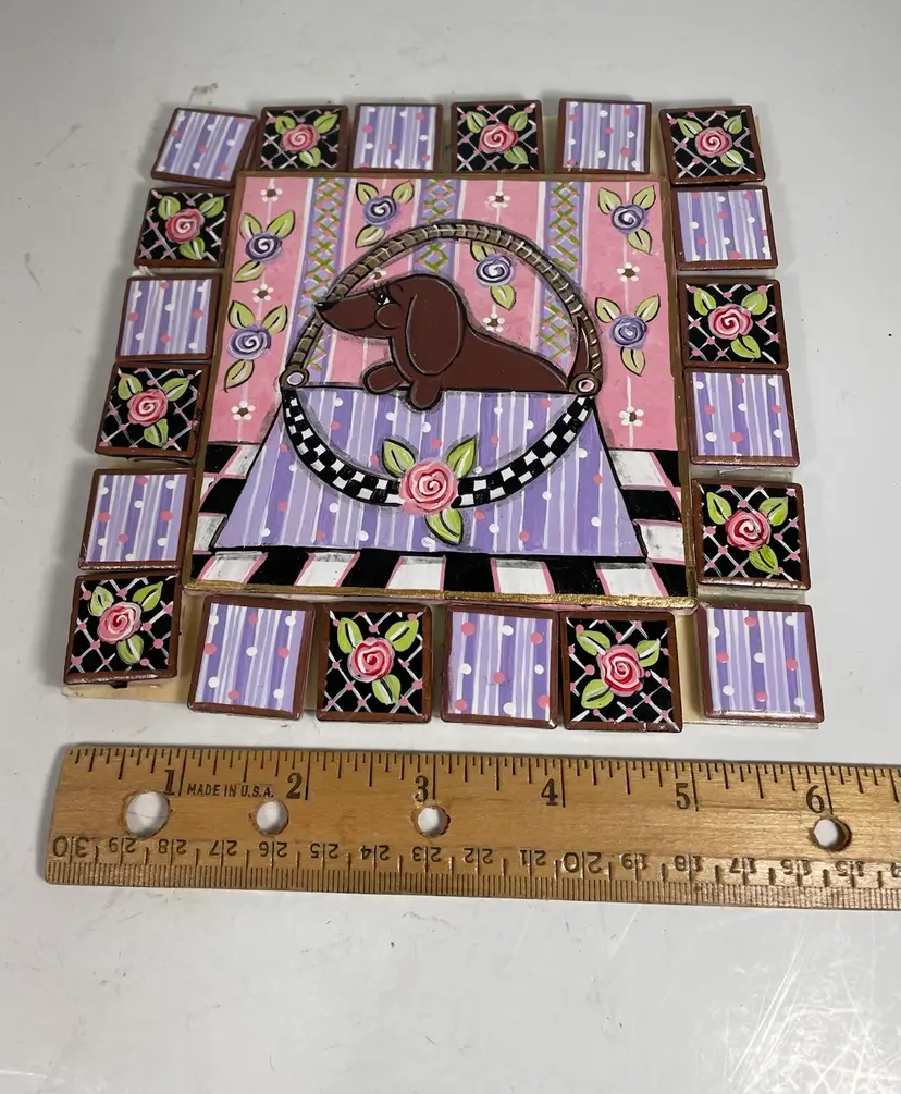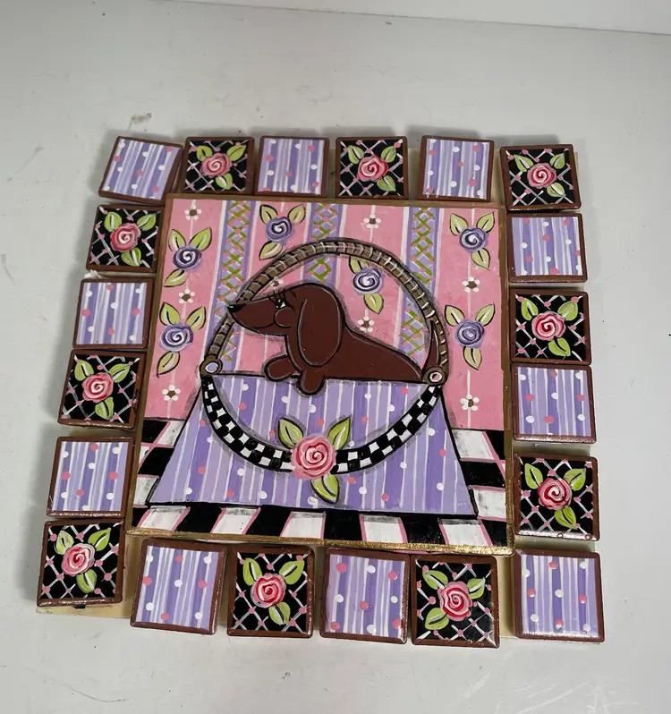 21 tiles. Mounted on sticky backed cardboard. Large tile 4” x 4.25”, small tiles .75” x .75”.