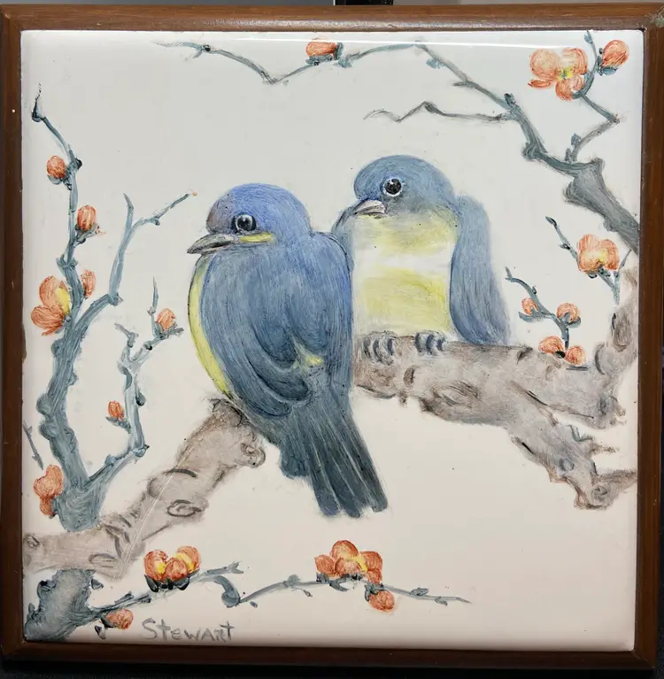 Size: 6.75" x 6.75" This hand painted ceramic tile/wall hanging features a charming design of two birds perched on a branch. The artwork is signed by the artist, Stewart, adding a personal touch to the collectible piece. Handmade with attention to detail, this unique decorative item would make a lovely addition to any bird enthusiast's collection or as a special gift for someone who appreciates nature-inspired artistry.