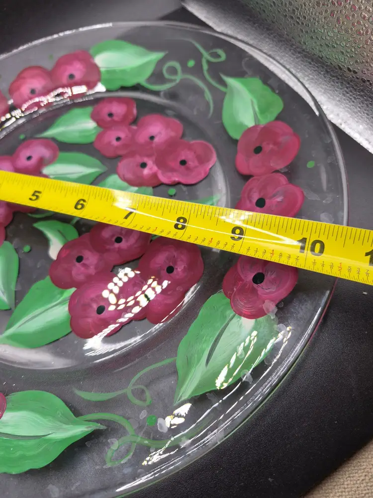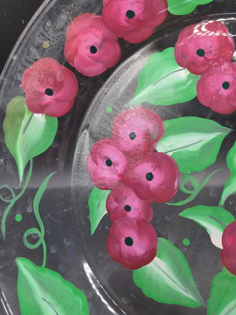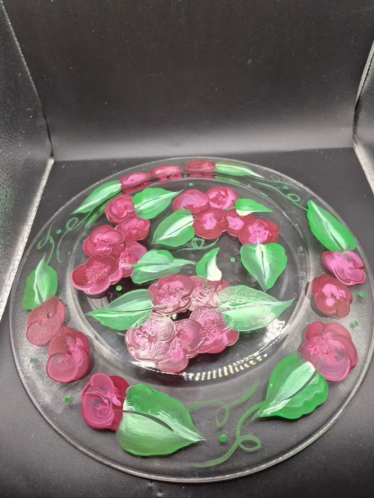 • Intricate hand-painted floral design • Clear glass base with raised decorative elements • Delicate pink and green color palette • Unique artistic botanical rendering • Collectible decorative piece