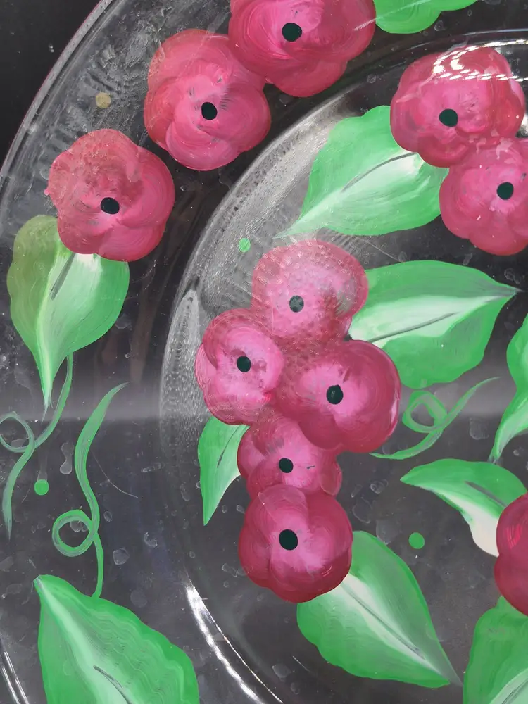 In the quiet corners of an antique shop, nestled between forgotten treasures, this exquisite hand-painted glass plate whispers stories of delicate craftsmanship. Pink blossoms dance across its surface, each petal lovingly rendered with soft brushstrokes, surrounded by curling green leaves that seem to breathe with ethereal life. The flowers cluster like intimate conversations, their dark centers watching silently, while gentle vine-like tendrils connect each bloom in a graceful botanical narrative.