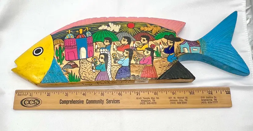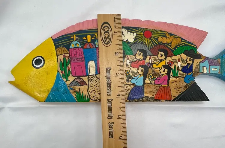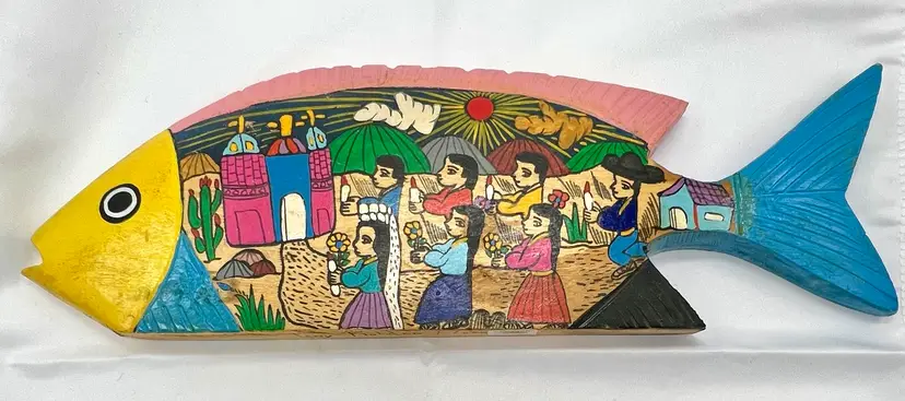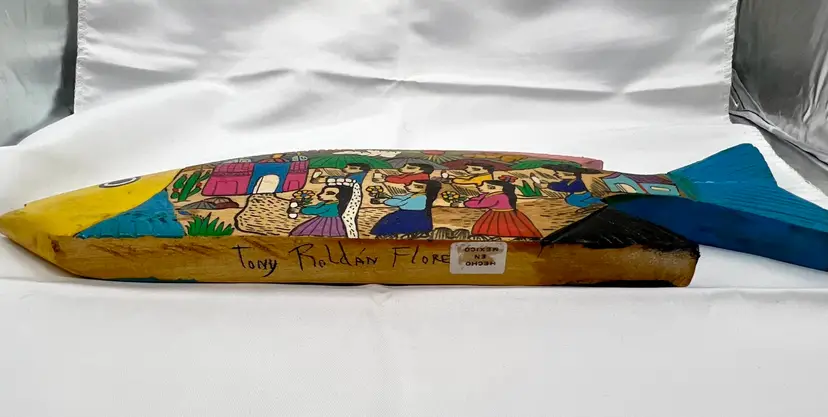 This beautiful hand-painted fish sculpture is a stunning addition to any collection. Created by the talented artist Tony Roldan Flores, this piece features two scenes in colorful folk art style. The sculpture is made of wood and painted with intricate details, measuring 14 inches long and 4 1/4 inches wide. The sculpture is signed by the artist on its base, and would make a unique and beautiful addition to any collection of folk art or Mexican art. Condition is used. Please review all pictures.