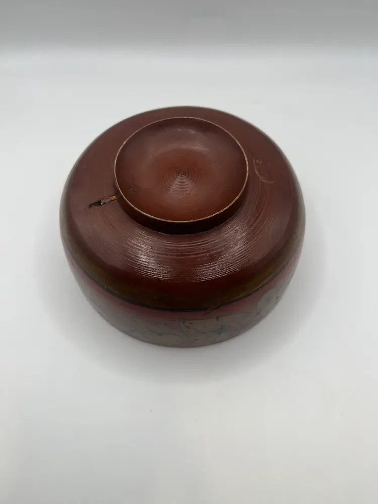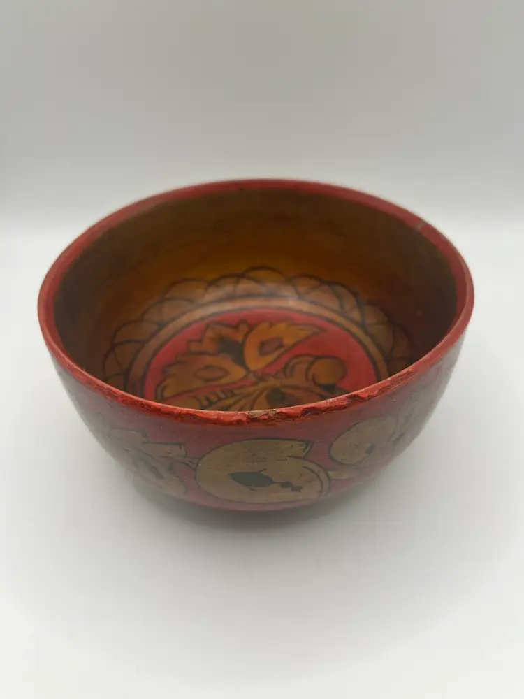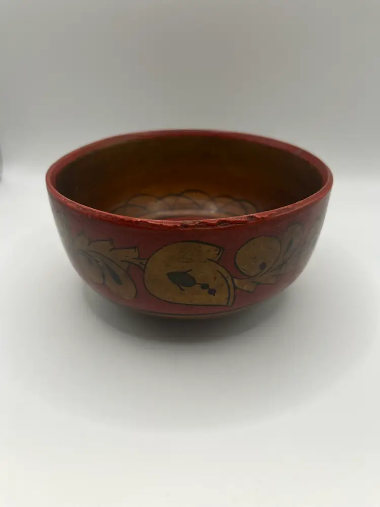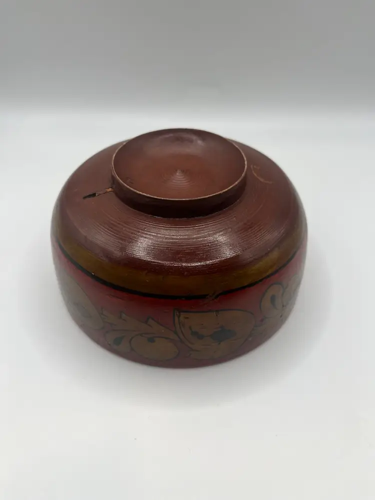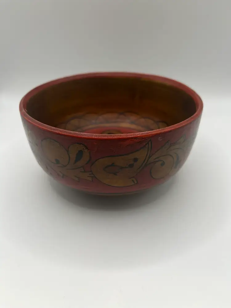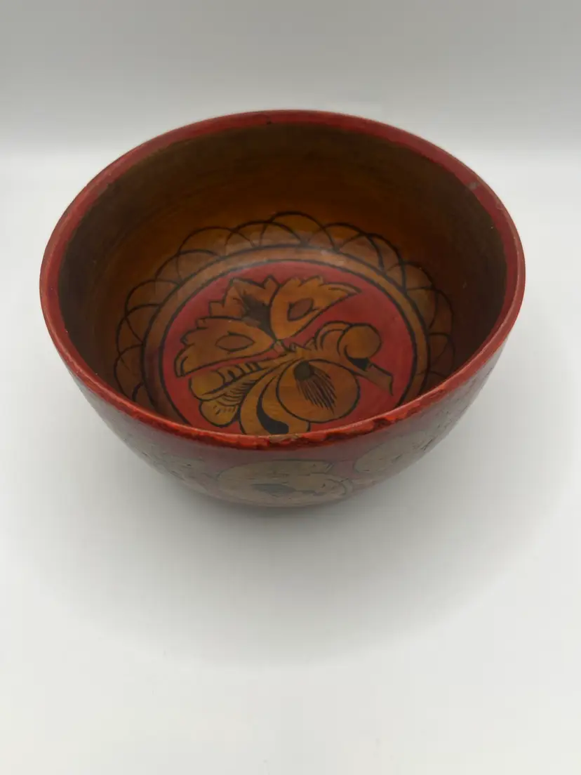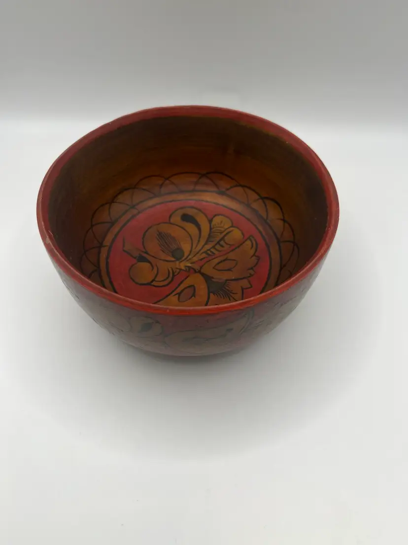 This is a vintage, hand-painted wooden bowl from Russia, likely crafted in the 1960s. It is an example of Russian folk art, possibly in the Khokhloma style, known for its vibrant colors and floral or berry motifs. It is in good vintage condition . It is stamped on the side , Made in Russia but is very hard to see and photograph. It is 5 1/4” across