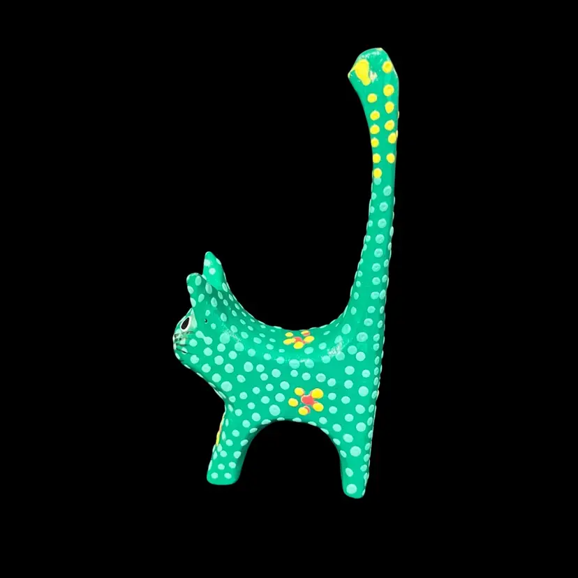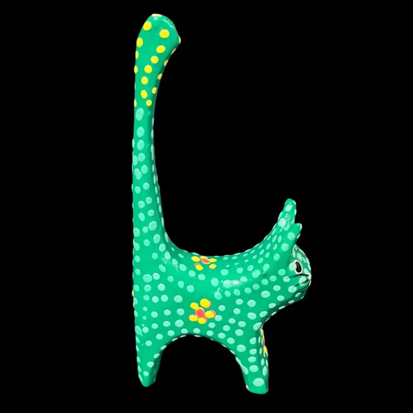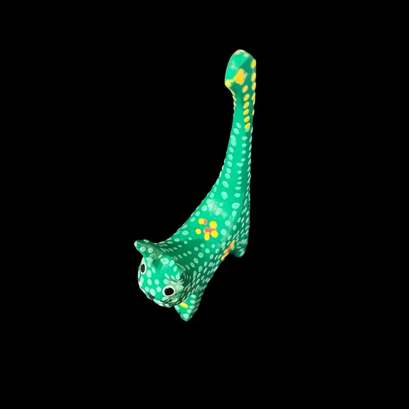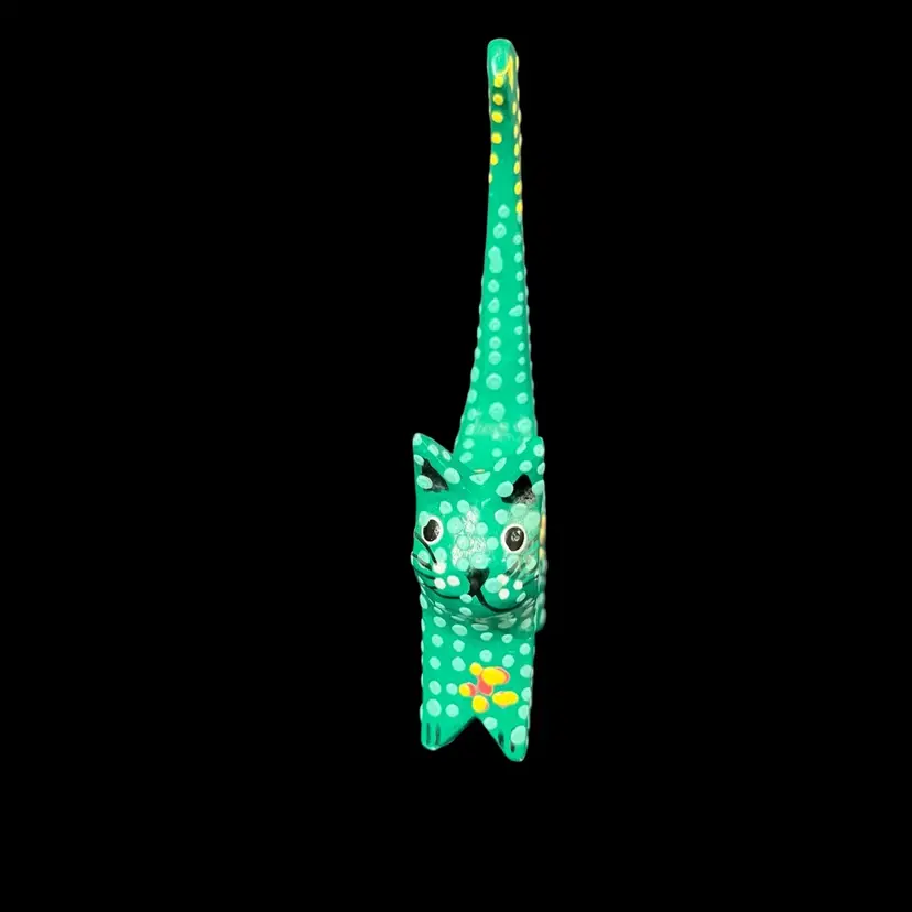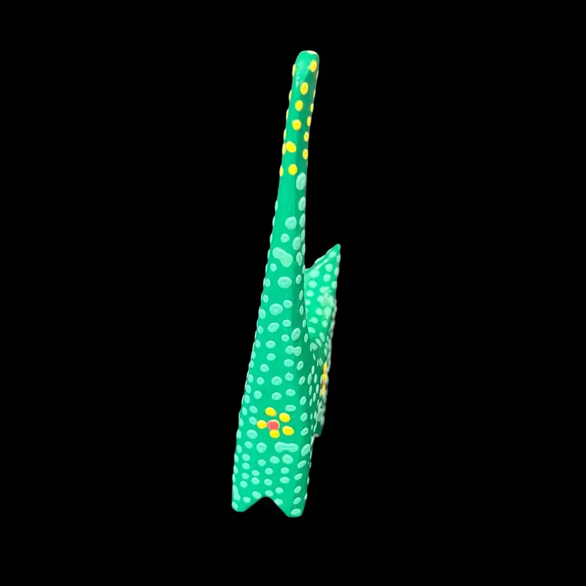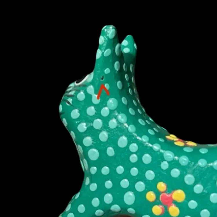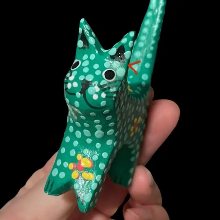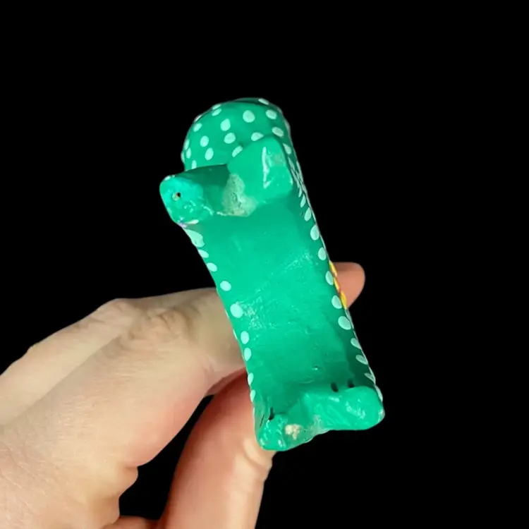 Approximately 2.25” x 0.75” x 4.5”. No chips or cracks. The second to last photo shows where there’s some slight fogginess in the lacquer by the left ear and the last photo shows a small fleck of missing green paint behind the left ear.