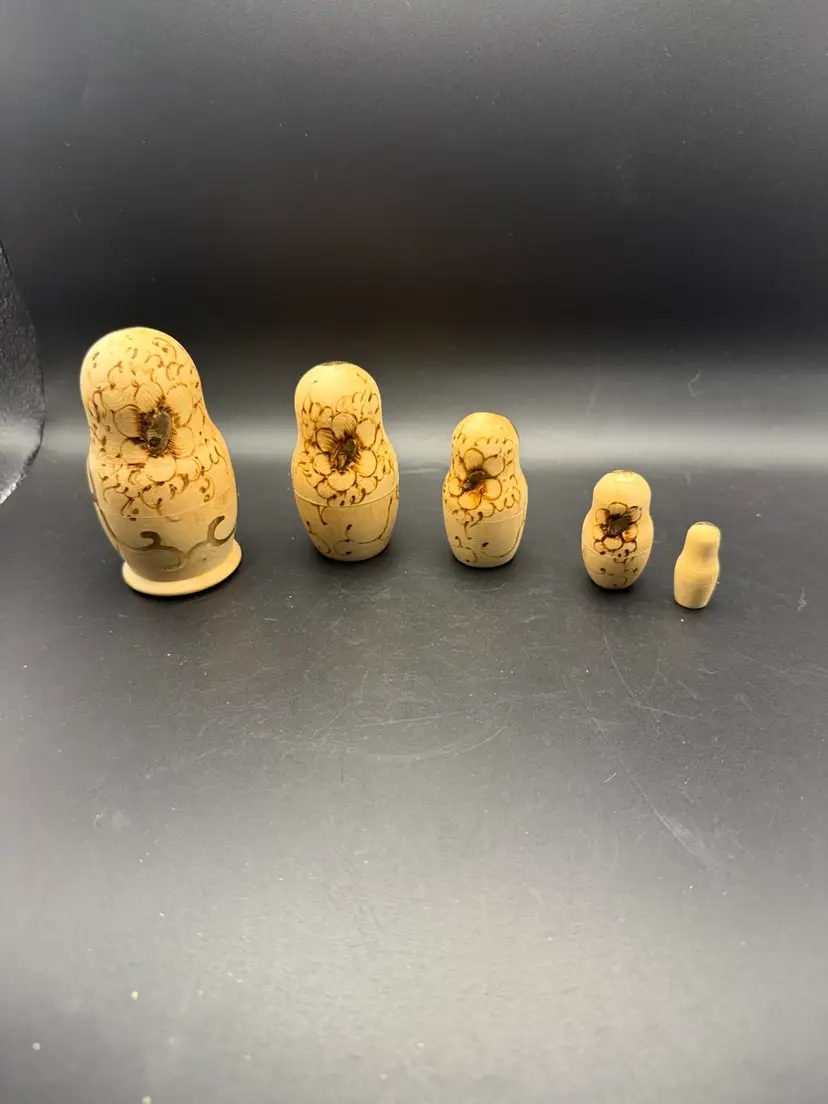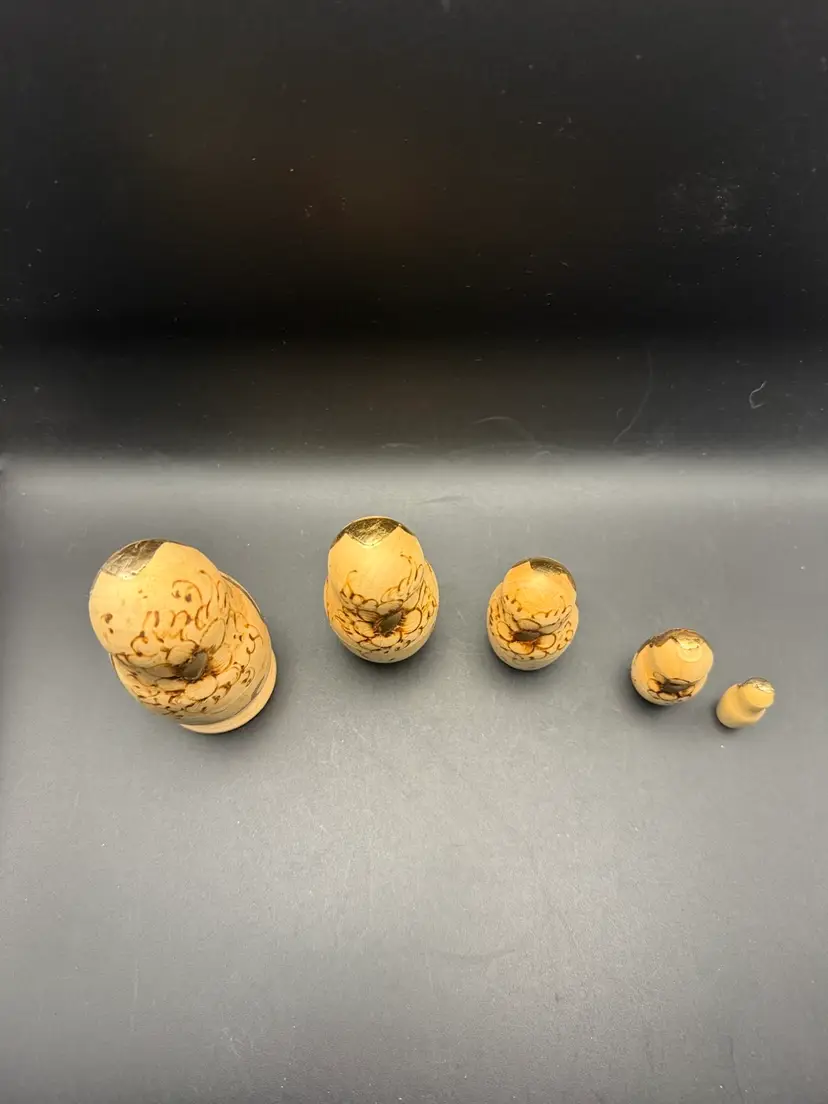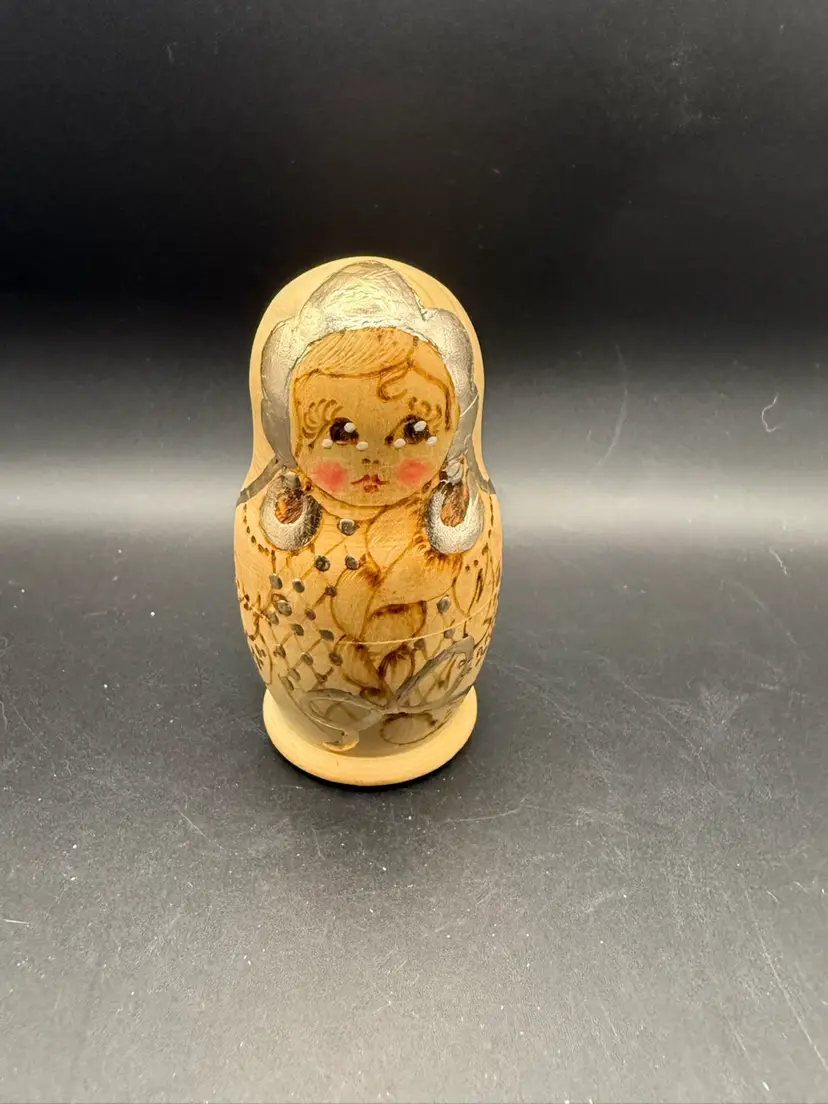 Matryoshka dolls, also known as Russian nesting dolls, are a set of wooden dolls of decreasing size placed one inside another, reminiscent of Russian folk art and culture, often depicting peasant women in traditional dress. These dolls are made from linden wood and are hand-painted, with each doll in a set being separable from the others to reveal a smaller doll inside.