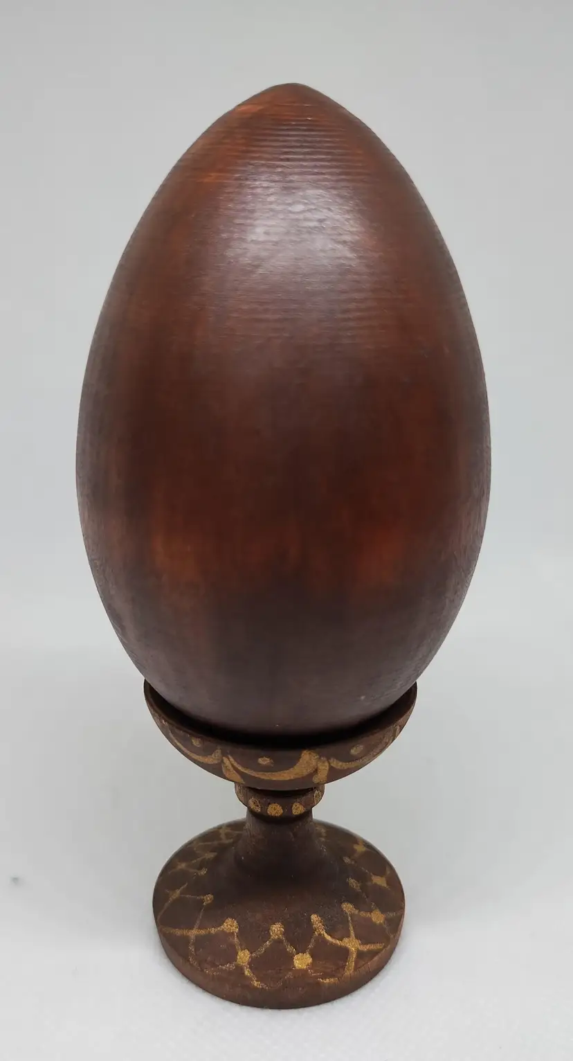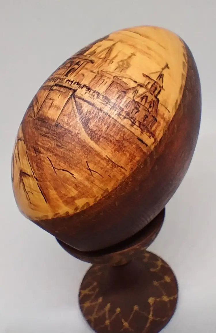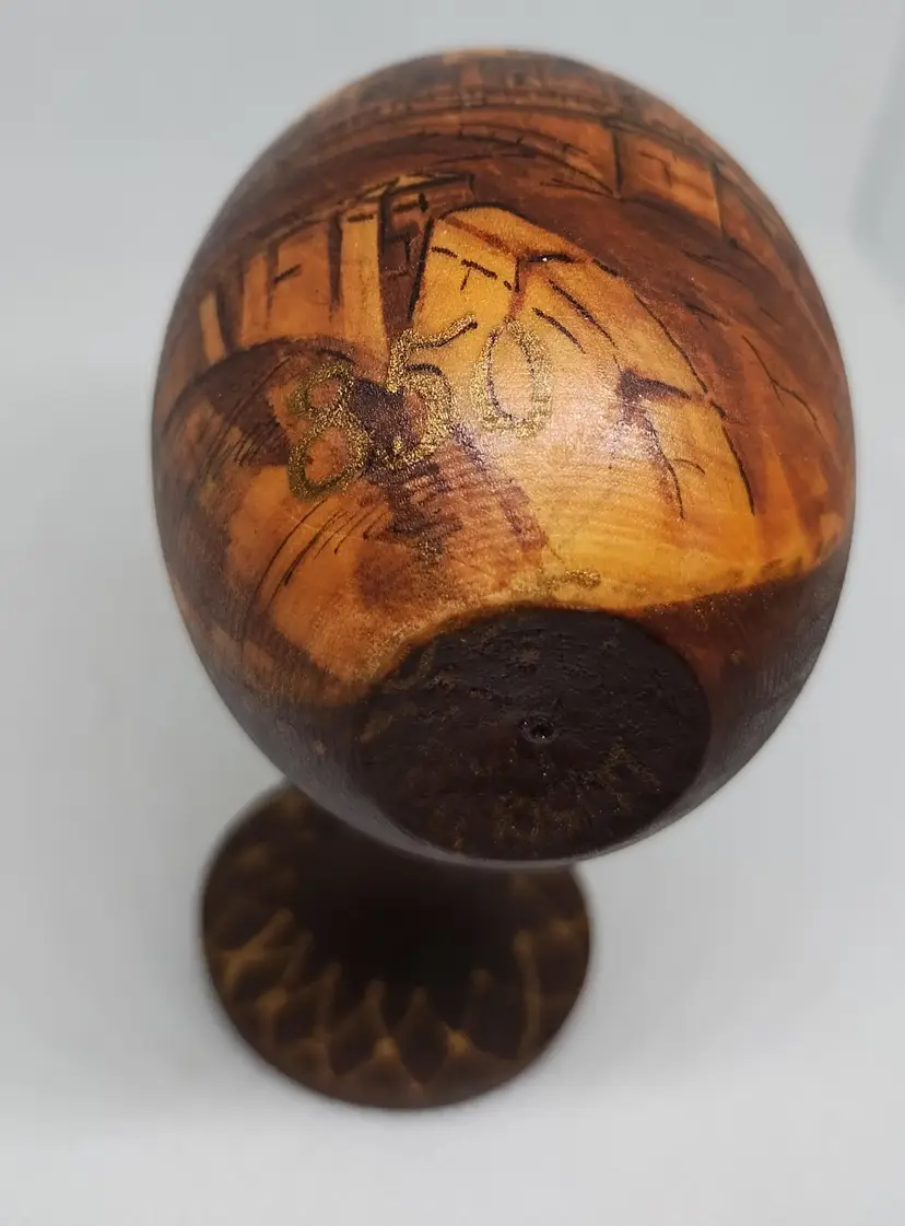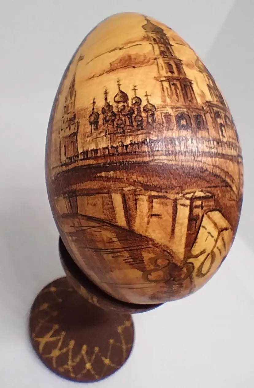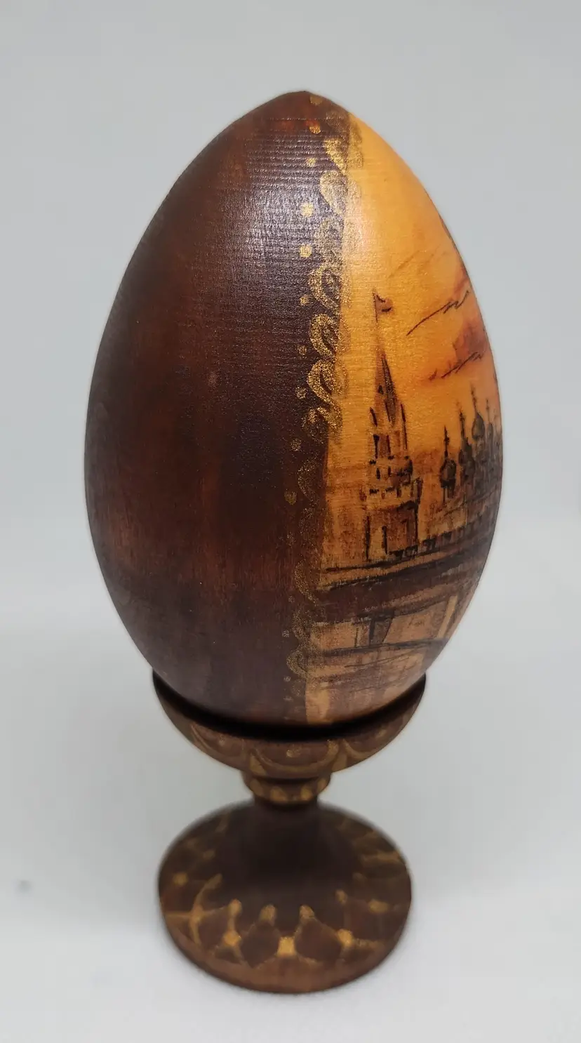 Gorgeous wooden egg decorated with the St. Petersburg skyline. Both the egg and stand are signed and the egg has "850" at the bottom of the image. Egg is 3 inches tall, with the stand it sits at 4.5 inches tall.