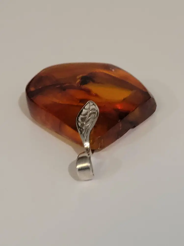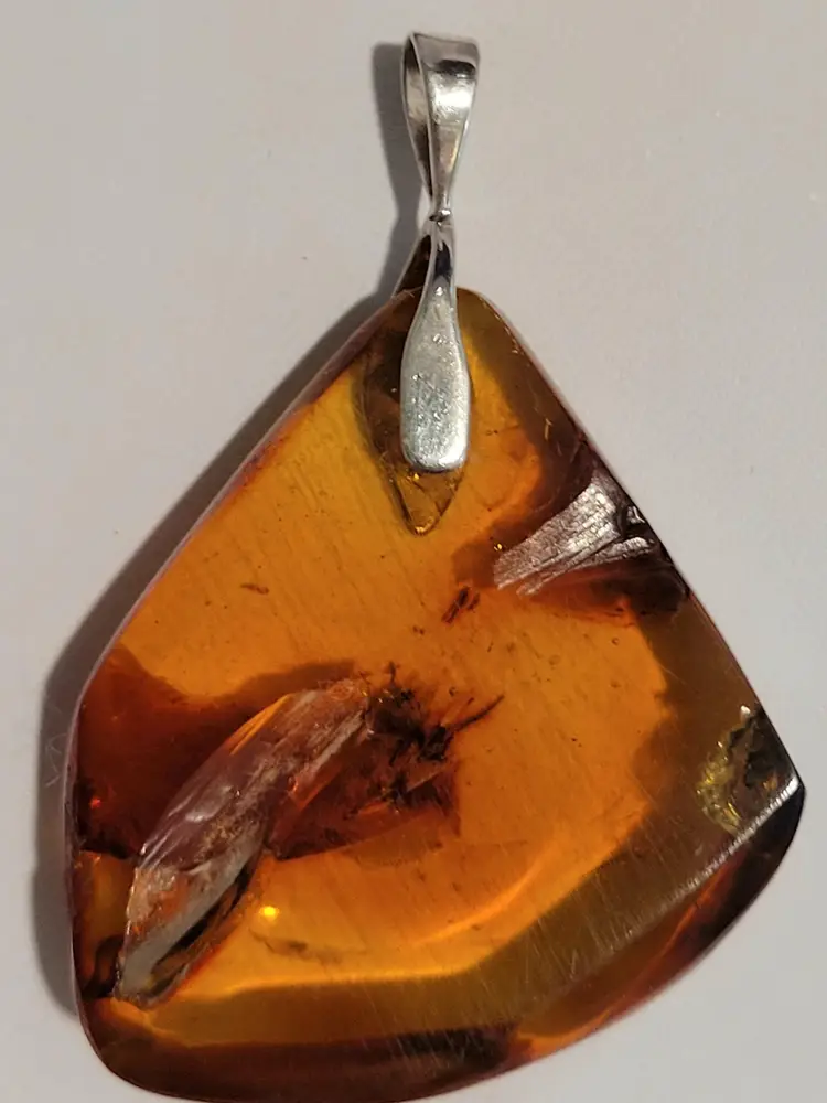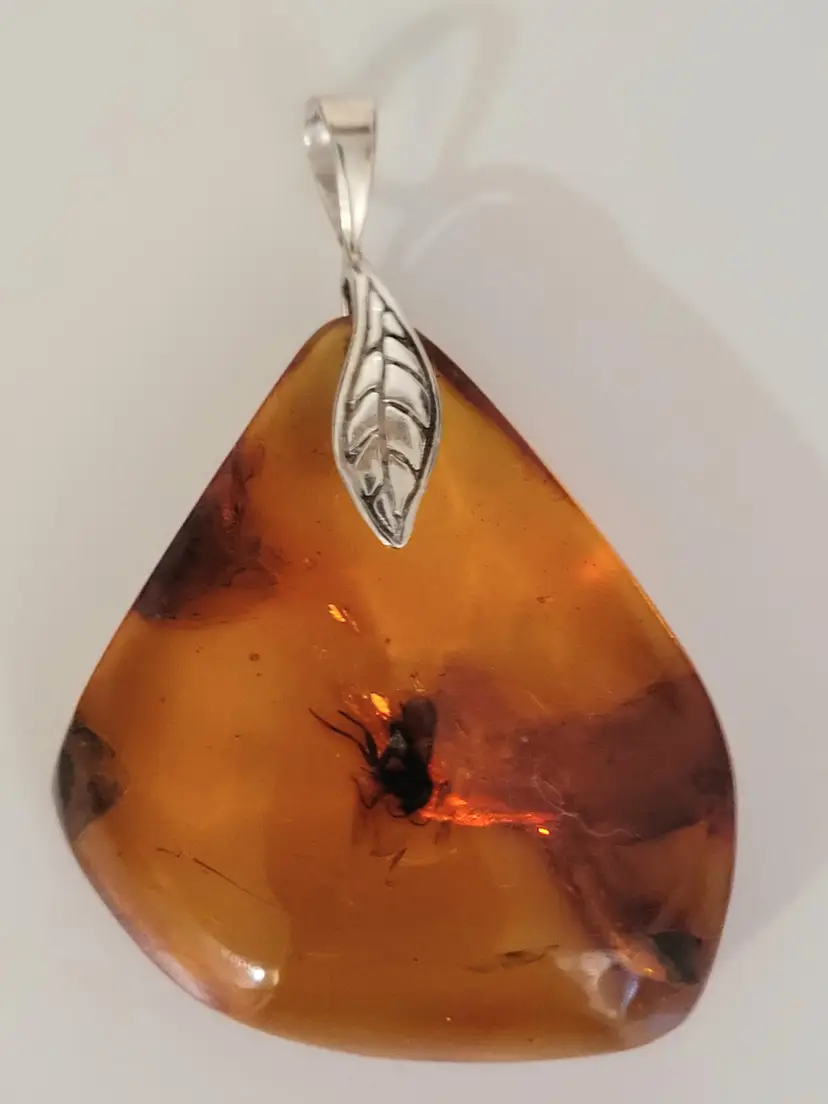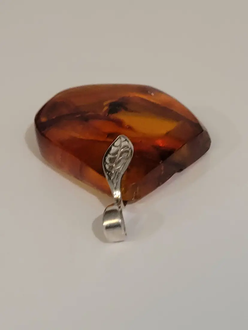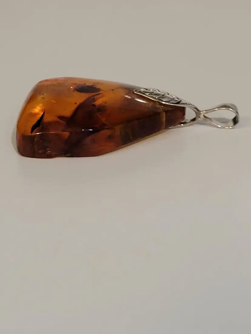 This beautifully hand polished Baltic Amber pendant has an inclusion, a FLY. There is a sterling bail so you can attractively attach to a sterling chain. The pendant sits nice and flat around the neck. Baltic Amber is 34 - 48 million years old. The main deposits of Baltic Amber are on the southern shores of the Baltic Sea. Measurements; 1.5" long with the bail, without the bail, just over 1" 1.25" wide at the widest point