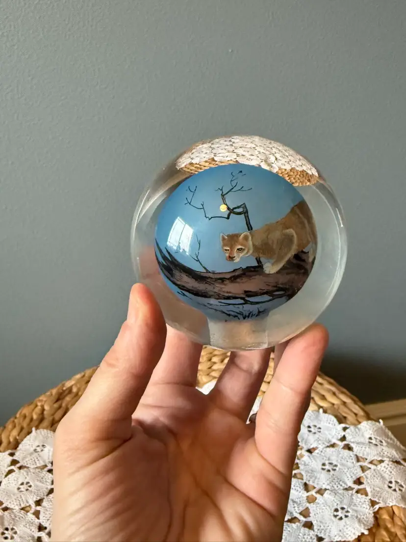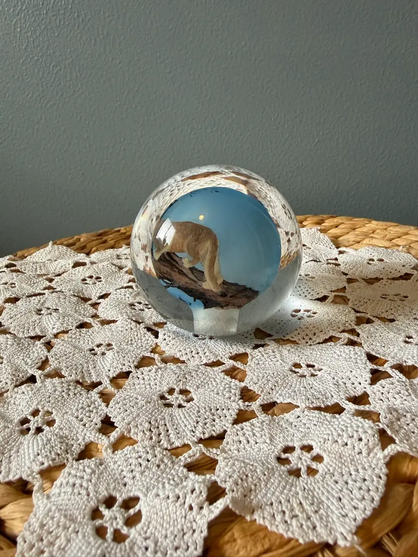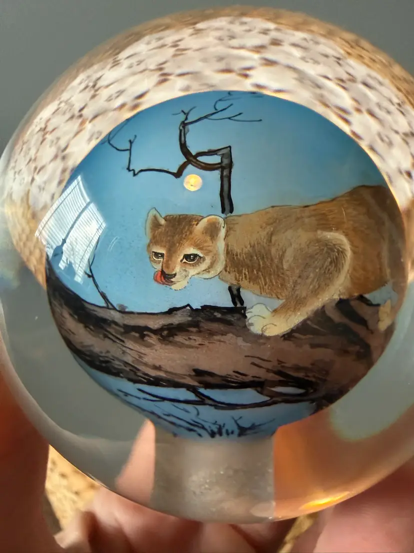 This striking hand-painted art glass paperweight features a beautifully detailed cougar (mountain lion) set in a natural landscape scene. The artwork is encased in clear glass, creating depth and dimension from every angle.