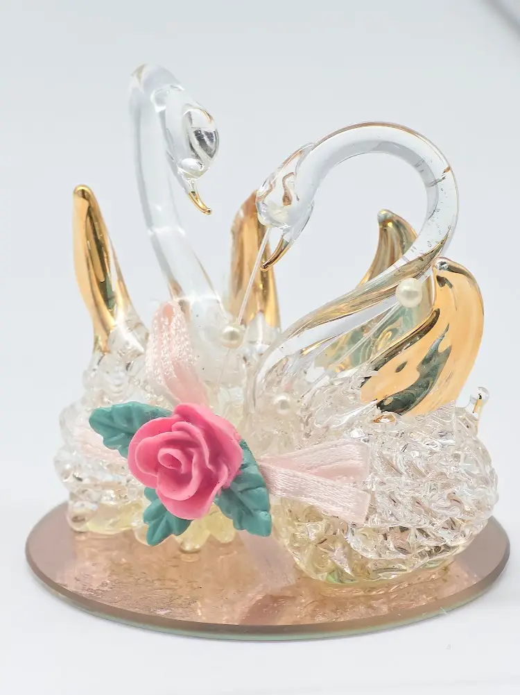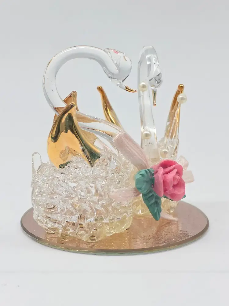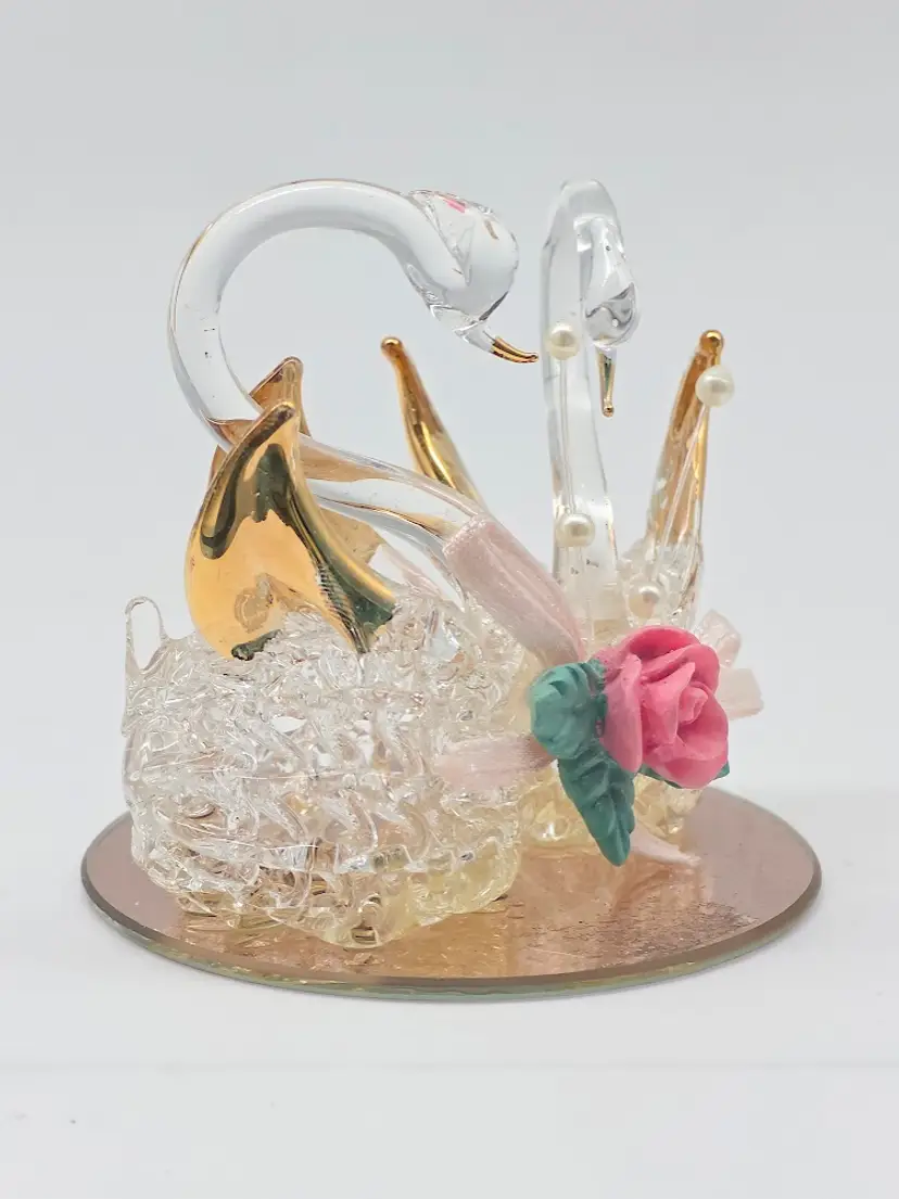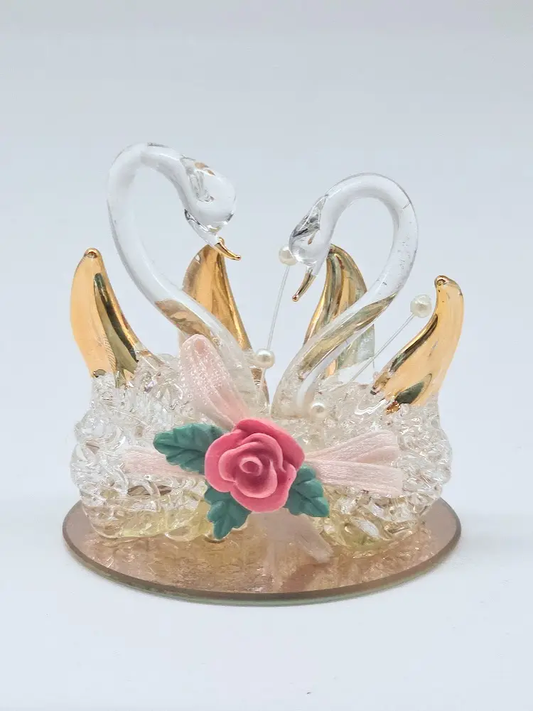Vintage 1990's spun glass pair of swans mounted on a mirror base with resin rose decoration. Perfect for wedding decor or cake topper.