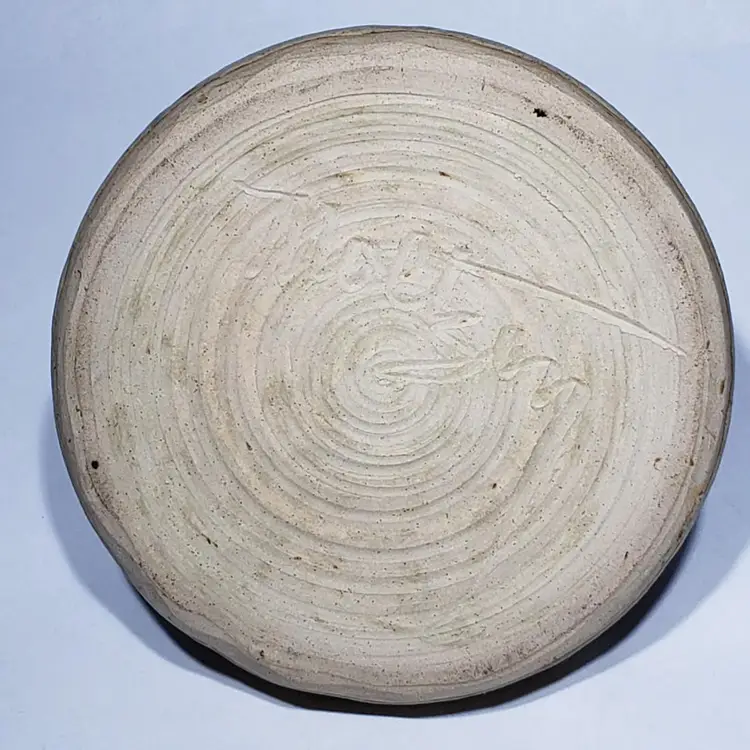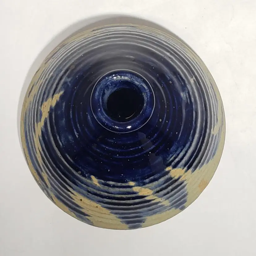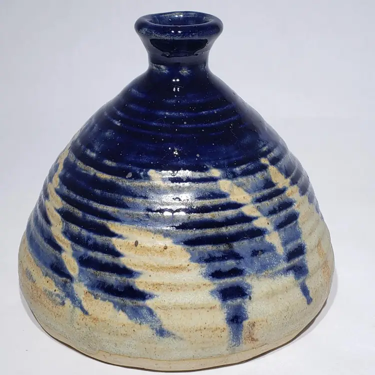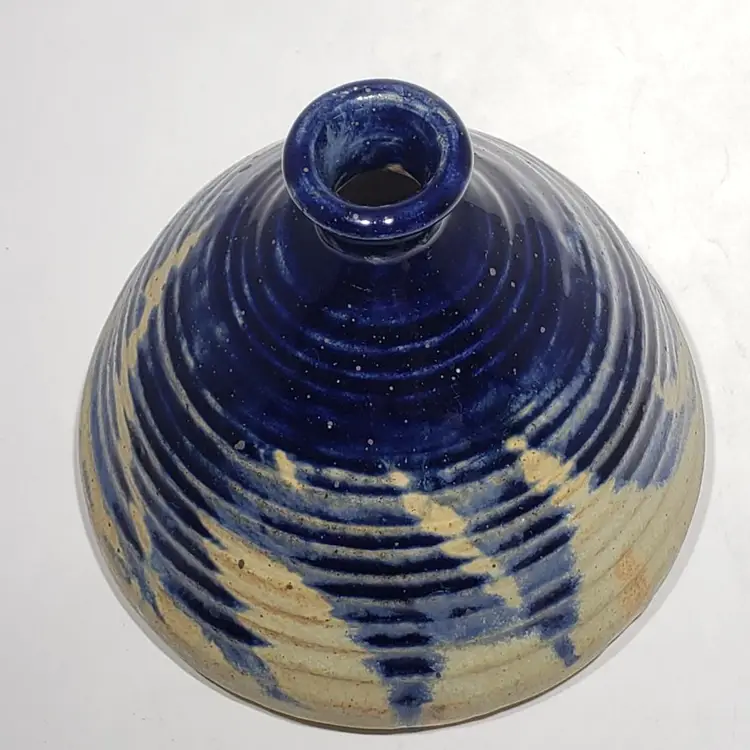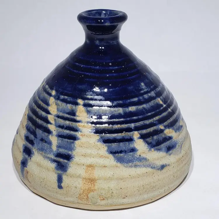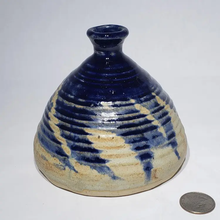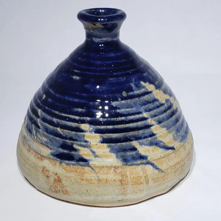 Hand Thrown Pottery Blue Ribbed Bud Vase Artist Signed: Moltzen? Measures: 5" x 5" x 4"