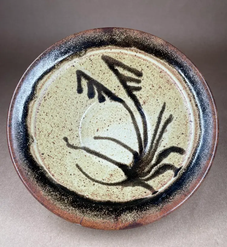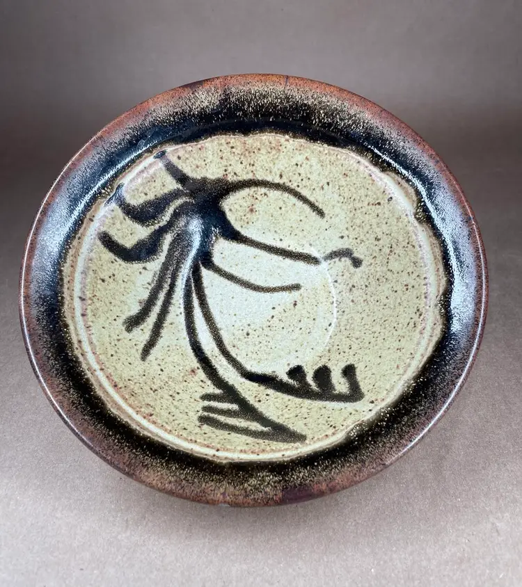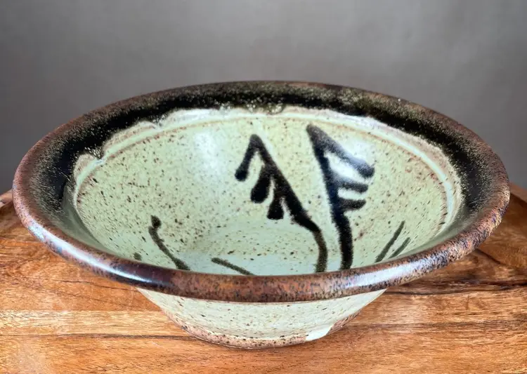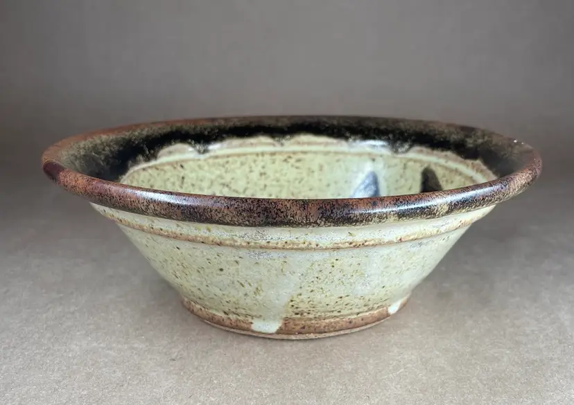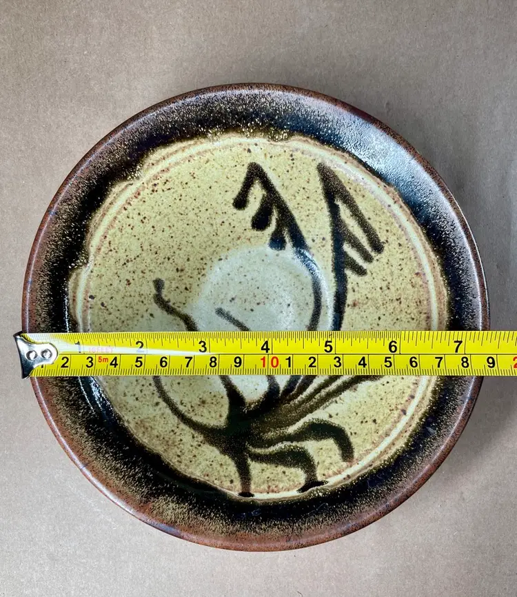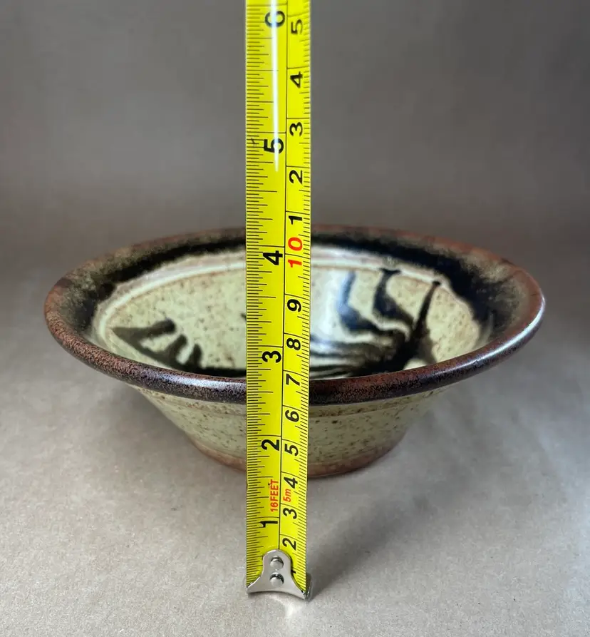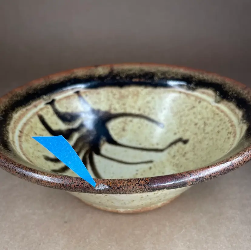 See photos for condition and measurements. Blue painter's tape points to 2 chips in the glaze. No cracks.