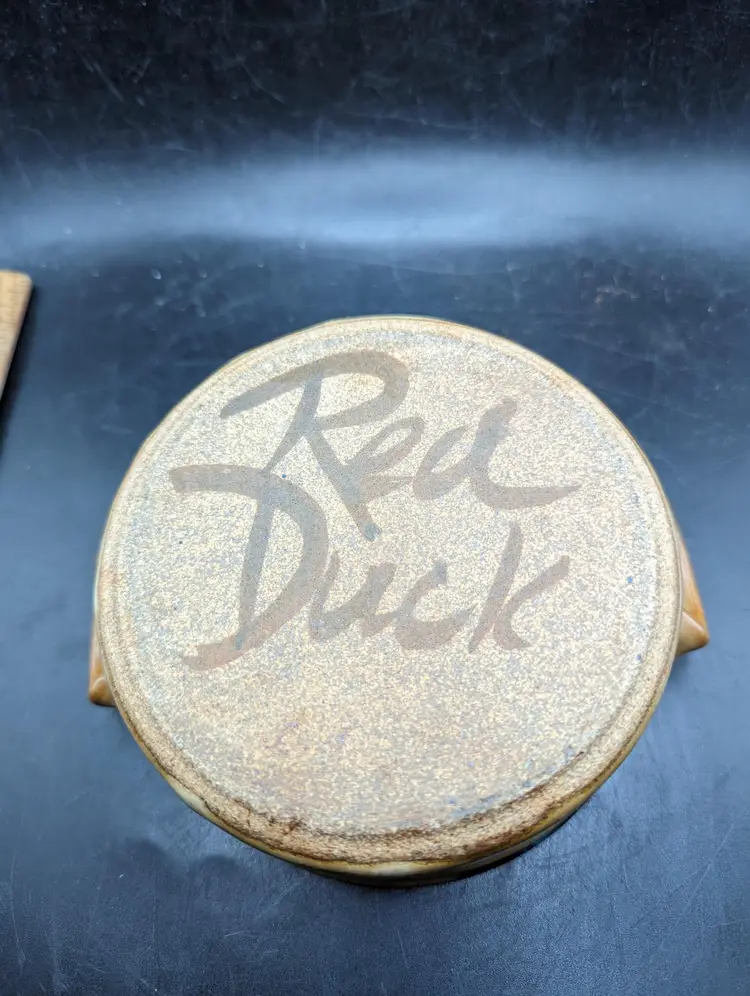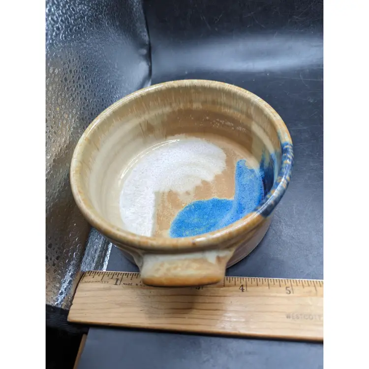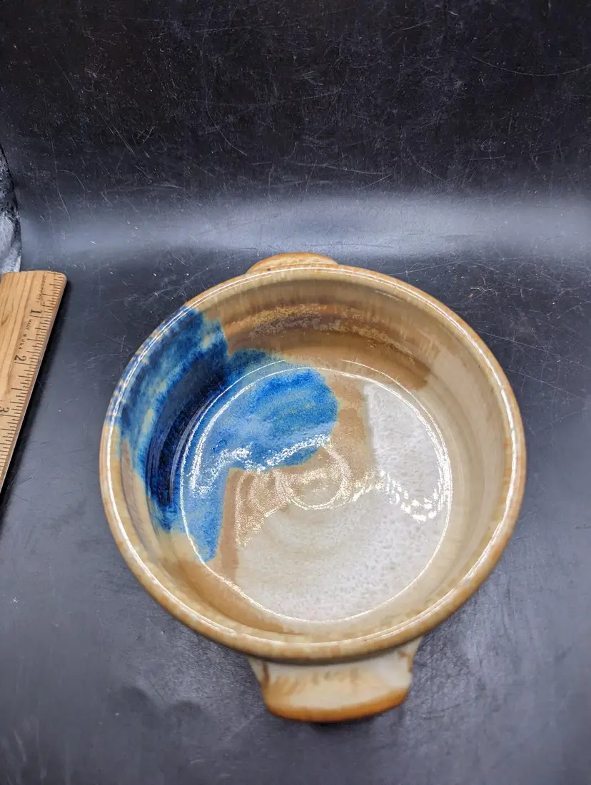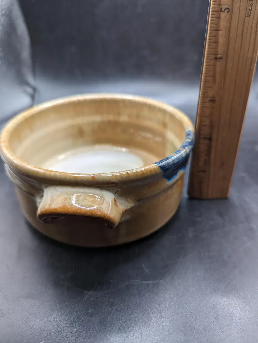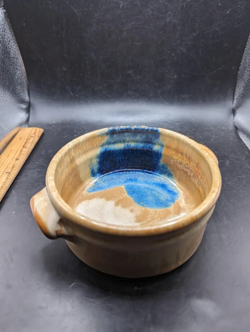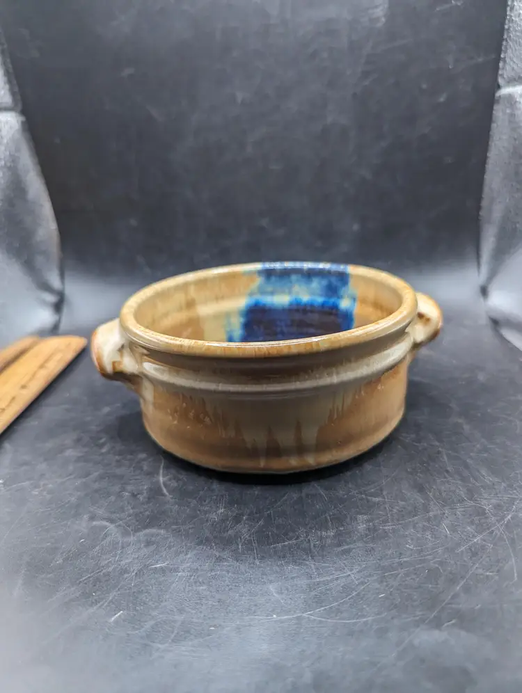 Add a touch of rustic charm to your kitchen with this handcrafted stoneware pottery bowl. Featuring unique glazing and convenient handles, it's perfect for serving or as a decorative piece. Please see all photos for details and condition.