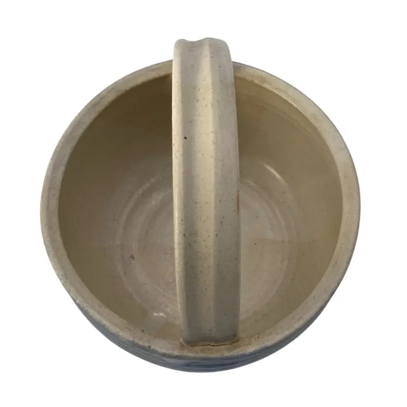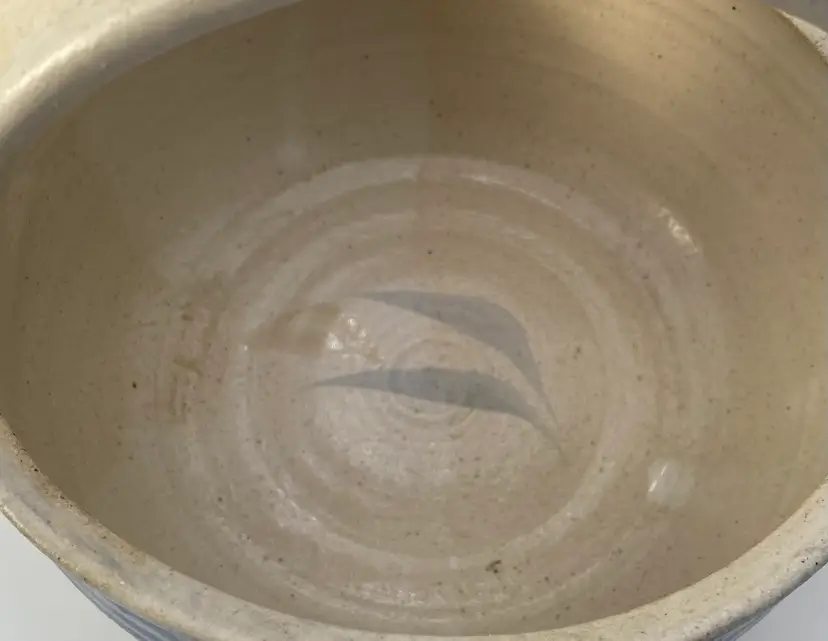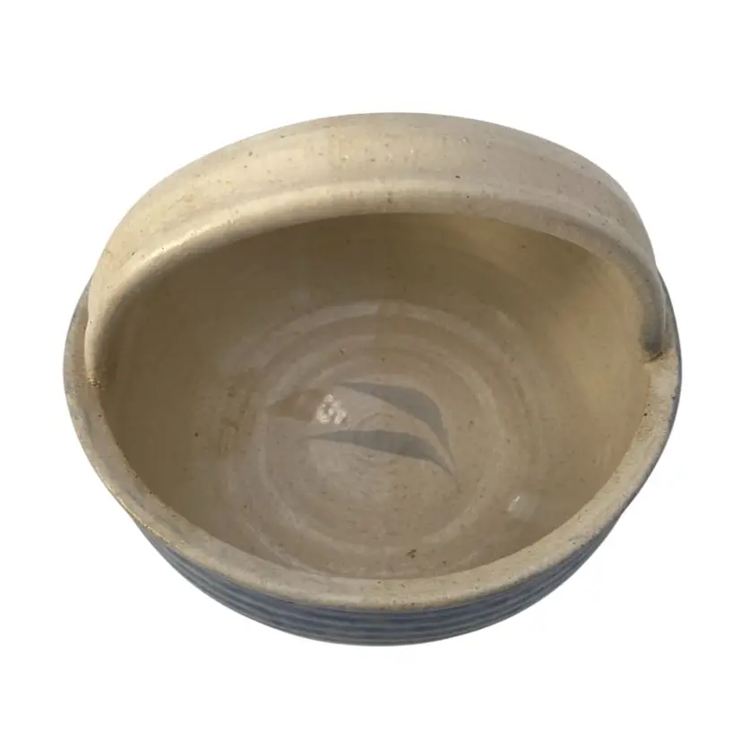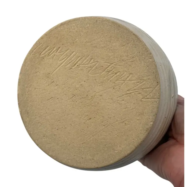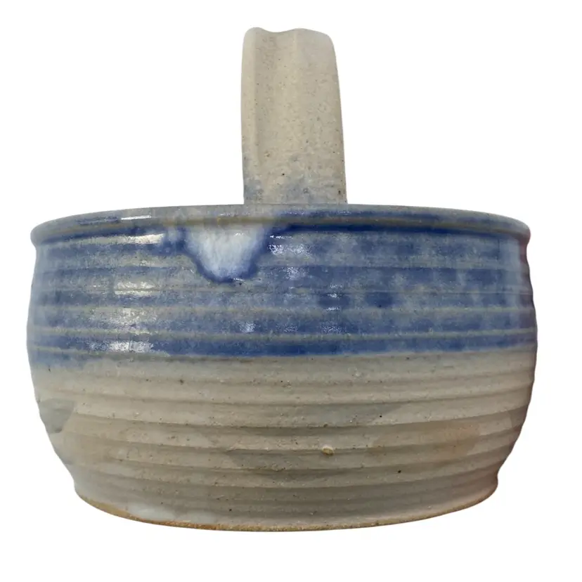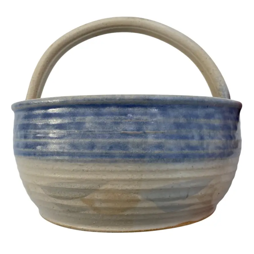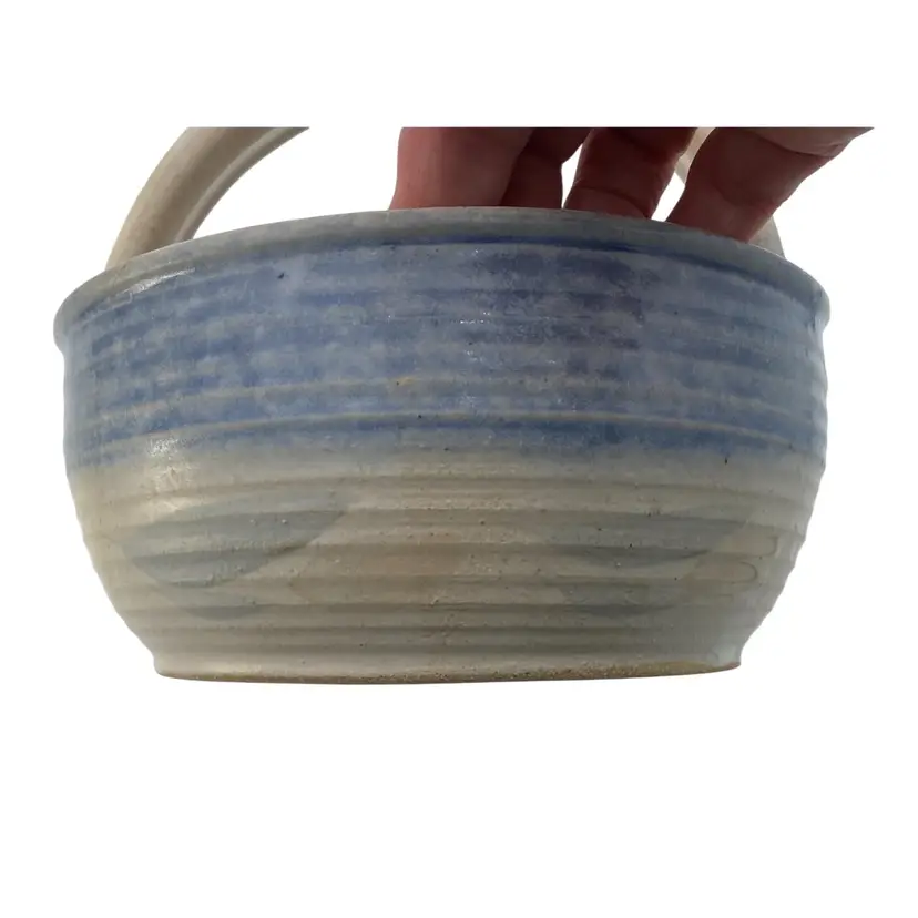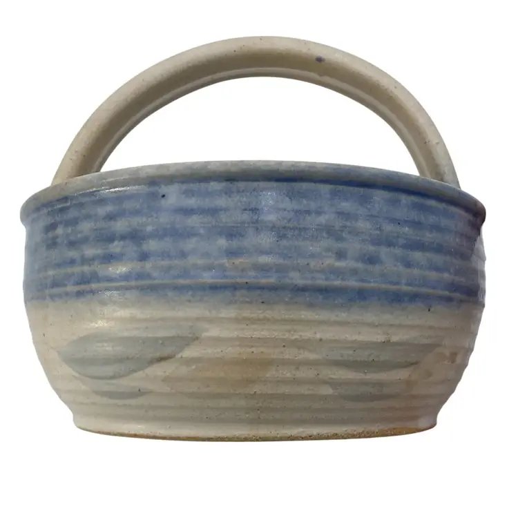 This unique hand-thrown pottery basket is a beautiful addition to any home decor. The round shape and stone and blue color combination make it a lovely neutral piece. The basket measures 6.2 inches in diameter and 5.9 inches in height, with a width of 6.2 inches and a weight of 1 pound and 9.5 ounces. Crafted by hand with high-quality clay/stoneware, this decorative basket is an original piece that will add a touch of arts & crafts style to your home. The blue band and leaves design adds a soft highlight of color, with a matte finish with glossy light tan leaves. The artist's signature is written in the base. This basket is perfect for decorative purposes or for holding small items.